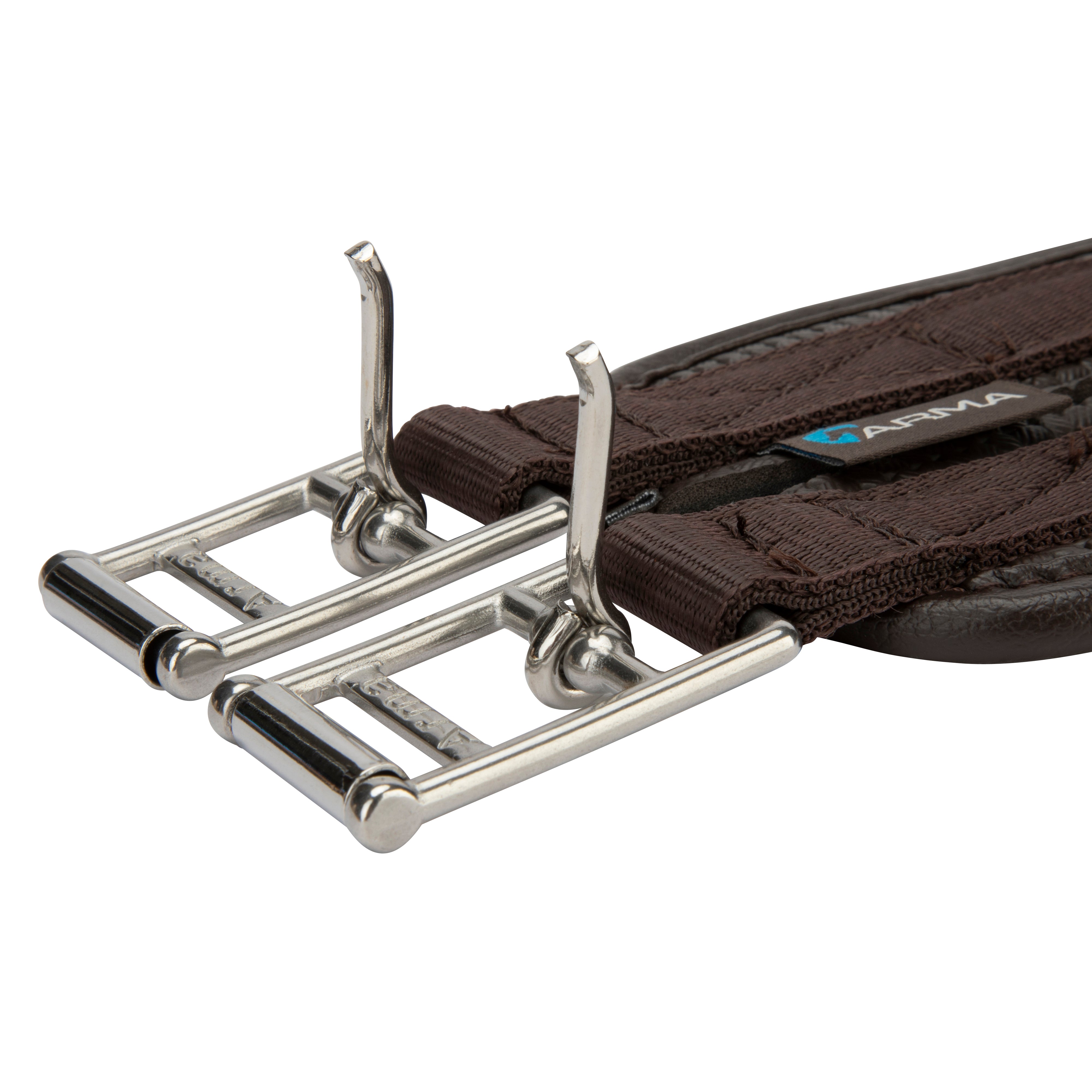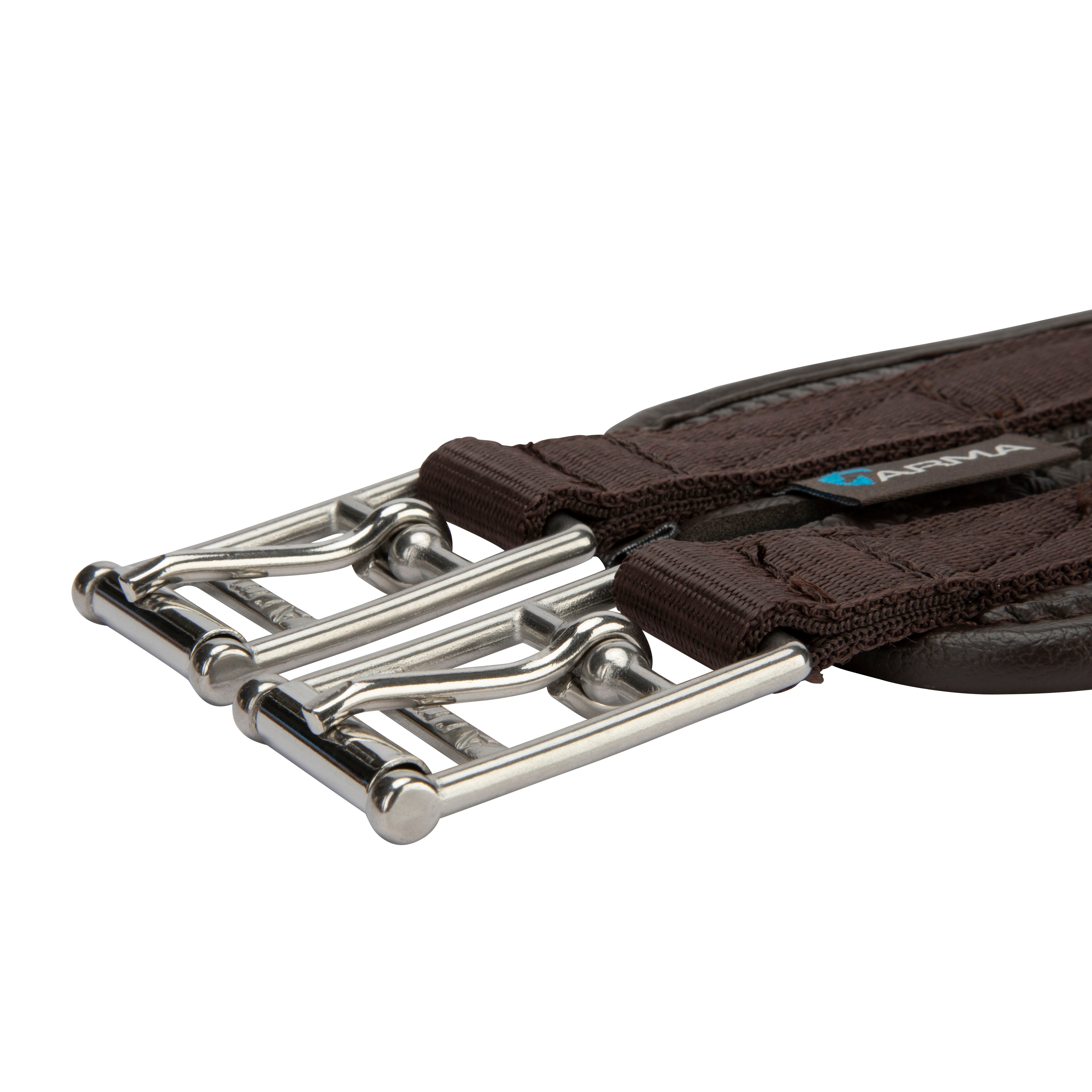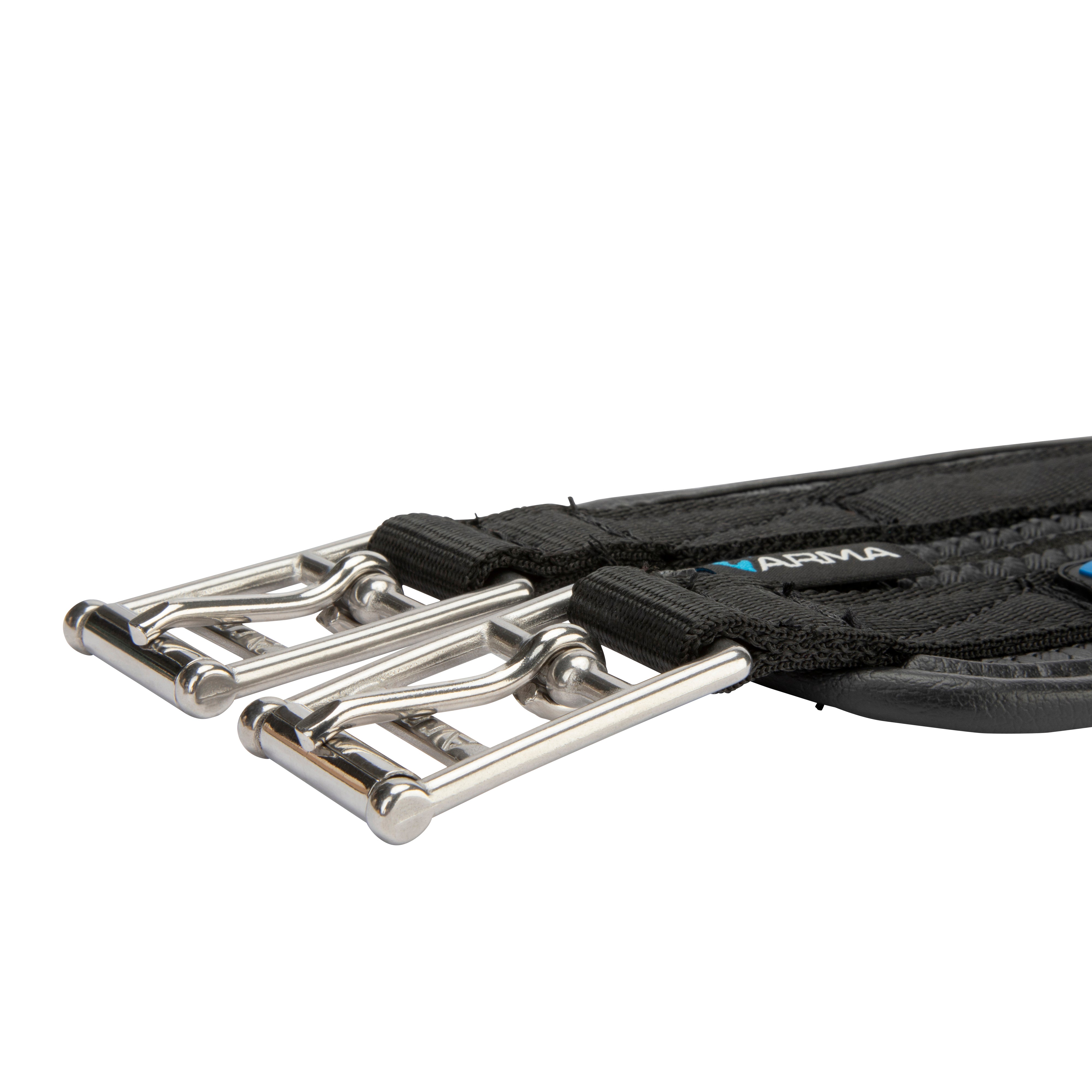 Shaped to provide enhanced comfort for the horse, the ARMA anti-chafe anatomical girth is responsive and anti-rub for comfort. The anatomical shape is cut back at the elbow to allow freedom through the shoulder. The large surface area of the girth ensures pressure is spread evenly across the chest muscles which can allow the horse to move more freely and with greater comfort. Durable waffle material resists moisture build up to protect against rubbing and galls. The textured surface reduces friction allowing the girth to glide smoothly and allows airflow to help control excessive sweat build up. Moisture resistant fabric stays soft and flexible. Flexible, stretch resistant and wipe clean, reinforced w ith non-stretch nylon webbing. Stainless steel roller buckles and fittings for long lasting performance.