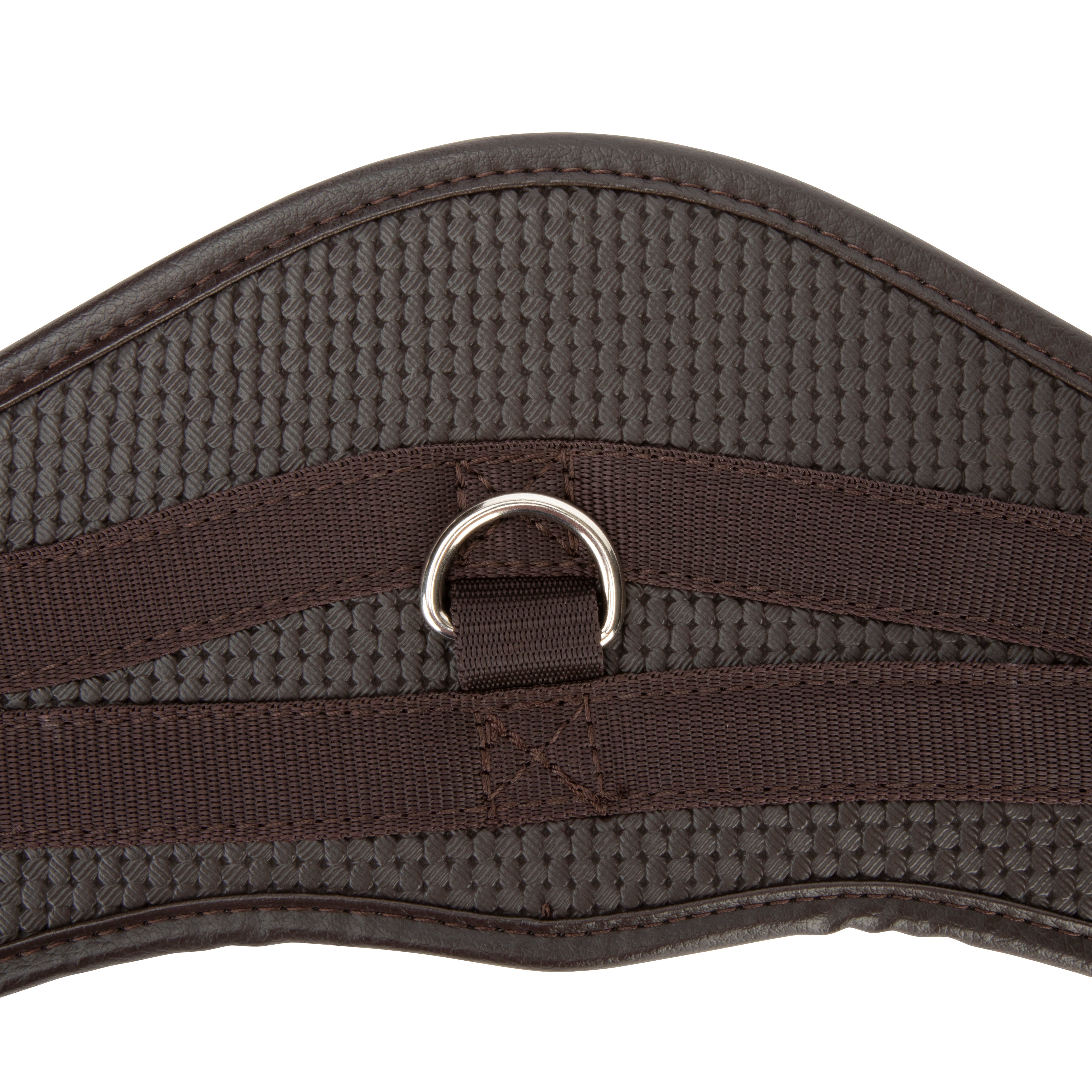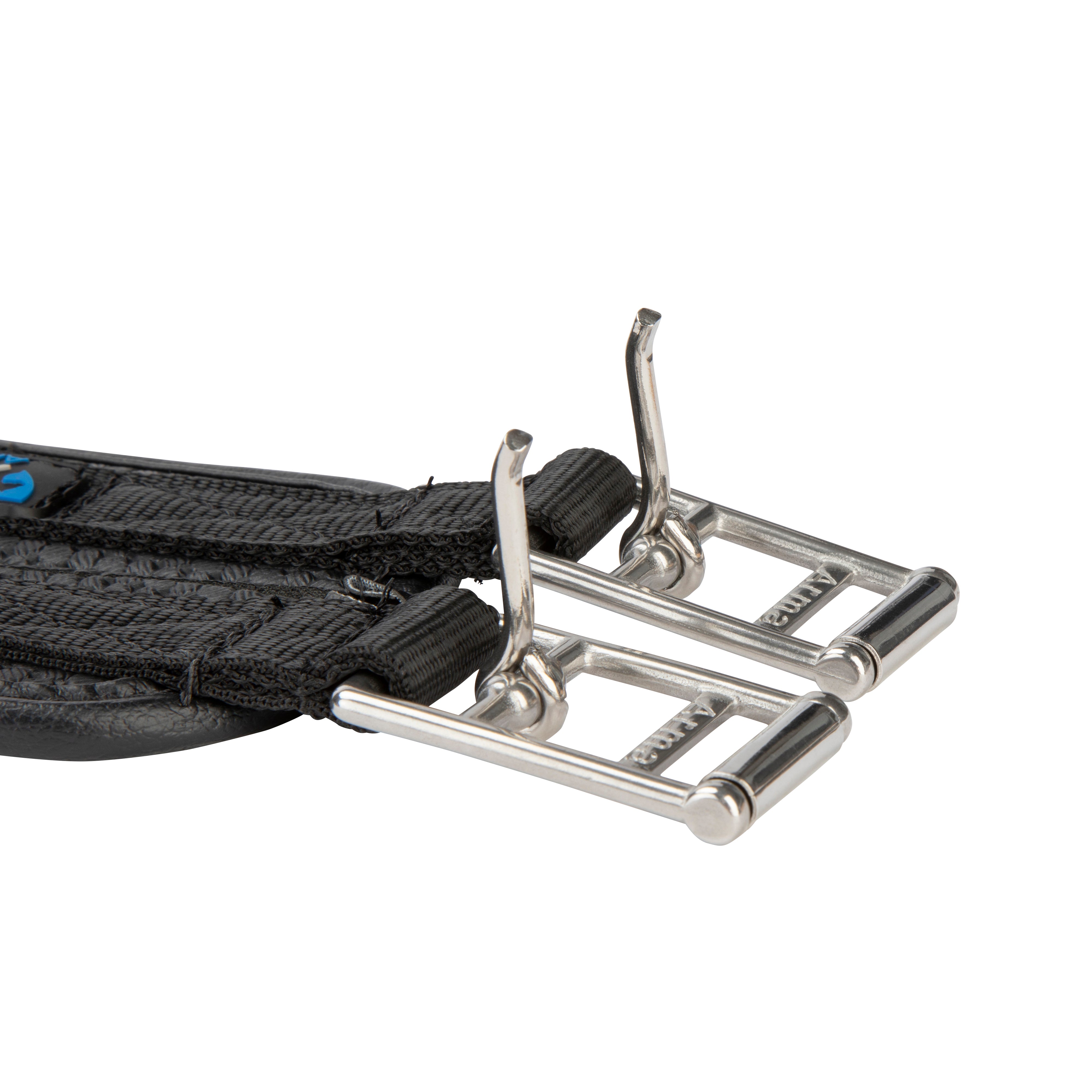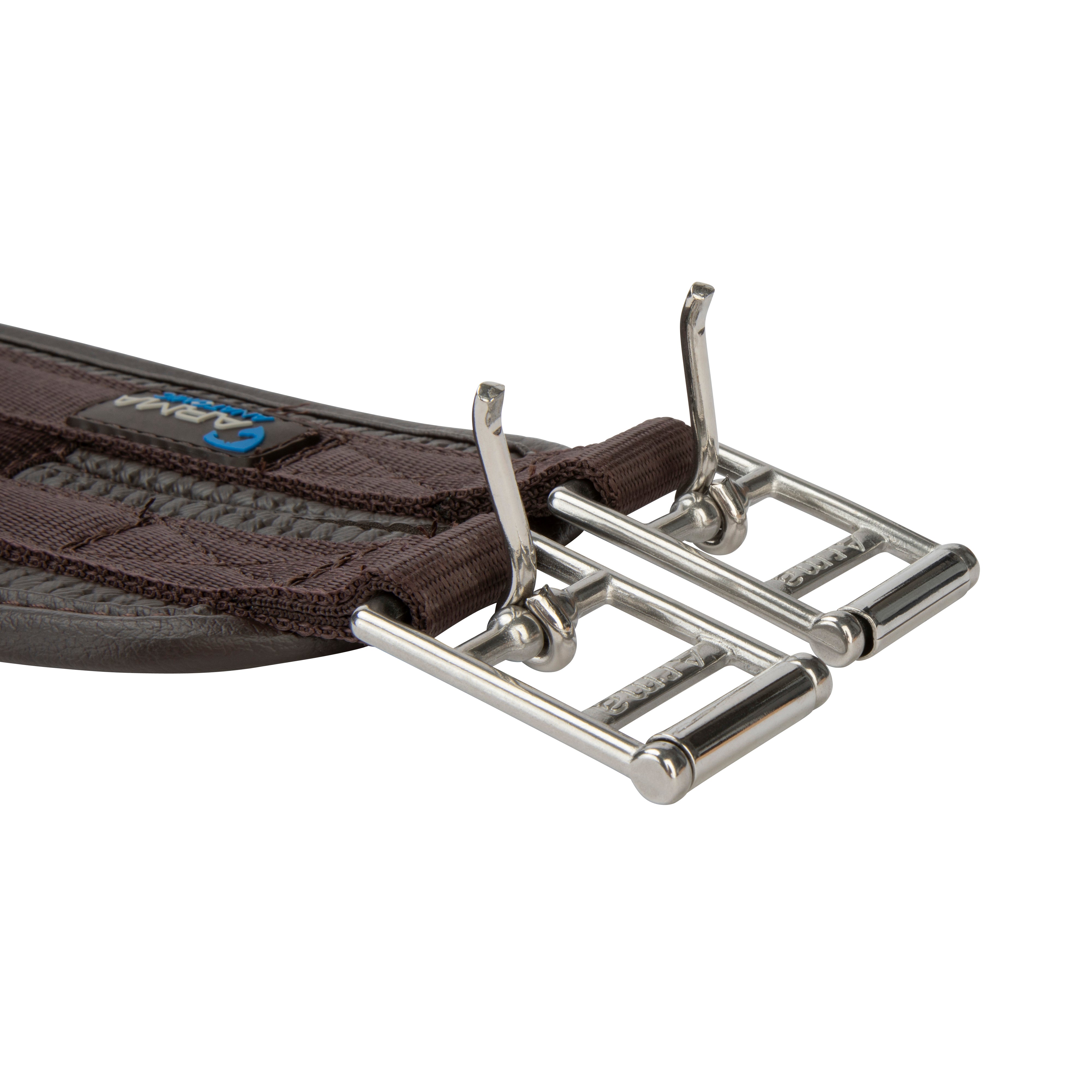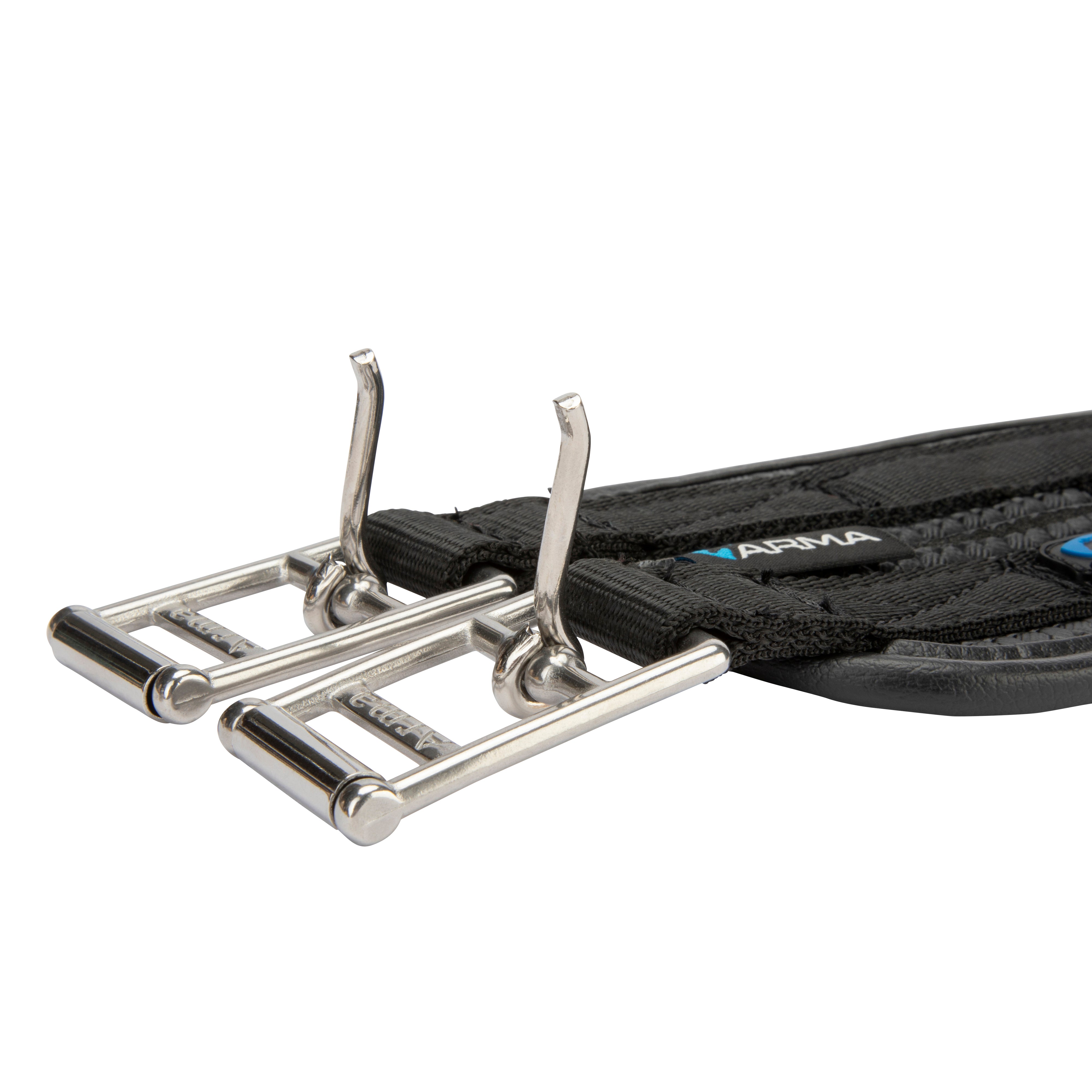 Shaped to provide enhanced comfort for the horse, the ARMA anti-chafe anatomical girth is responsive and anti-rub for comfort. The anatomical shape is cut back at the elbow to allow freedom through the shoulder. The large surface area of the girth ensures pressure is spread evenly across the chest muscles which can allow the horse to move more freely and with greater comfort. Durable waffle material resists moisture build up to protect against rubbing and galls. The textured surface reduces friction allowing the girth to glide smoothly and allows airflow to help control excessive sweat build up. Moisture resistant fabric stays soft and flexible. Flexible, stretch resistant and wipe clean, reinforced w ith non-stretch nylon webbing. Stainless steel roller buckles and fittings for long lasting performance.
