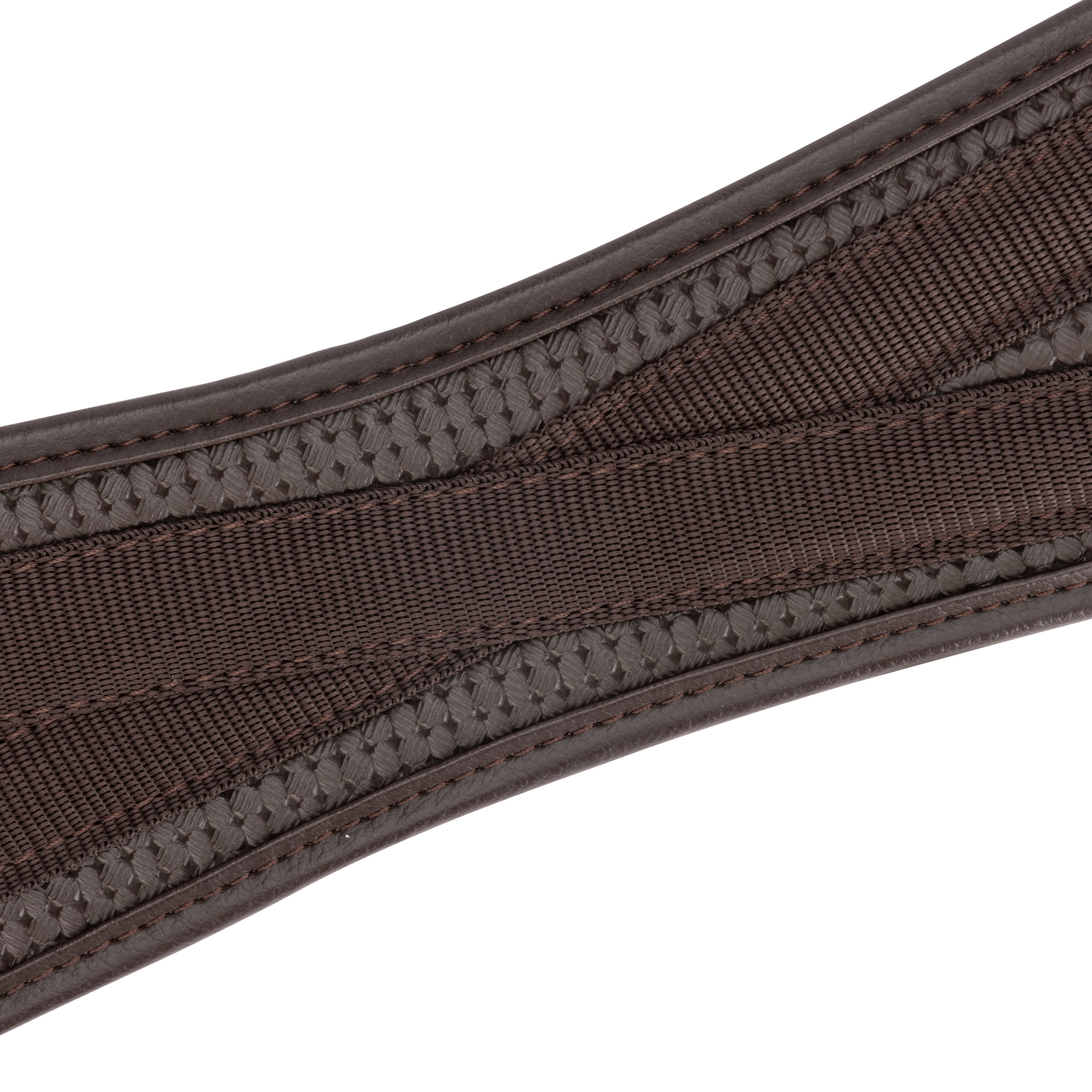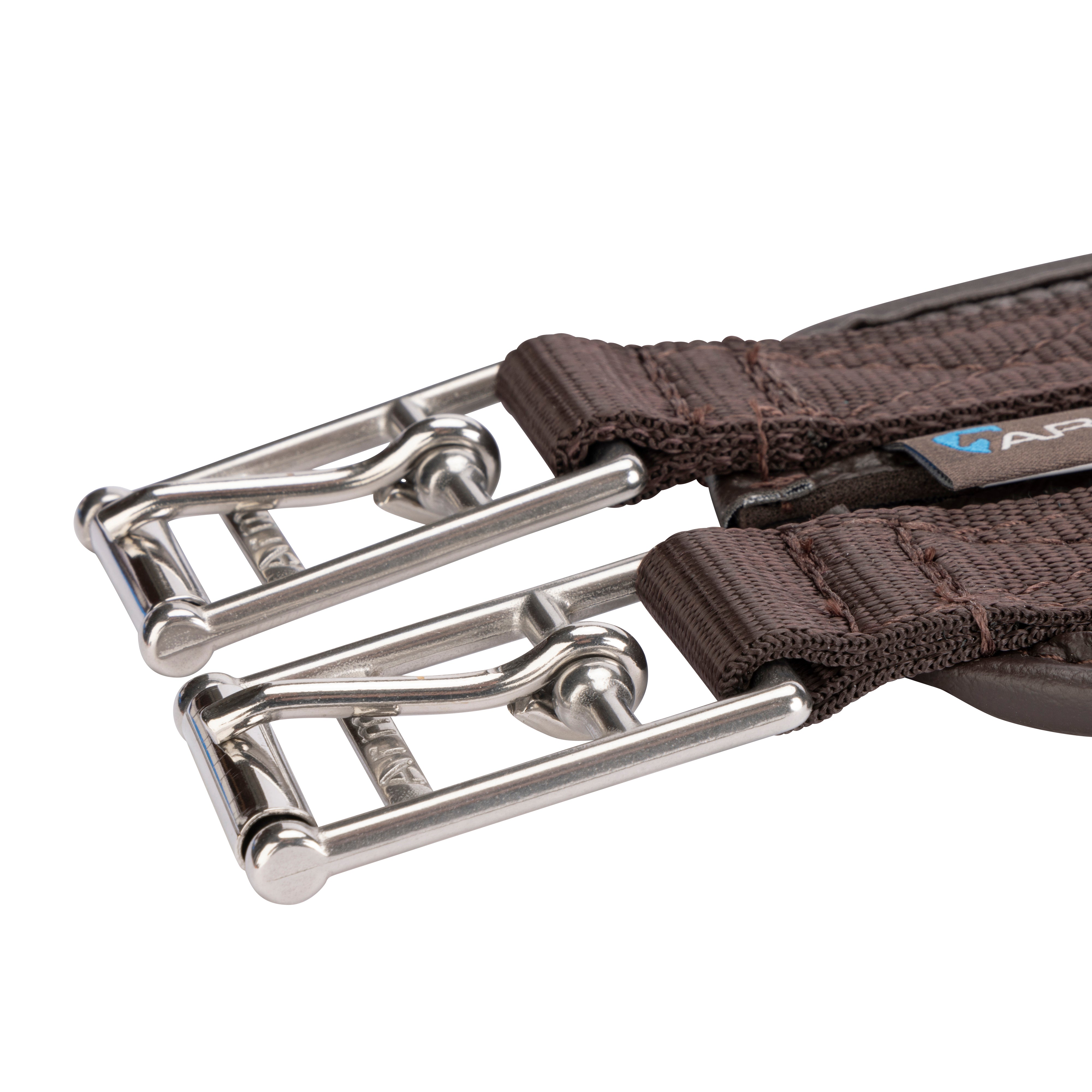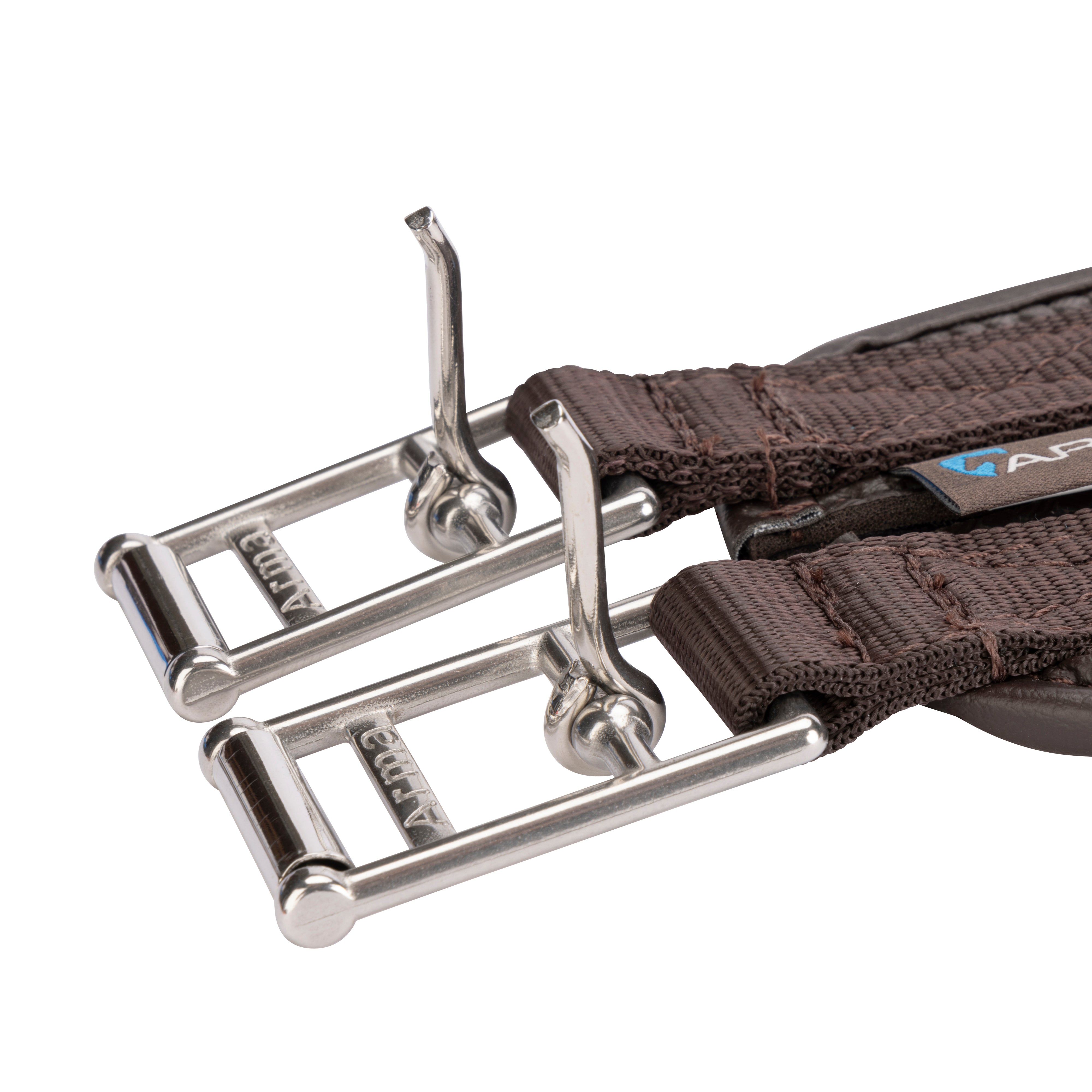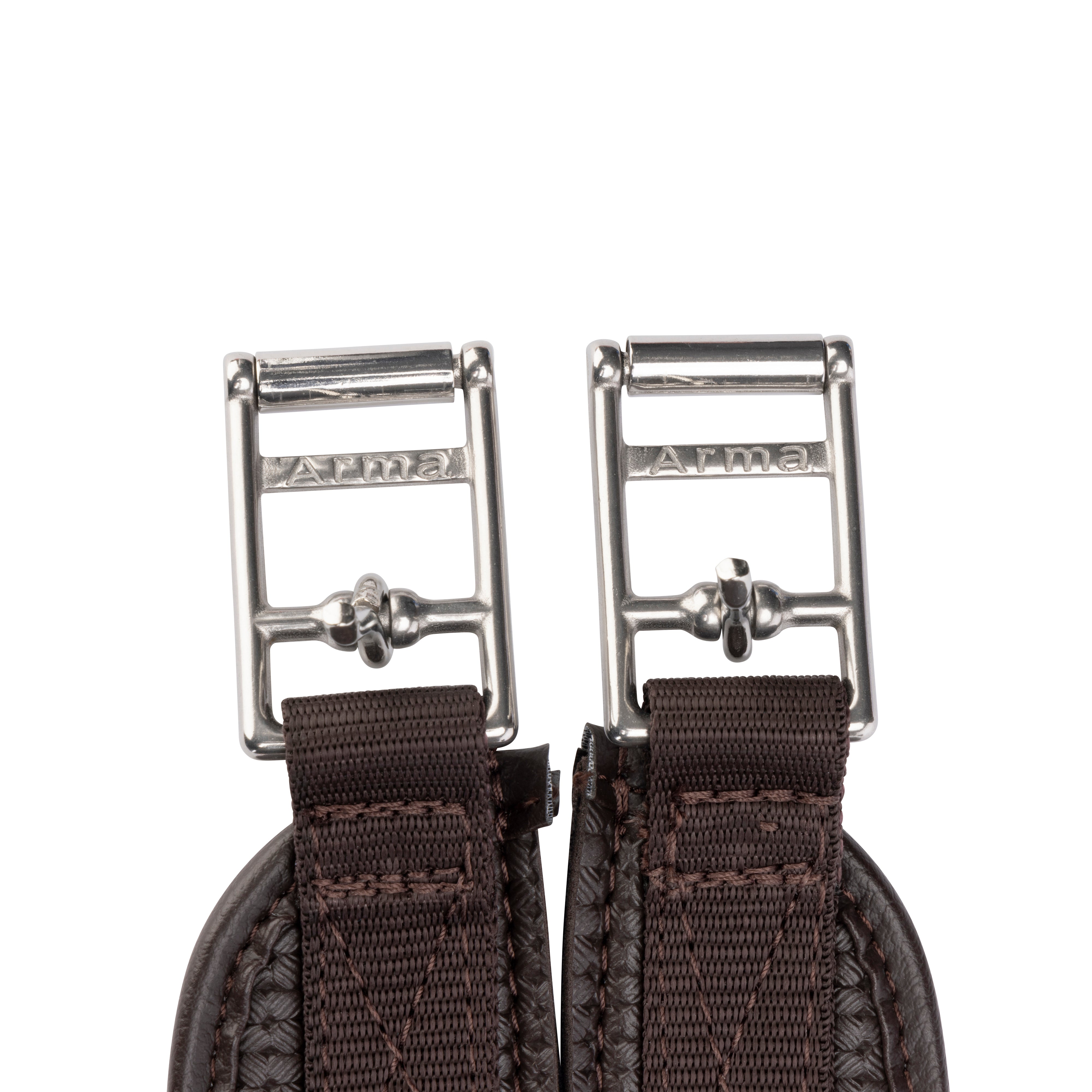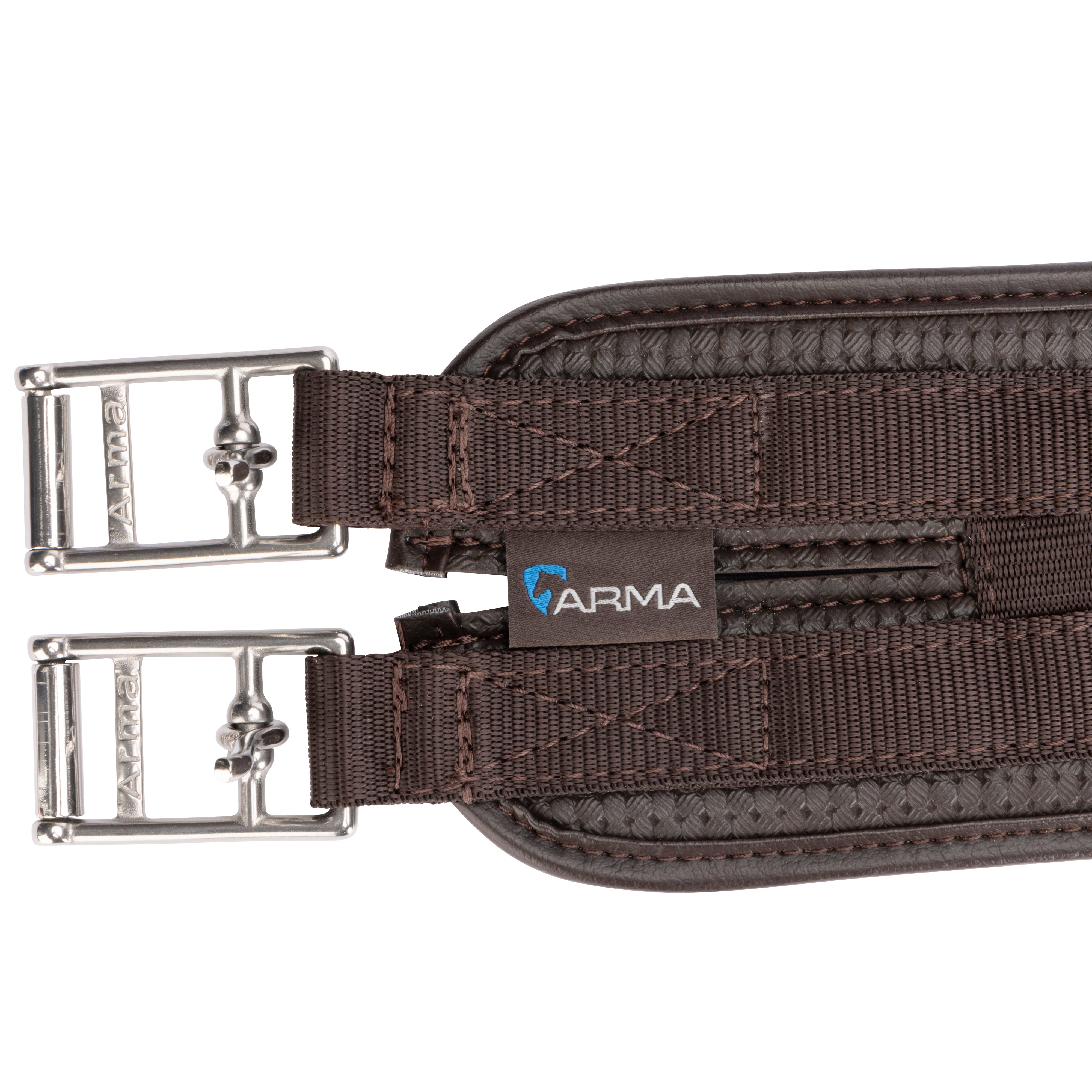The ARMA anti-chafe contour girth is made from durable waffle material that resists moisture build up to protect against chafing. The textured surface reduces friction allowing the girth to glide smoothly and allows airflow to help control excessive sweat build up. Moisture resistant fabric stays soft and flexible. Anatomic contour shaping allows greater freedom of movement behind the elbows and helps distribute pressure. Flexible, stretch resistant and wipe clean, reinforced with non-stretch nylon webbing. Pressure alleviating elastic inserts at both ends. Stainless steel roller buckles and fittings for long lasting performance.