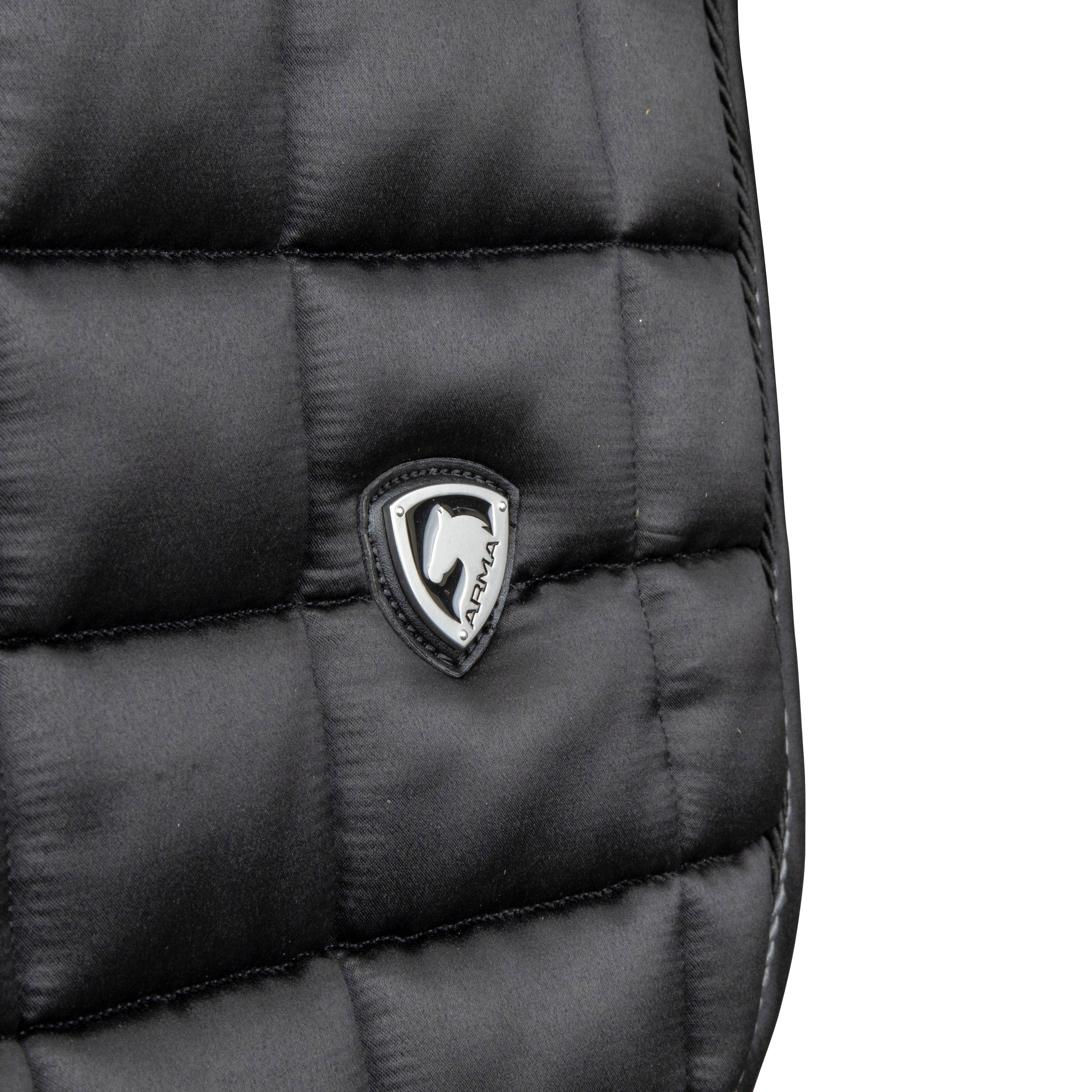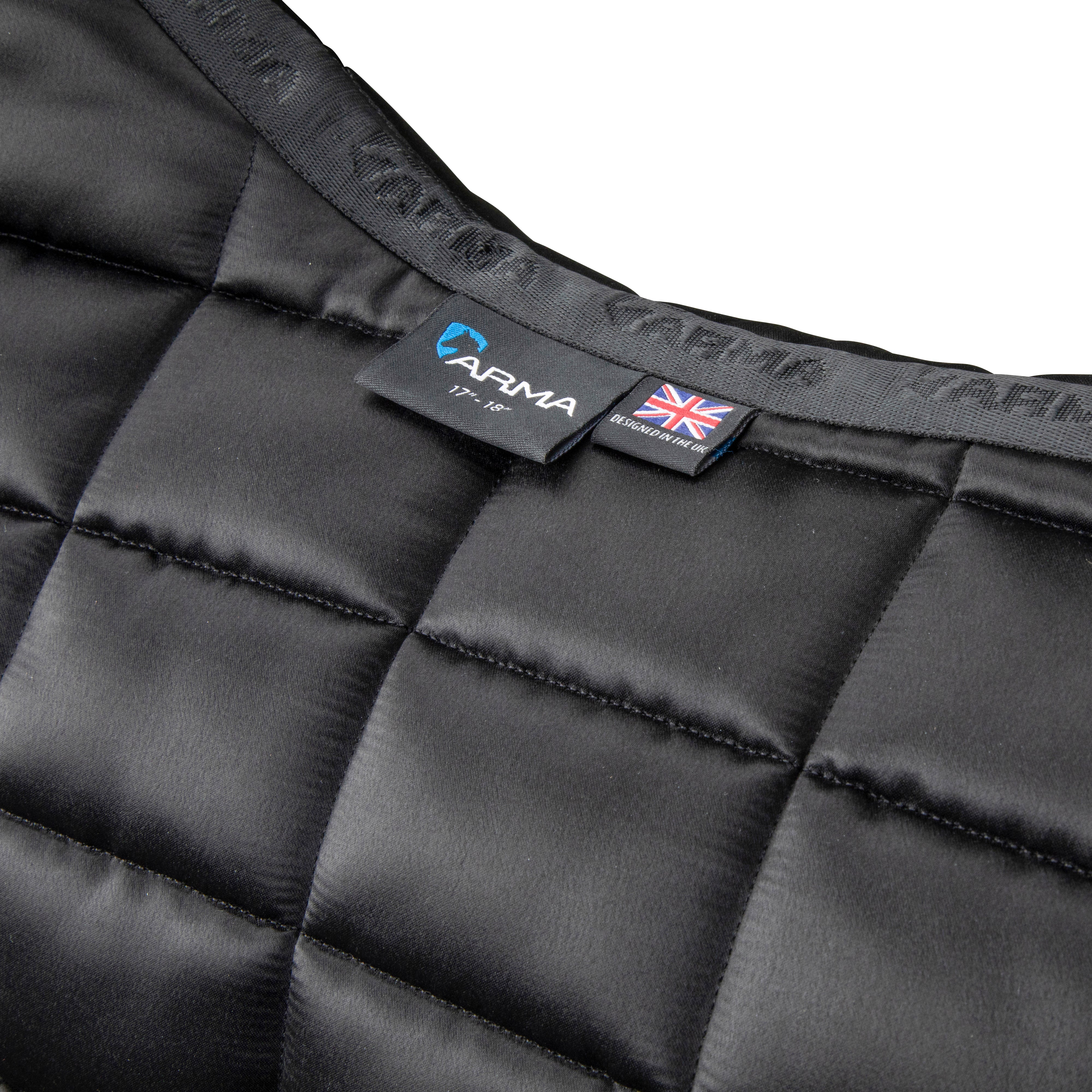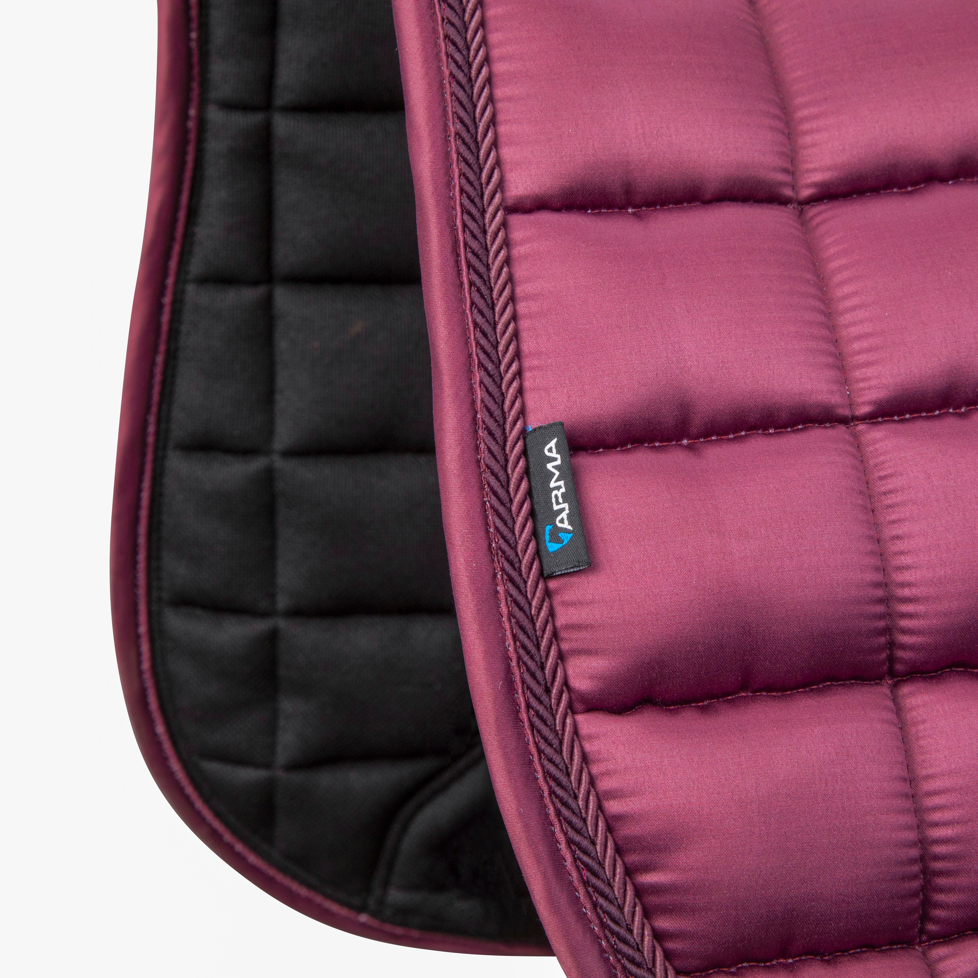 Make a bold statement with the Eltar dressage saddlecloth. Rectangular shaped deep quilting adds a luxurious feel. Bright colour quality is enhanced with a satin finish and self-colour twisted twin trims. ULTRA DRI ZONE lining instantly wicks sweat from the horse to reduce the risk of rubbing and increase comfort. PU ARMA contour pro girth guard protects heavy wear areas. Jacquard logo tape looks smart at the spine, girth loops and elasticated D-ring straps. Finished with a metal logo badge. Machine washable. Coordinates with a range of ARMA horse and Aubrion rider pieces.