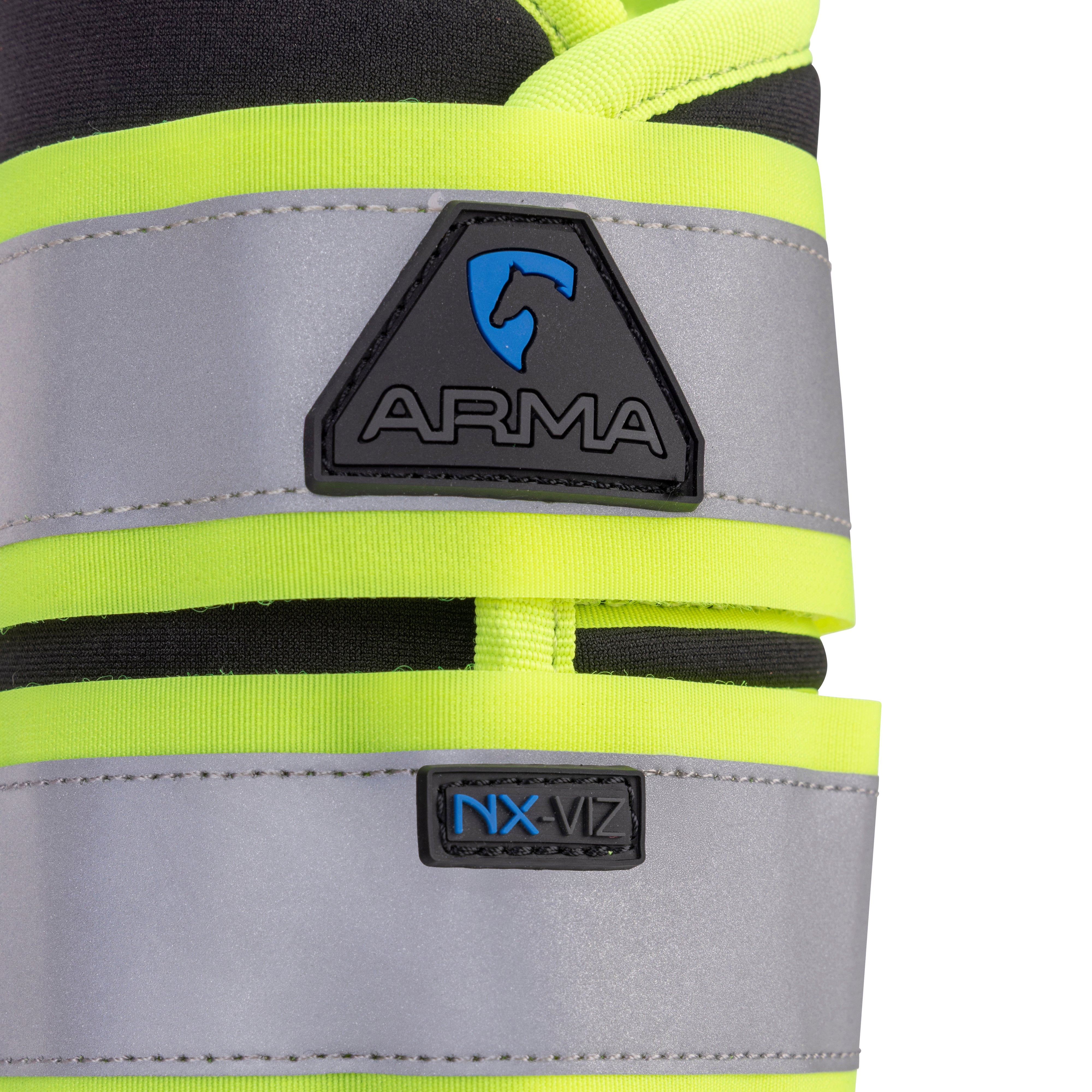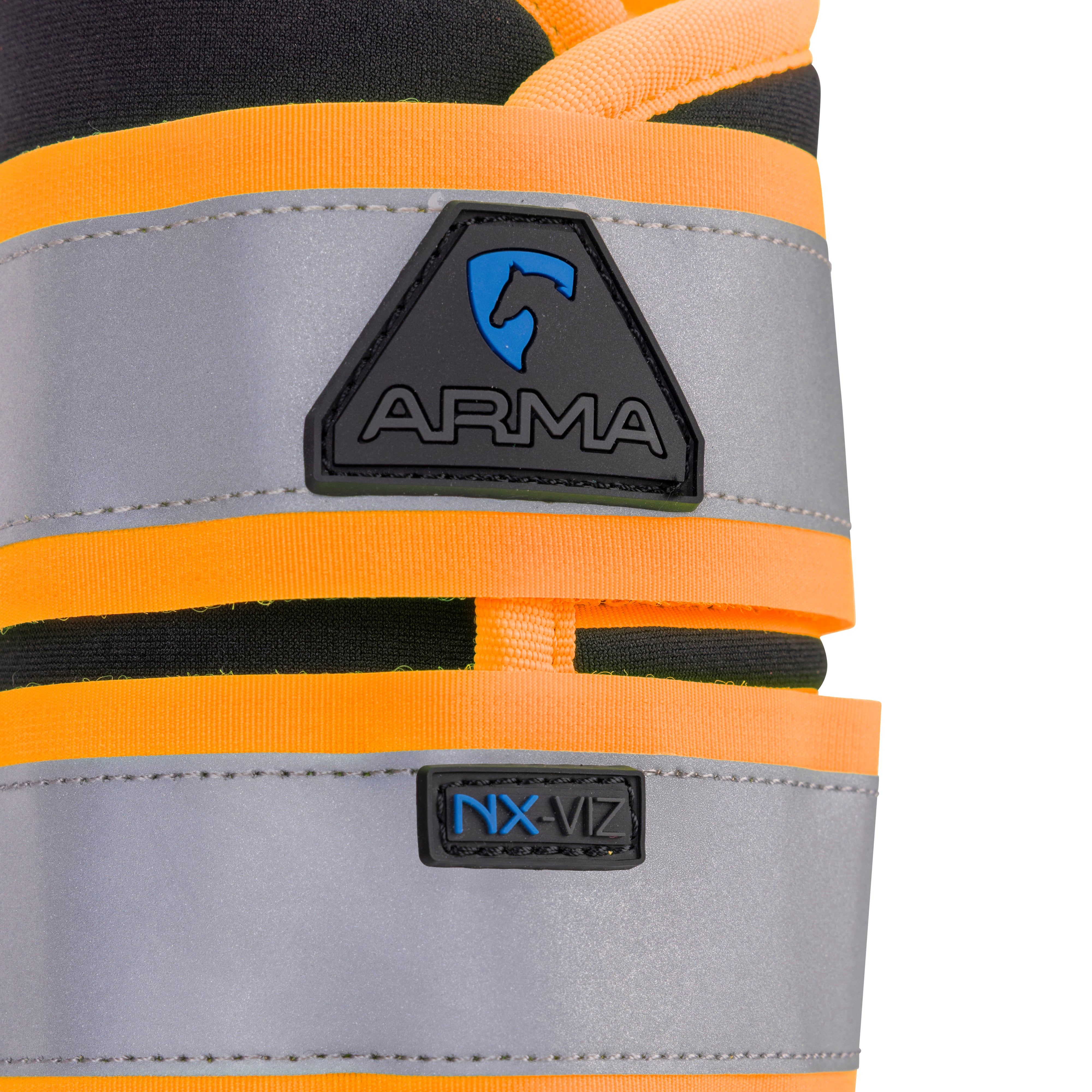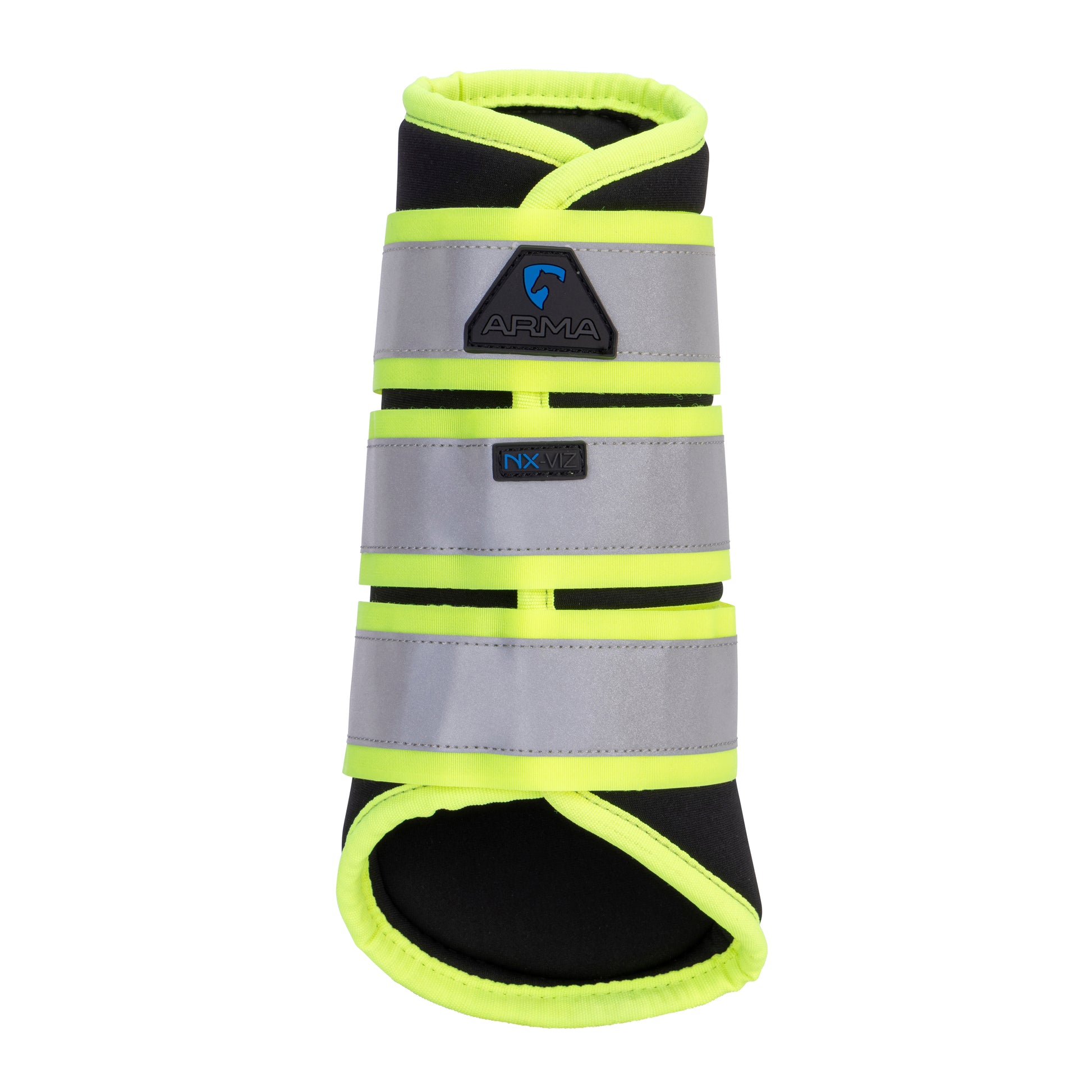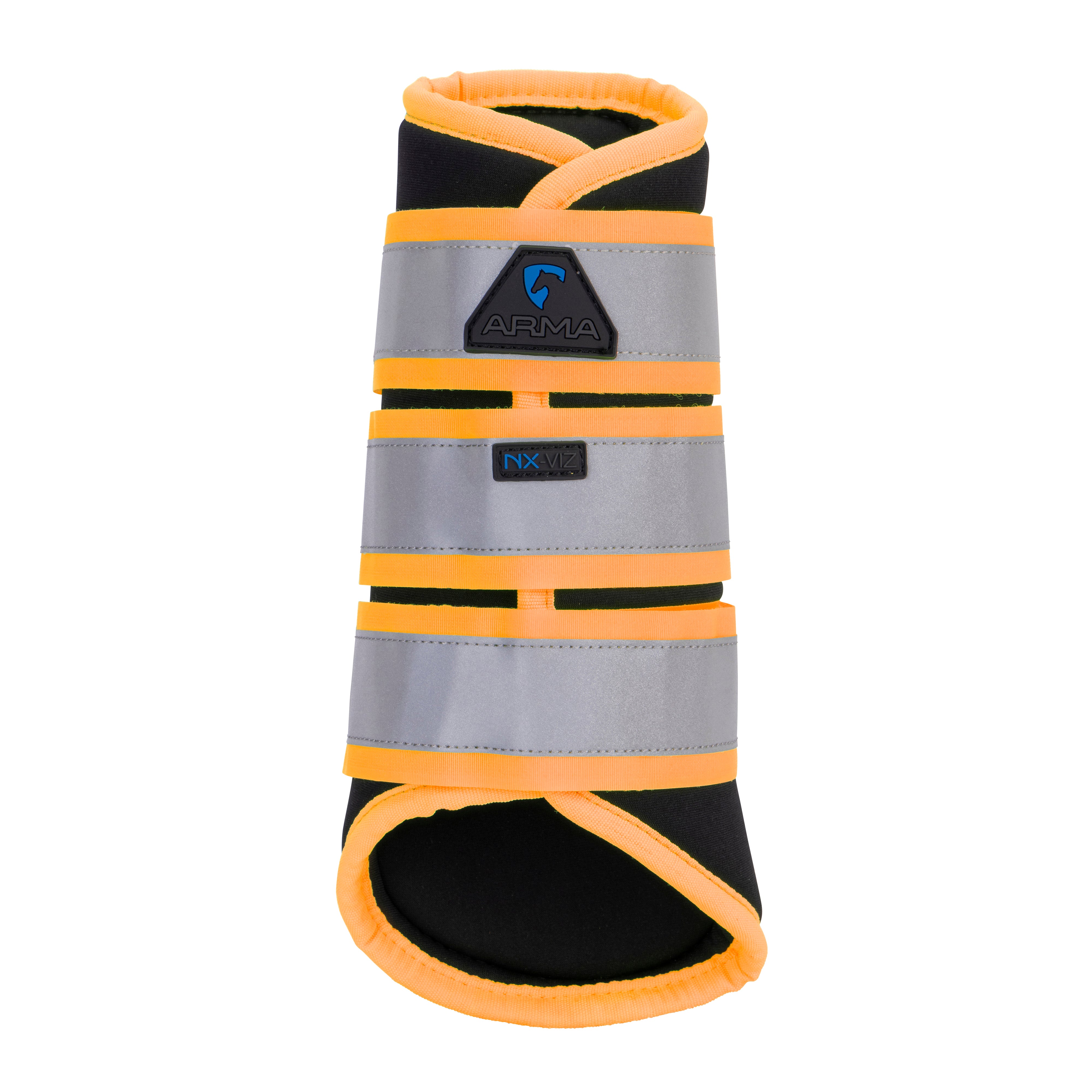 ARMA NX-VIZ neoprene brushing boots feature a dense, flexible outer which supports the leg and absorbs shocks. Bright colours are more visible from further away during daylight, in lower light conditions the boots have a bright reflect to keep rider and horse safer. Fabric covered for a smooth finish, the edges are bound for durability and comfort with recessed stitching to resist wear and tear. Tough moulded ARMA strike resistant pads defend the inner leg against knocks and brushing injuries. Reflective straps feature touch close fastening for adjustability and to secure the boots.