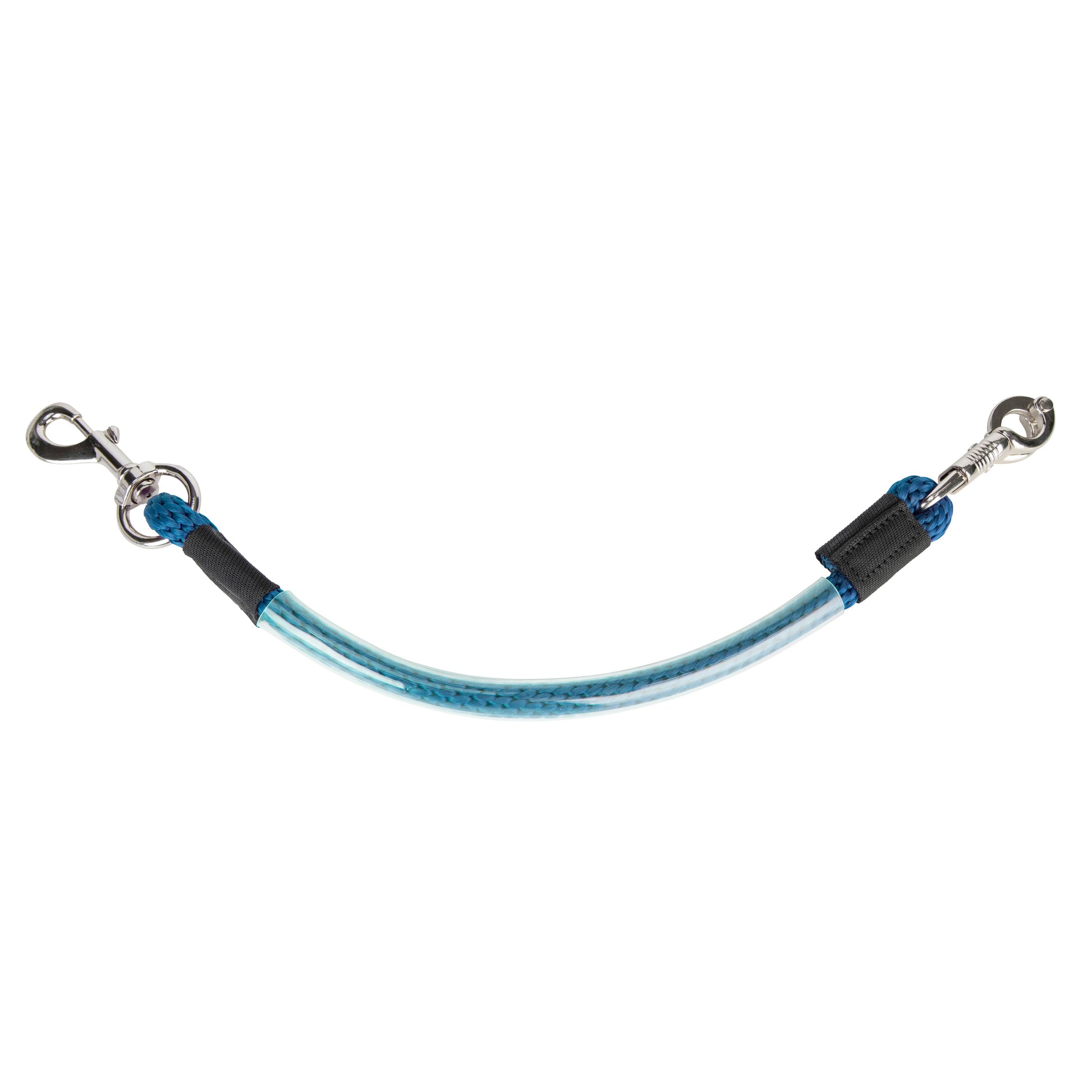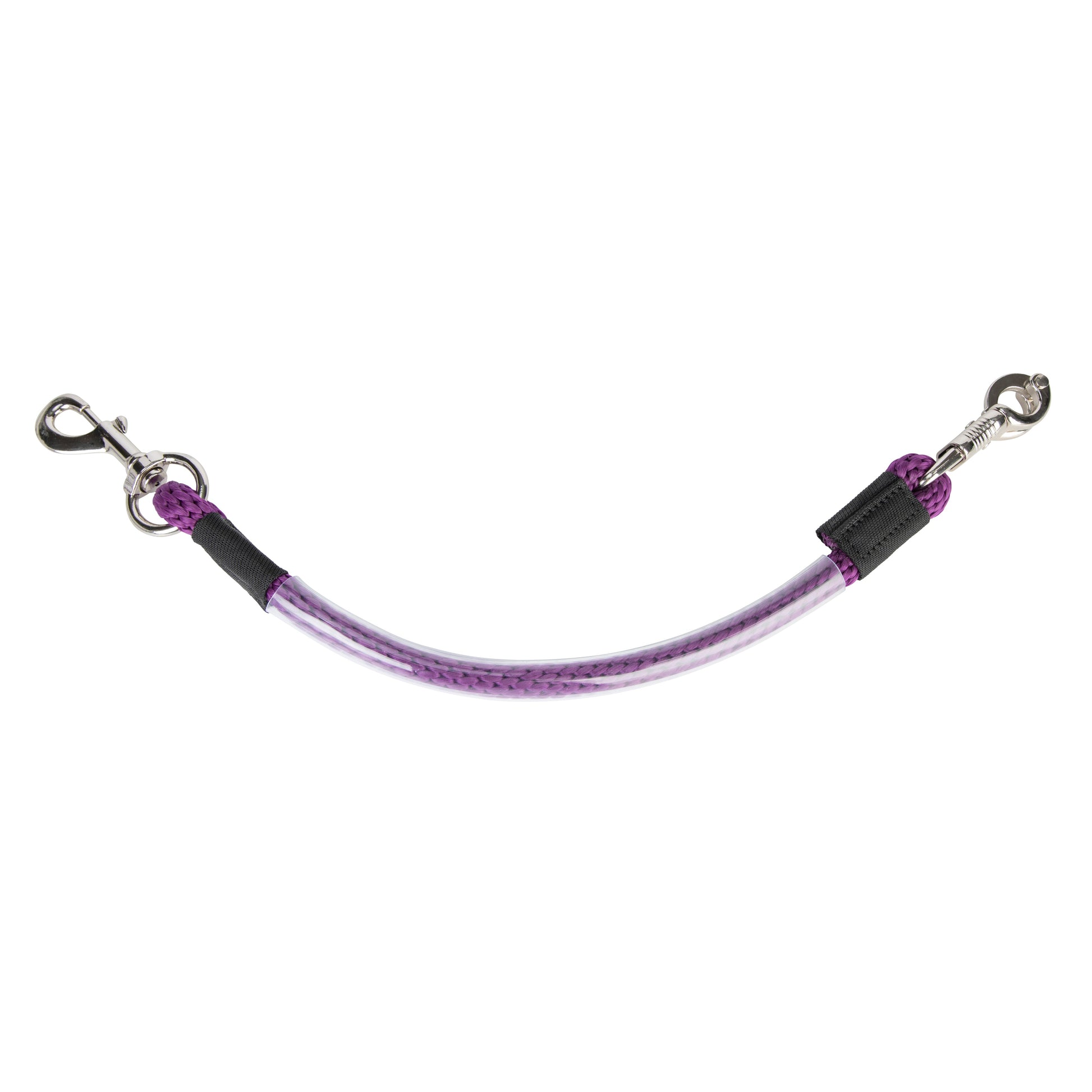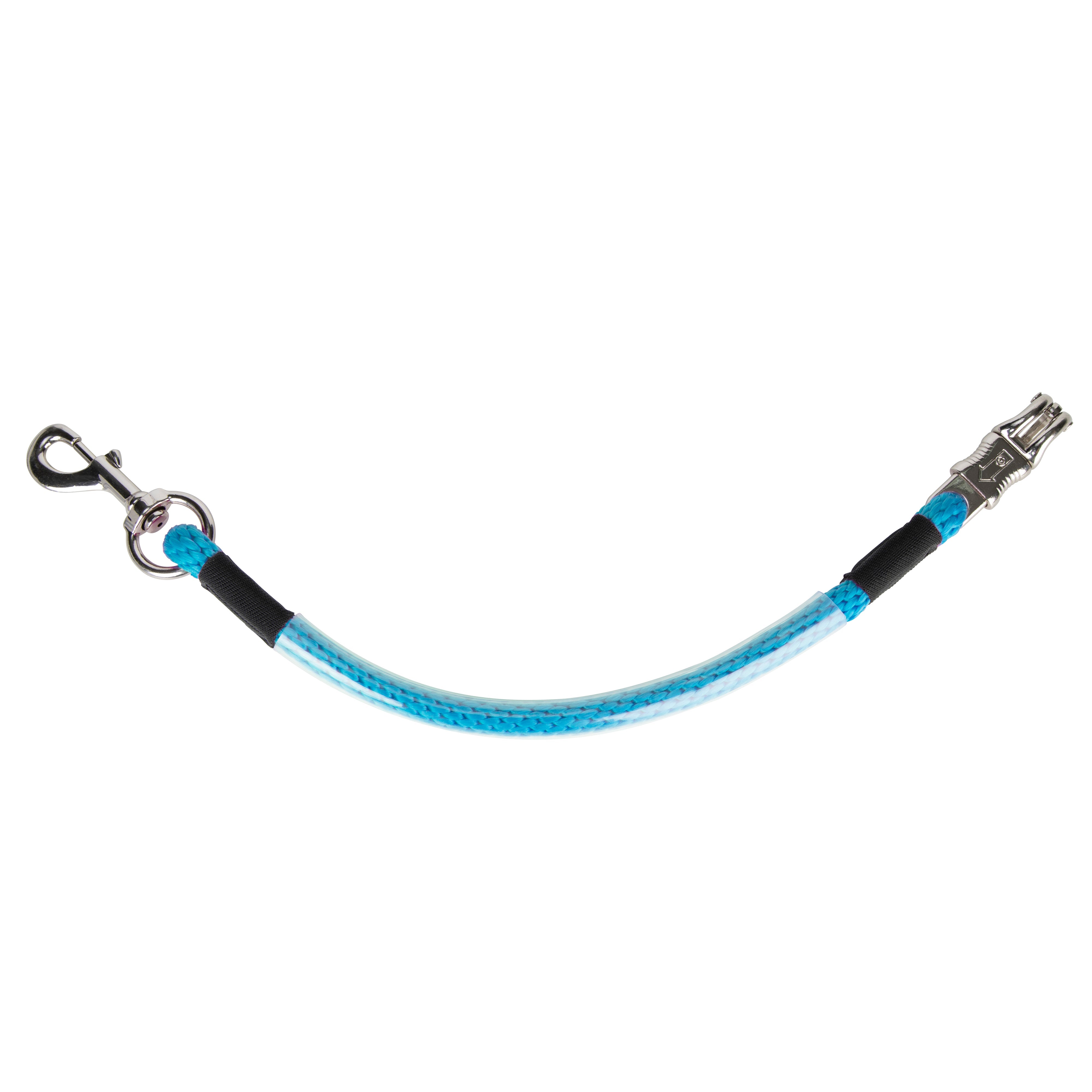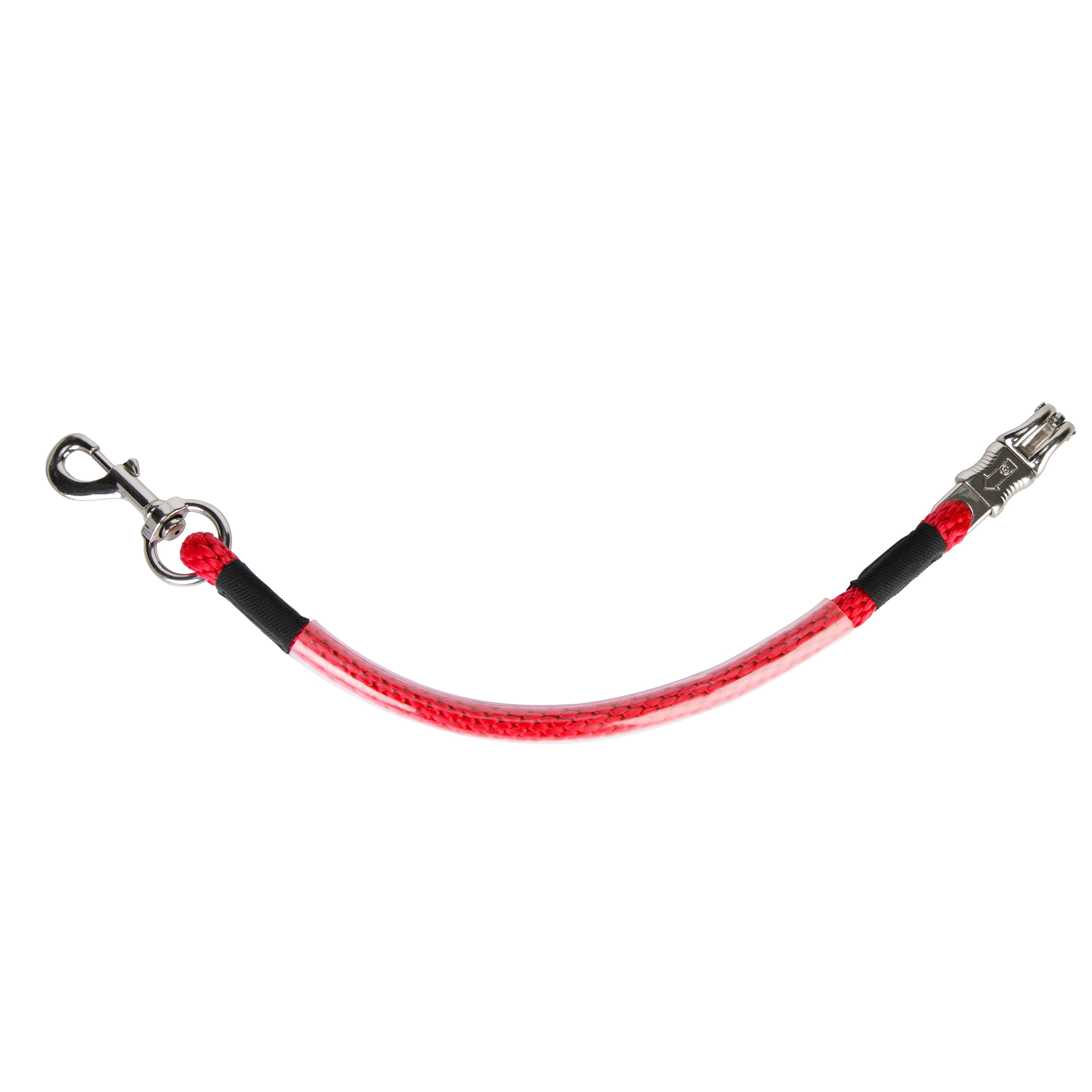 The heavy duty ARMA trailer tie quickly tethers the horse in the stable, yard or trailer, two can be used to safely cross tie a familiarised horse. The panic clip attaches to the headcollar and allows the handler to quickly intervene by pulling down on the clip and releasing the horse, reducing the risk of injury. The trigger clip end should be attached to a breakable loop, not directly to the tie ring. The robust cord is encased in a clear plastic tube to reduce wear and tear. Loops onto a tie ring. Ideal for the stable, yard or trailer. Total length 62cm.