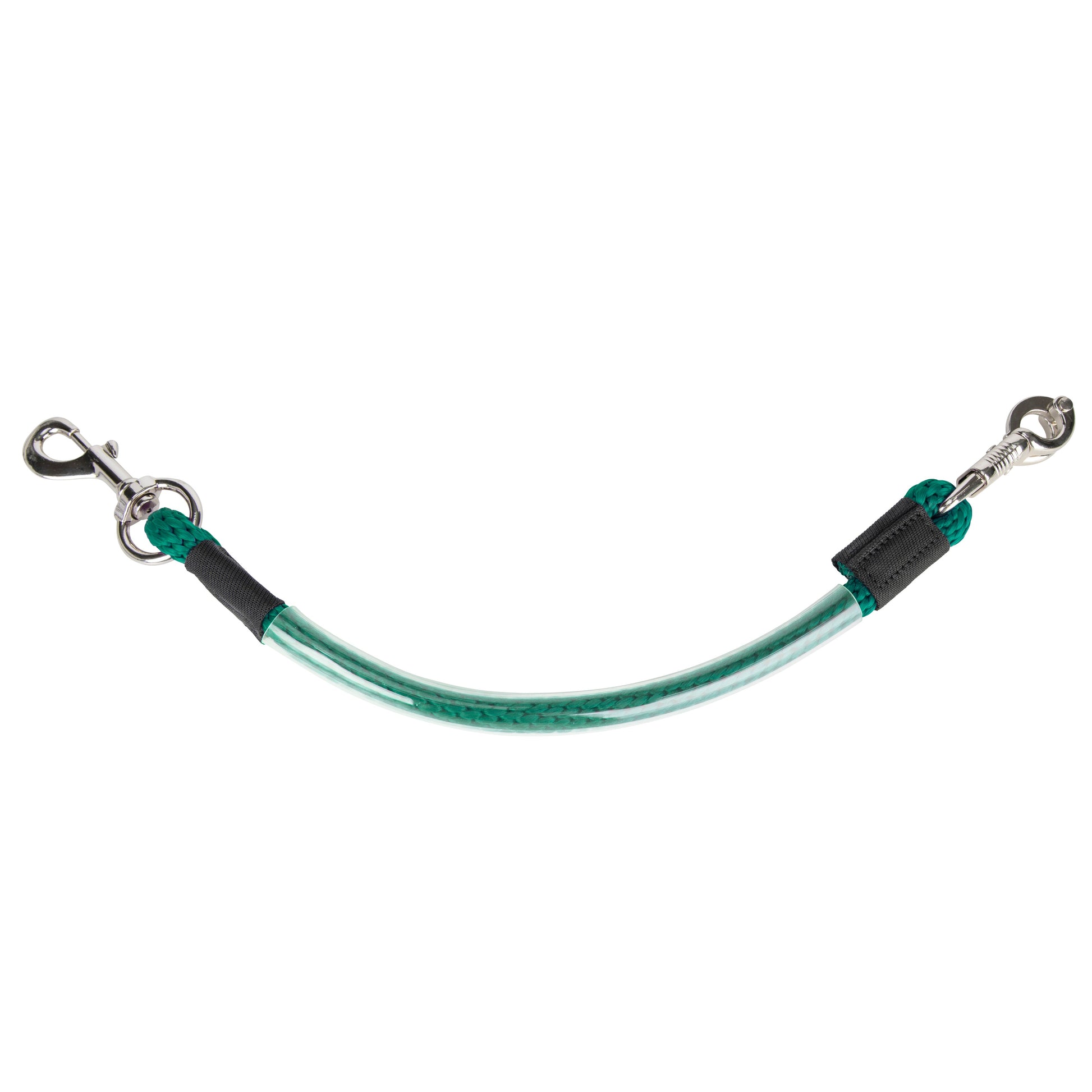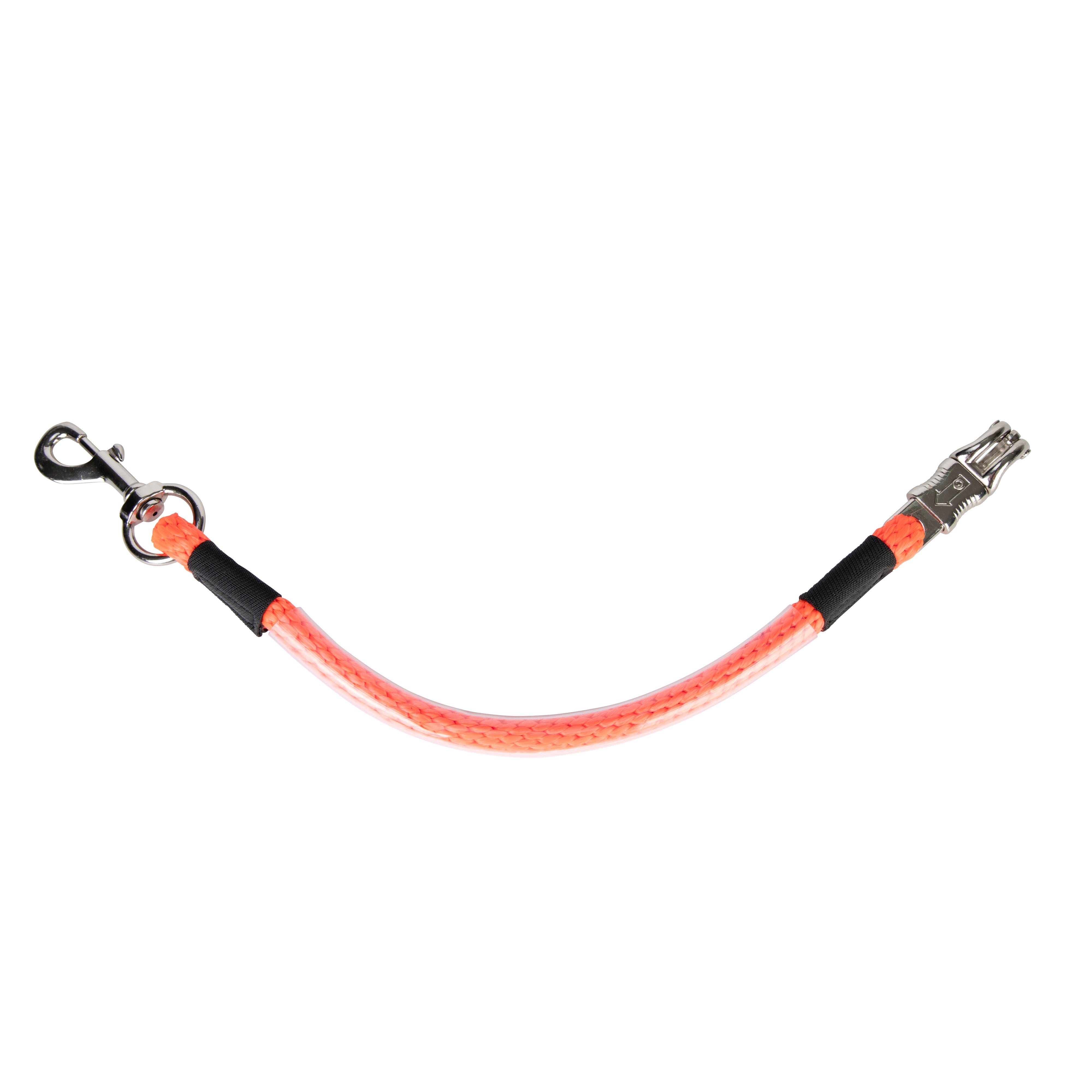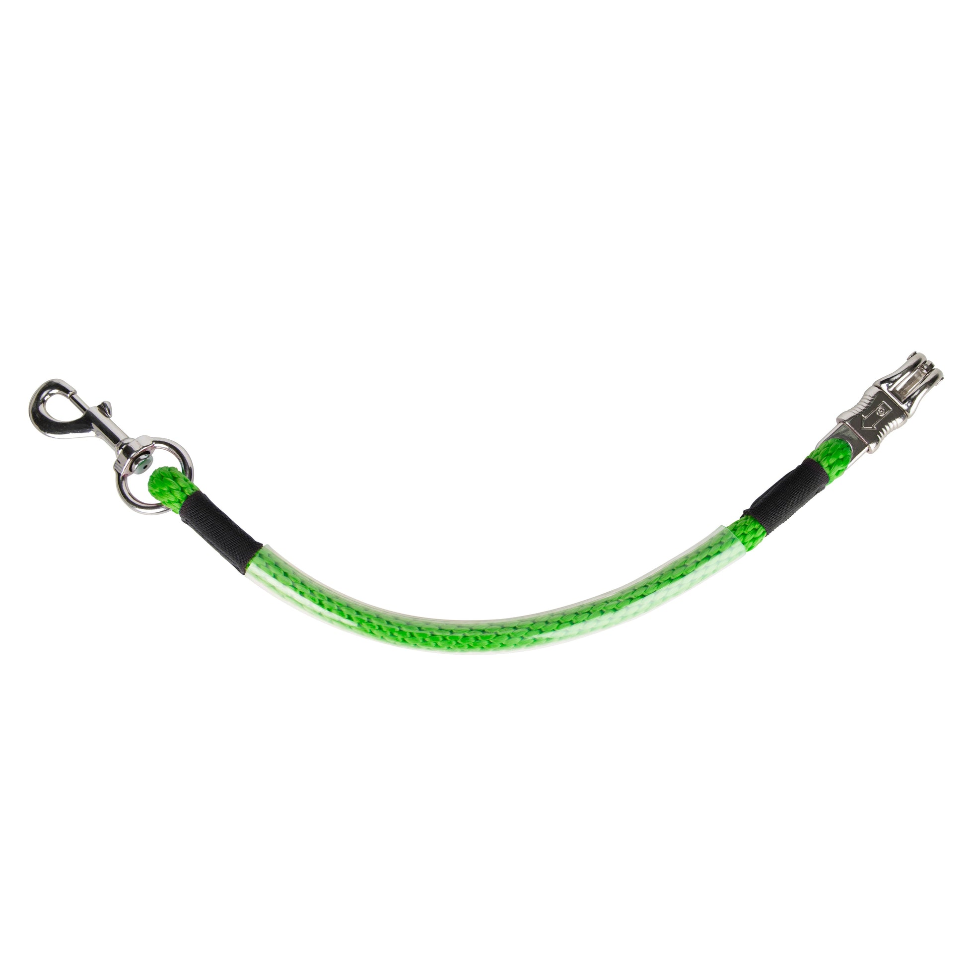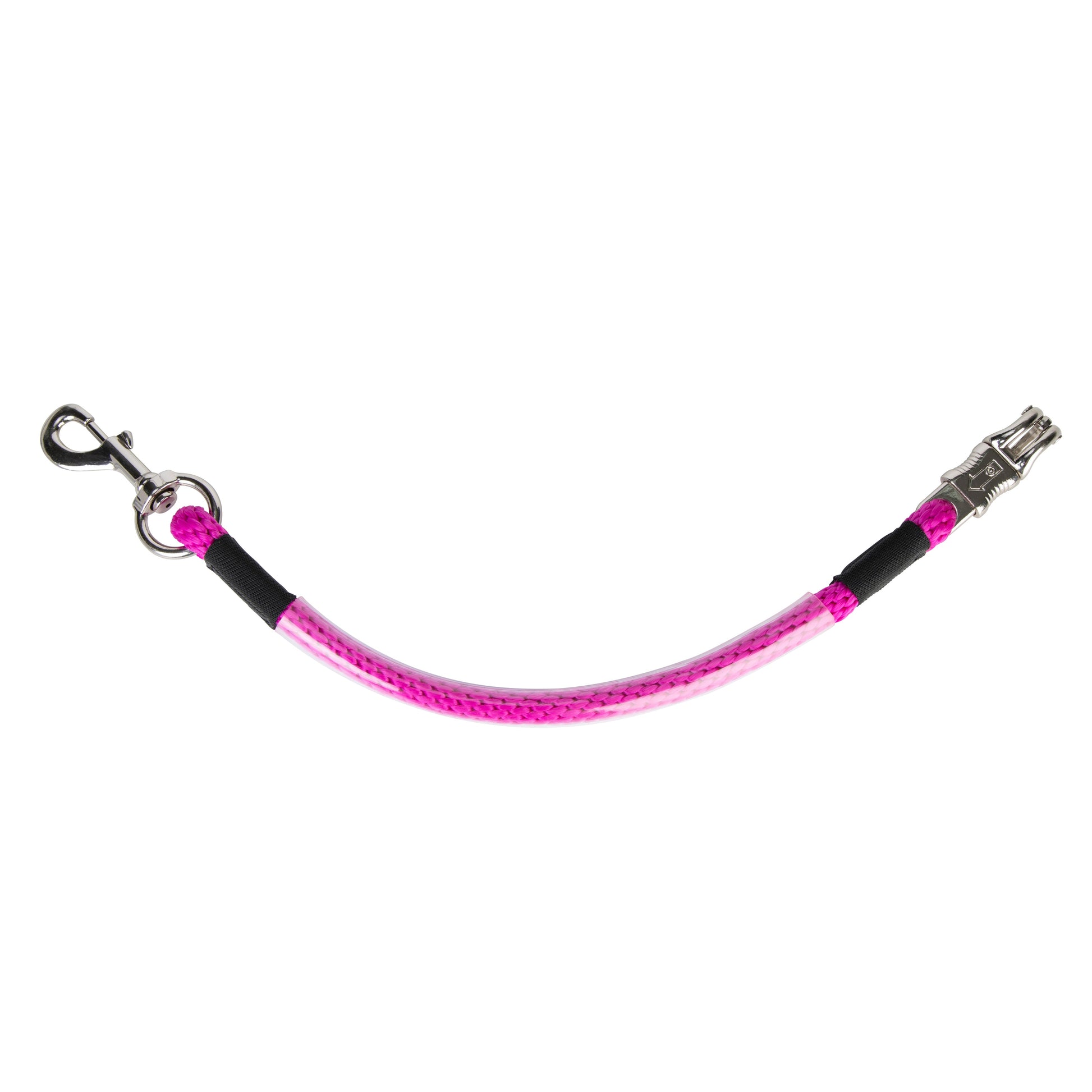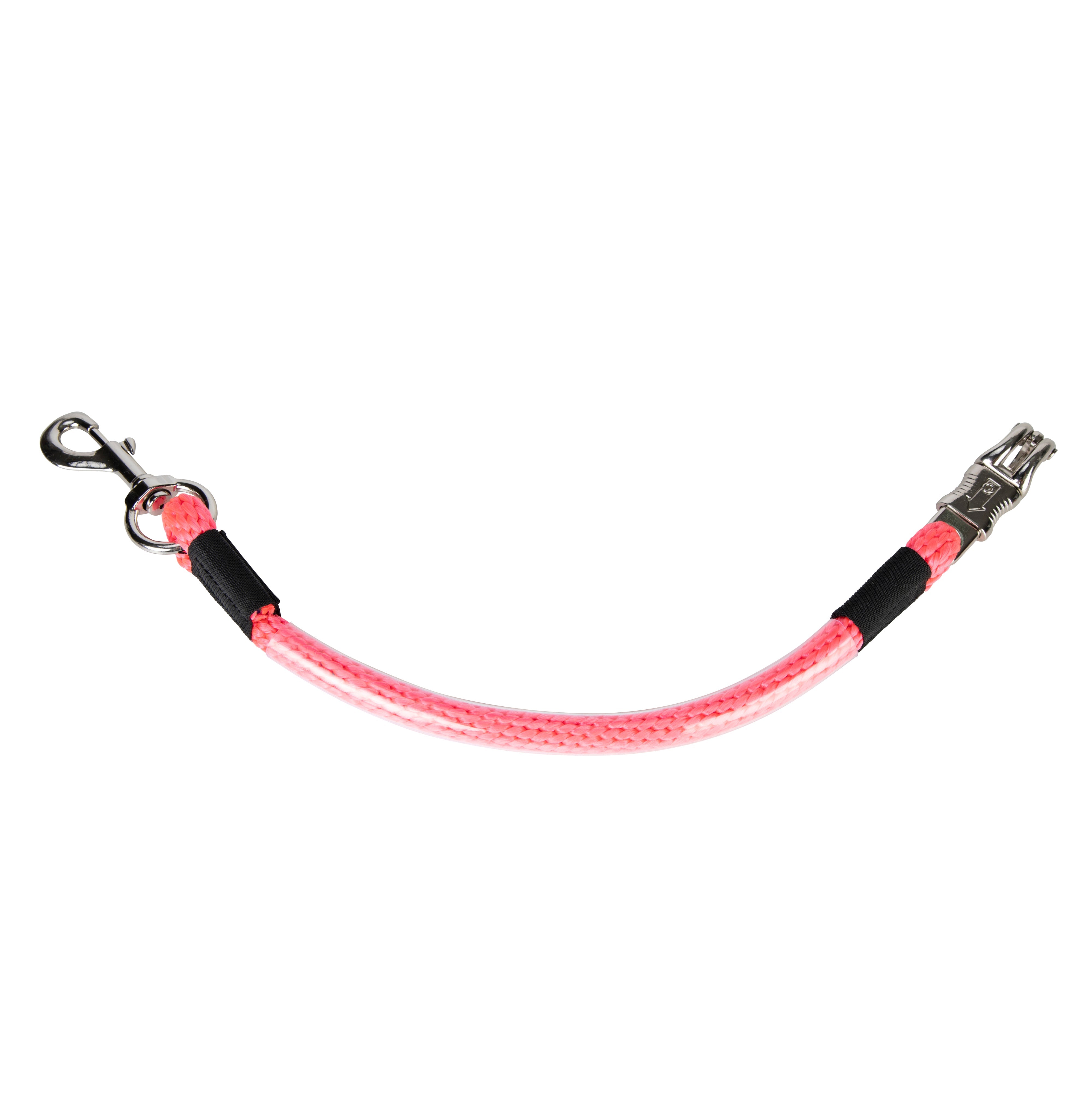 The heavy duty ARMA trailer tie quickly tethers the horse in the stable, yard or trailer, two can be used to safely cross tie a familiarised horse. The panic clip attaches to the headcollar and allows the handler to quickly intervene by pulling down on the clip and releasing the horse, reducing the risk of injury. The trigger clip end should be attached to a breakable loop, not directly to the tie ring. The robust cord is encased in a clear plastic tube to reduce wear and tear. Loops onto a tie ring. Ideal for the stable, yard or trailer. Total length 62cm.