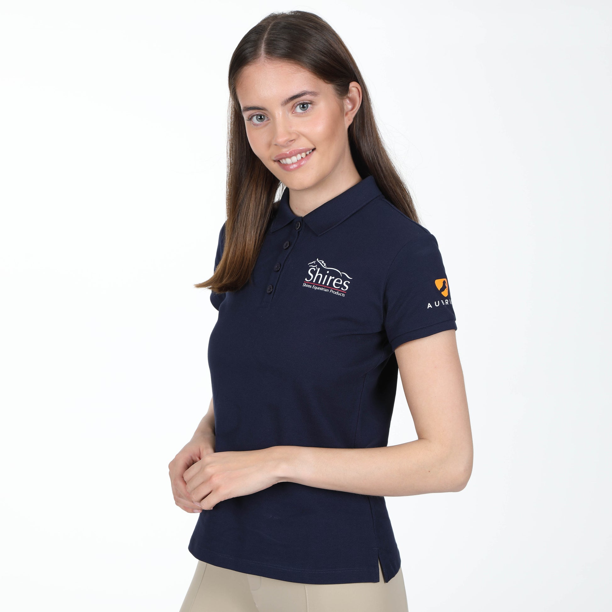 The branded Aubrion polo shirt feels cool in 100% cotton, the traditional polo design is styled with a flattering ladies fit. Featuring key Shires brand logos and worn by the #shiresprorider team. Style detail: 100% cotton, straight fit, polo style collar, four button placket, inner neck Aubrion trim, side split lower hem, Shires, Moretta and Aubrion logo prints.