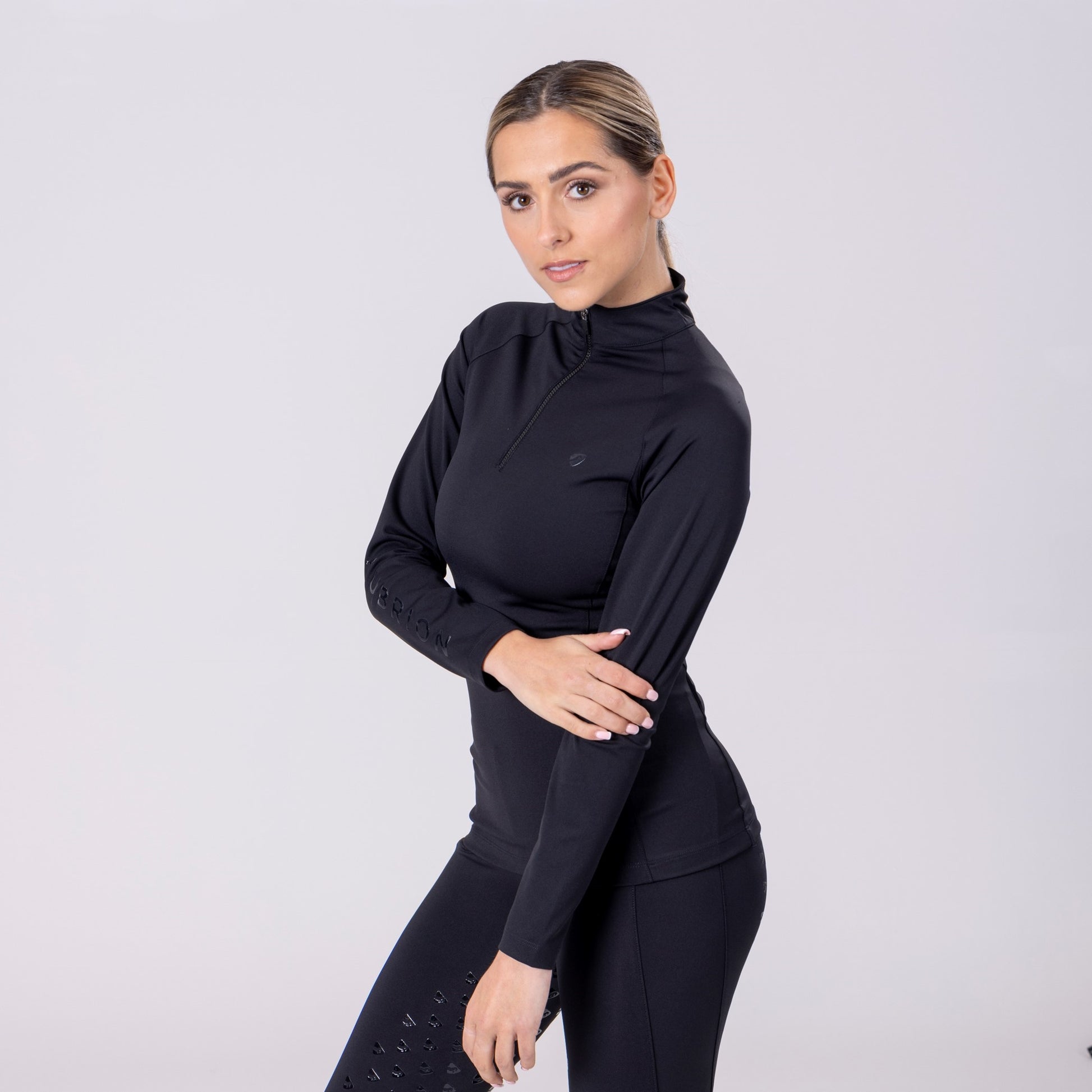 Offering year-round versatility, the Aubrion Eltar base layer offers a wicking next-to-skin layer with all round stretch. Ideal for general use and as part of a layering system. The 1/4 zip highline neck allows for optimal ventilation and versatile wear to regulate your comfort. Eltar brings essential performance to your riding along with coordinated looks for you and your horse. Key features: moisture wicking, quick drying, breathable, smooth feel, long sleeves, 1/4 zip at neck, comfort seams, self-colour Aubrion silicone prints.