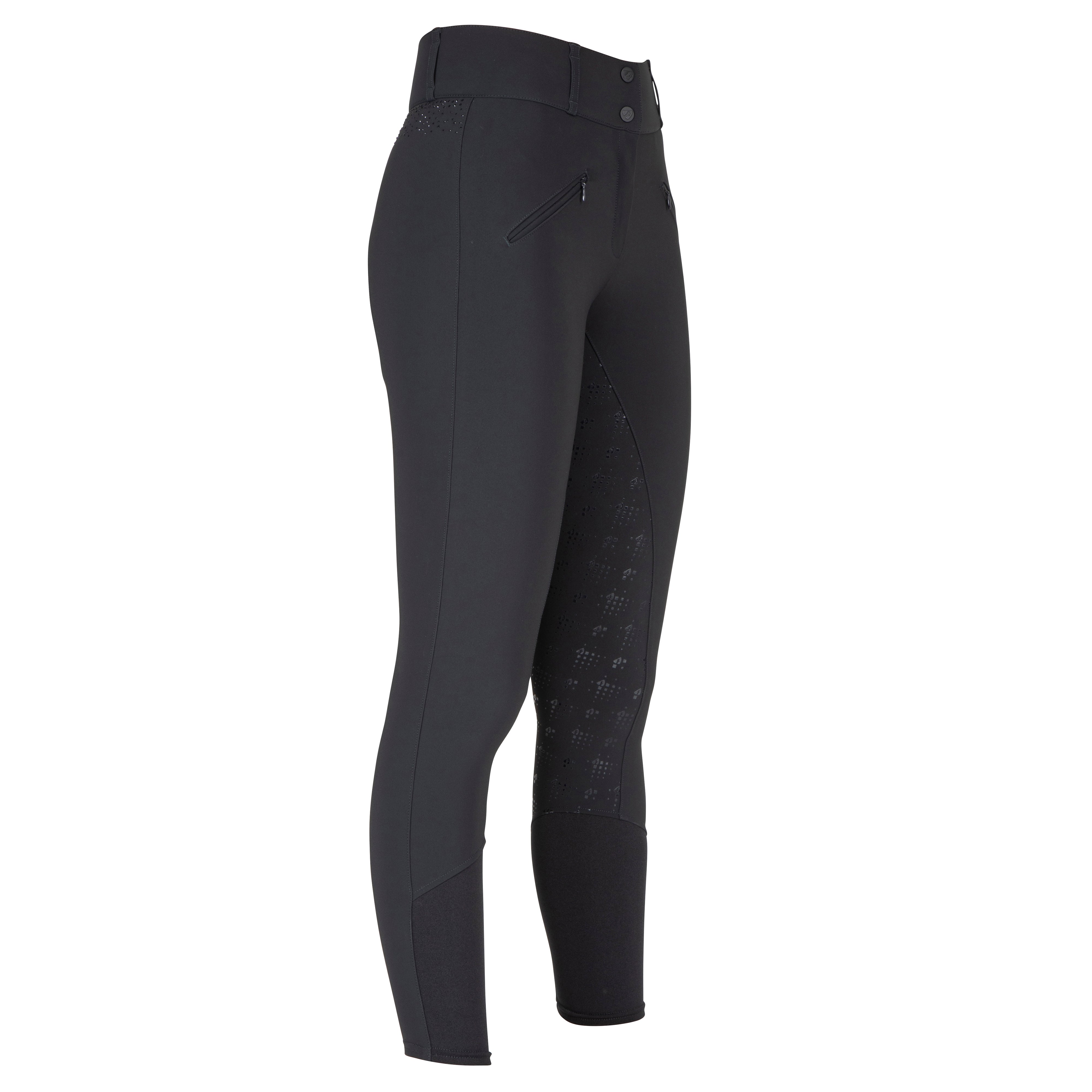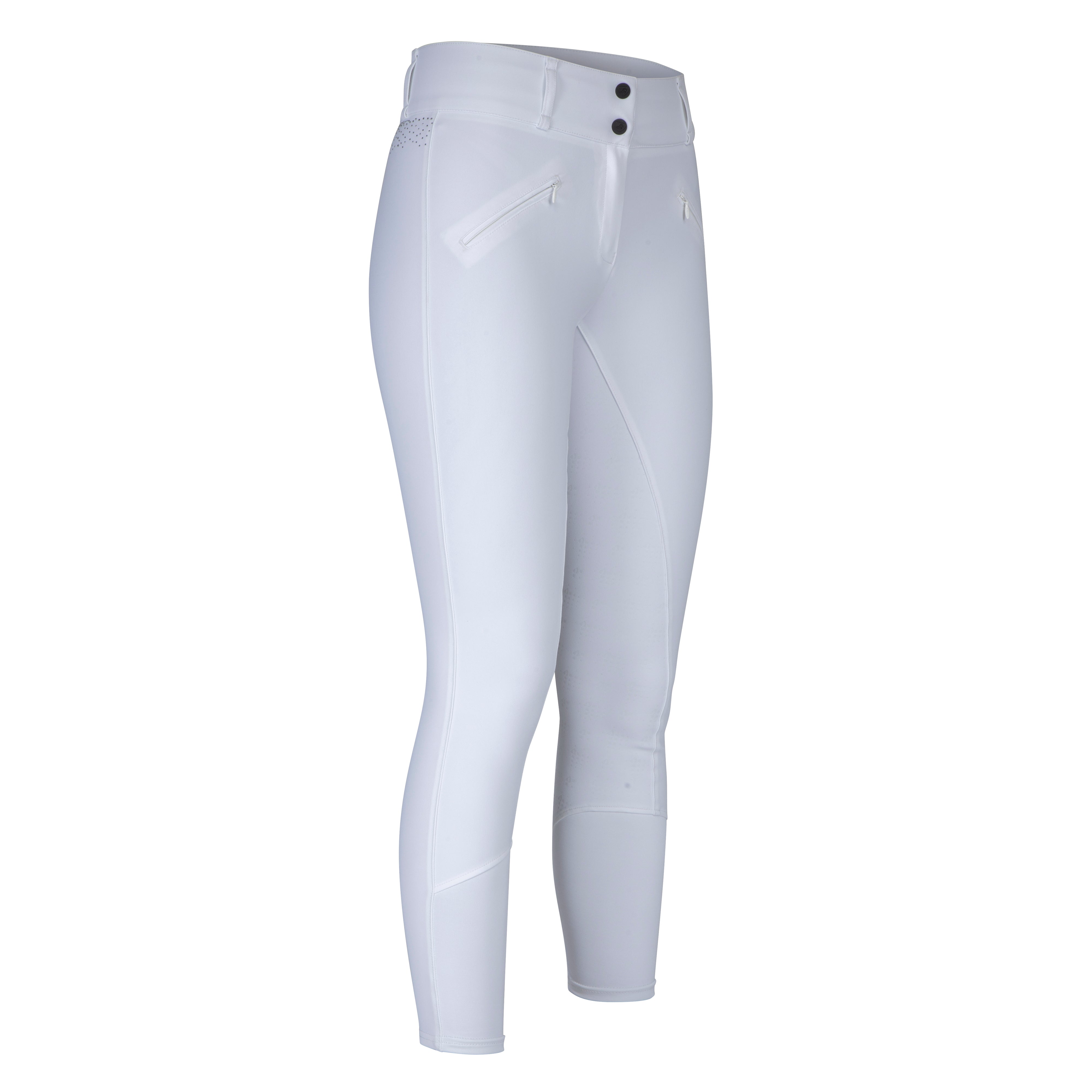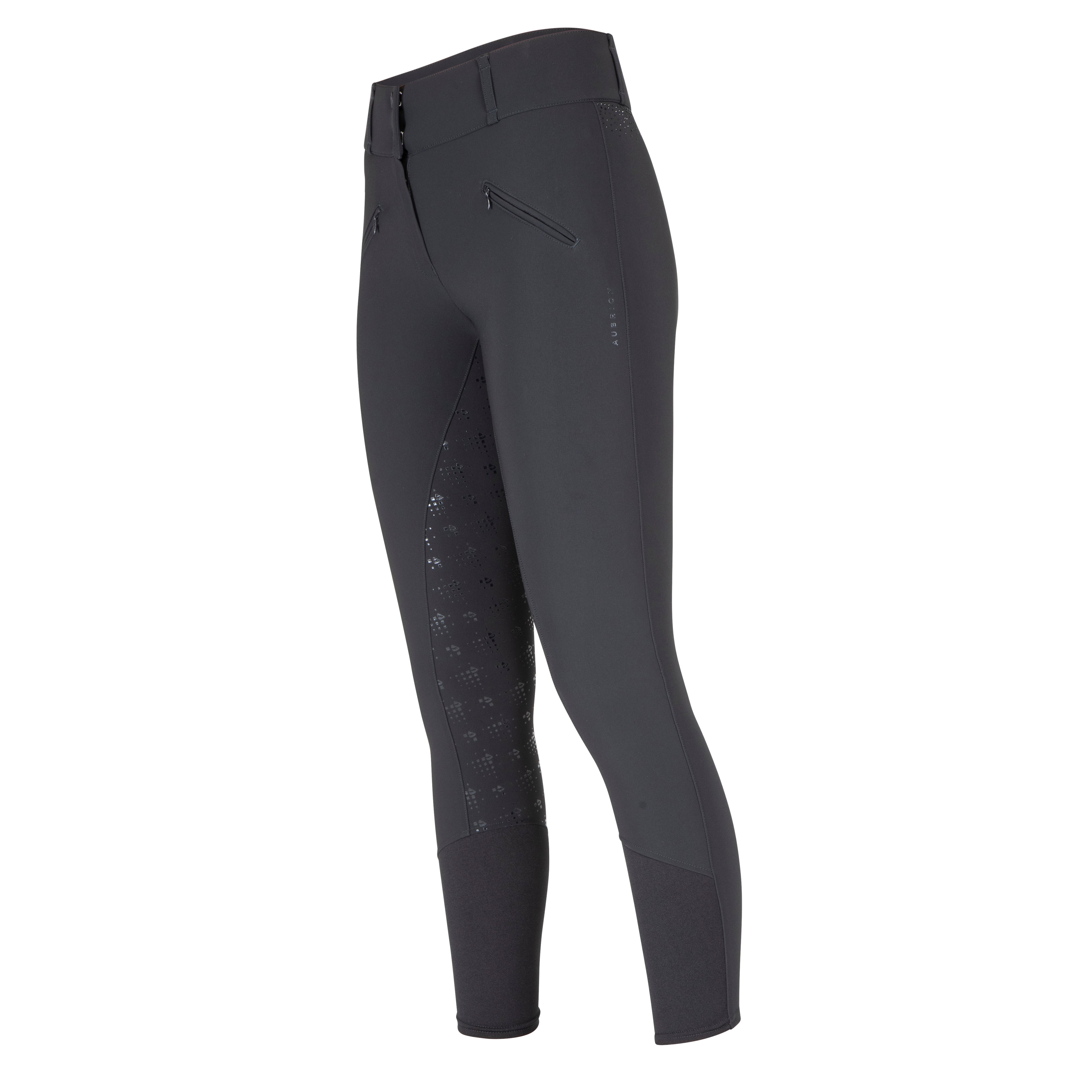 Aubrion Optima breeches are created for elite competition performance using modern design technology, innovative fabrics, and championship ready styling, appealing to riders who demand excellence whilst training or competing. Anatomically cut for the best athletic fit, moisture wicking technology is incorporated into superior figure-enhancing fabric that yields with the rider whilst maintaining a polished, competition-ready presentation. Contemporary GX features tonal diamante scattered at the lower back waistband to catch the light with every movement. The legs taper to low profile cuffs for a smooth fit under long riding boots. Neatly finished with a self-colour Aubrion logo at the leg, adding a subtle nod to elevated equestrian design. Further detail: practical zip pockets, mid rise, twin slide fastenings, zip fly, belt loops, contour seat, full seat silicone grips, high stretch leg cuffs, moisture wicking, quick drying, Aubrion logo print. Designed to comply with GB affiliated competition rules.