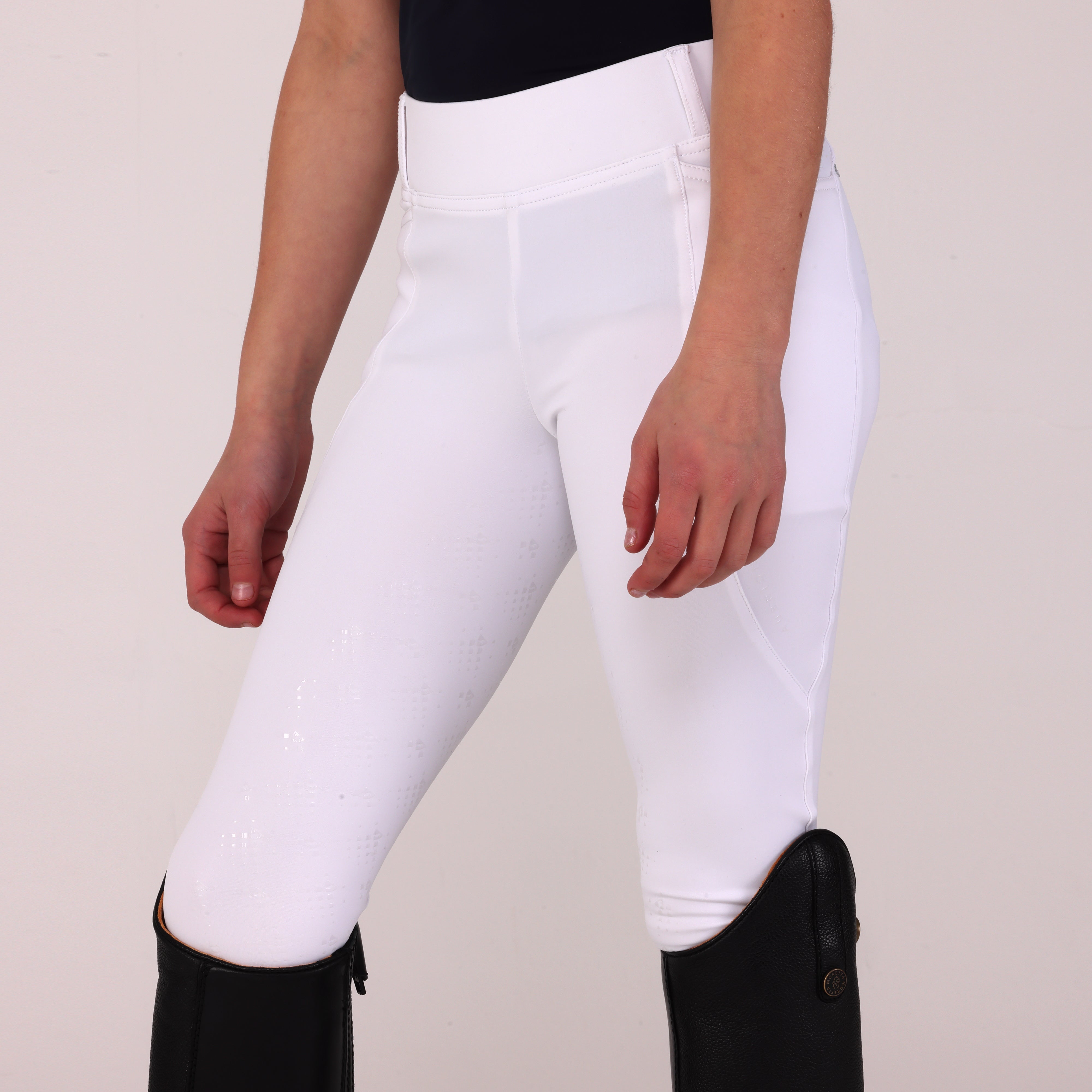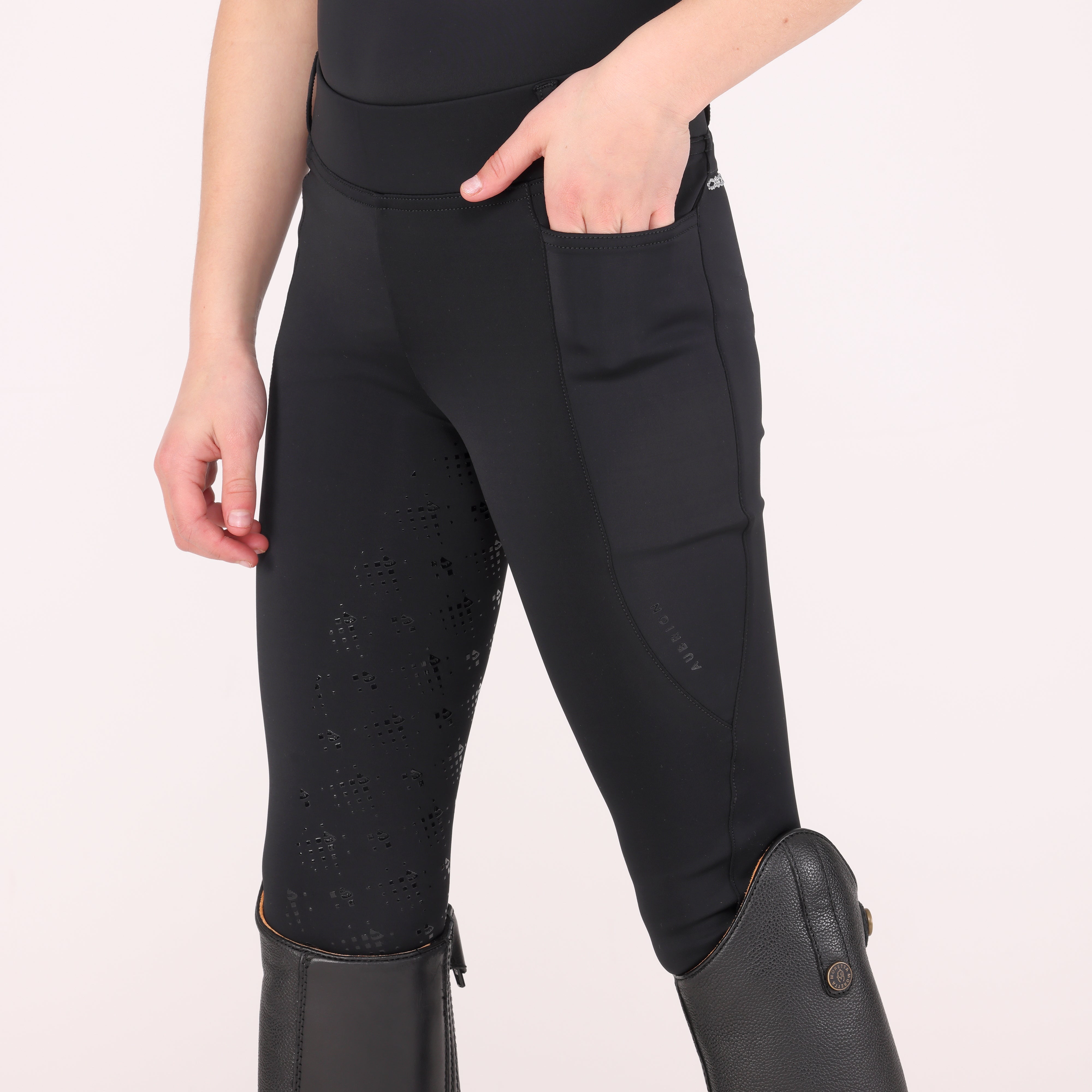 Aubrion Optima young rider tights are created for elite competition performance using modern design technology and innovative fabrics, appealing to riders who demand excellence whilst training or competing. Bringing an ultimate freedom feel, these riding tights are the perfect choice for enhanced in-saddle comfort. The sleek LX design streamlines detail to draw attention to its standout feature: eye-catching iridescent diamante chains, interlinked and set below the rear waistband for a sophisticated, radiant finish. Cleverly engineered 360º contour support and excellent moisture management revitalise though all levels of activity. A sleek flexible high waisted style offers core support for added confidence. The contour seat has a gloss silicone print for in-saddle security. Neatly finished with a self-colour Aubrion logo at the leg, adding a subtle nod to elevated equestrian design. Further detail: discrete phone pockets on both legs, supportive high waist, belt loops, contour seat, full silicone transparent grips, moisture wicking, quick drying, comfort seams, Aubrion logo print. Designed to comply with GB affiliated competition rules.