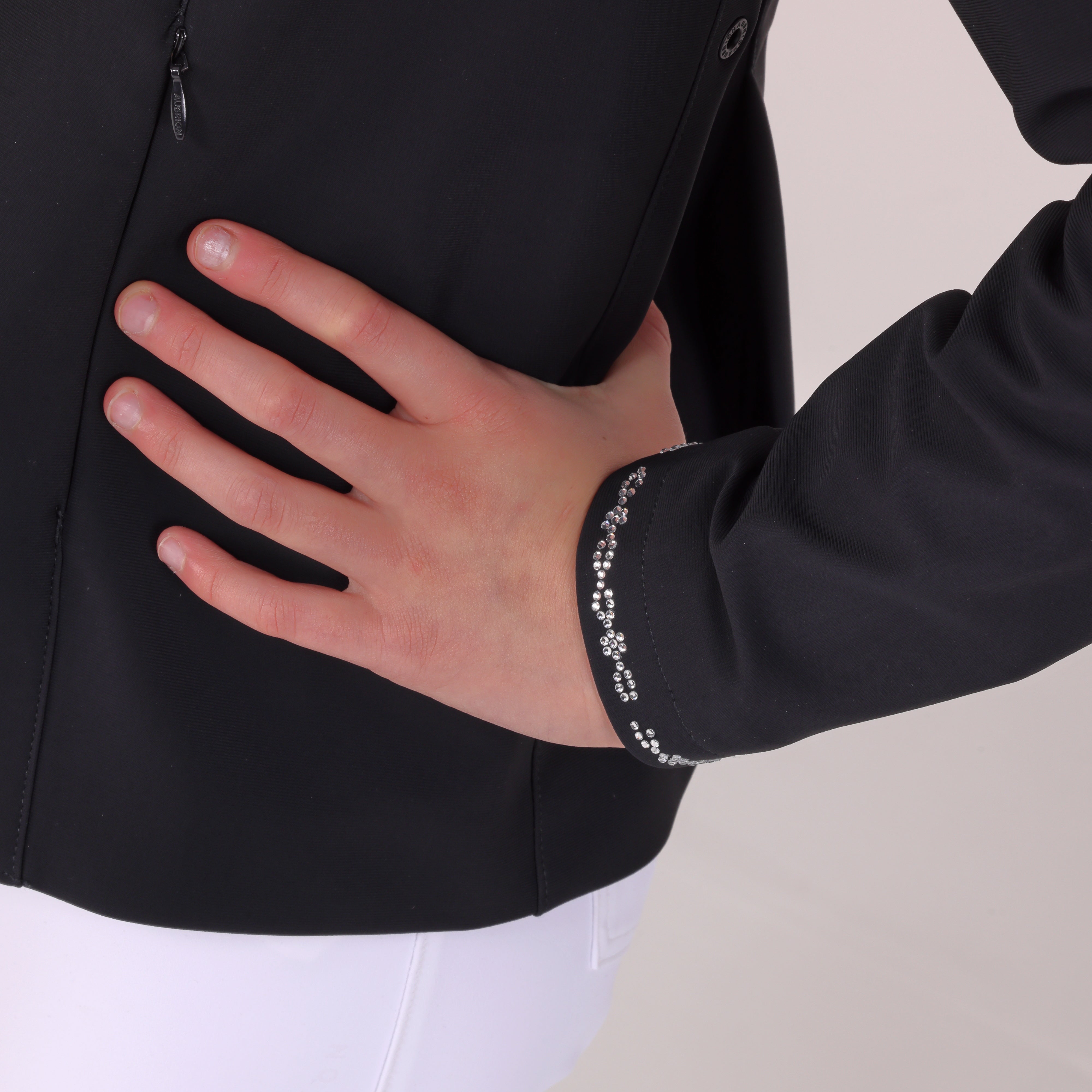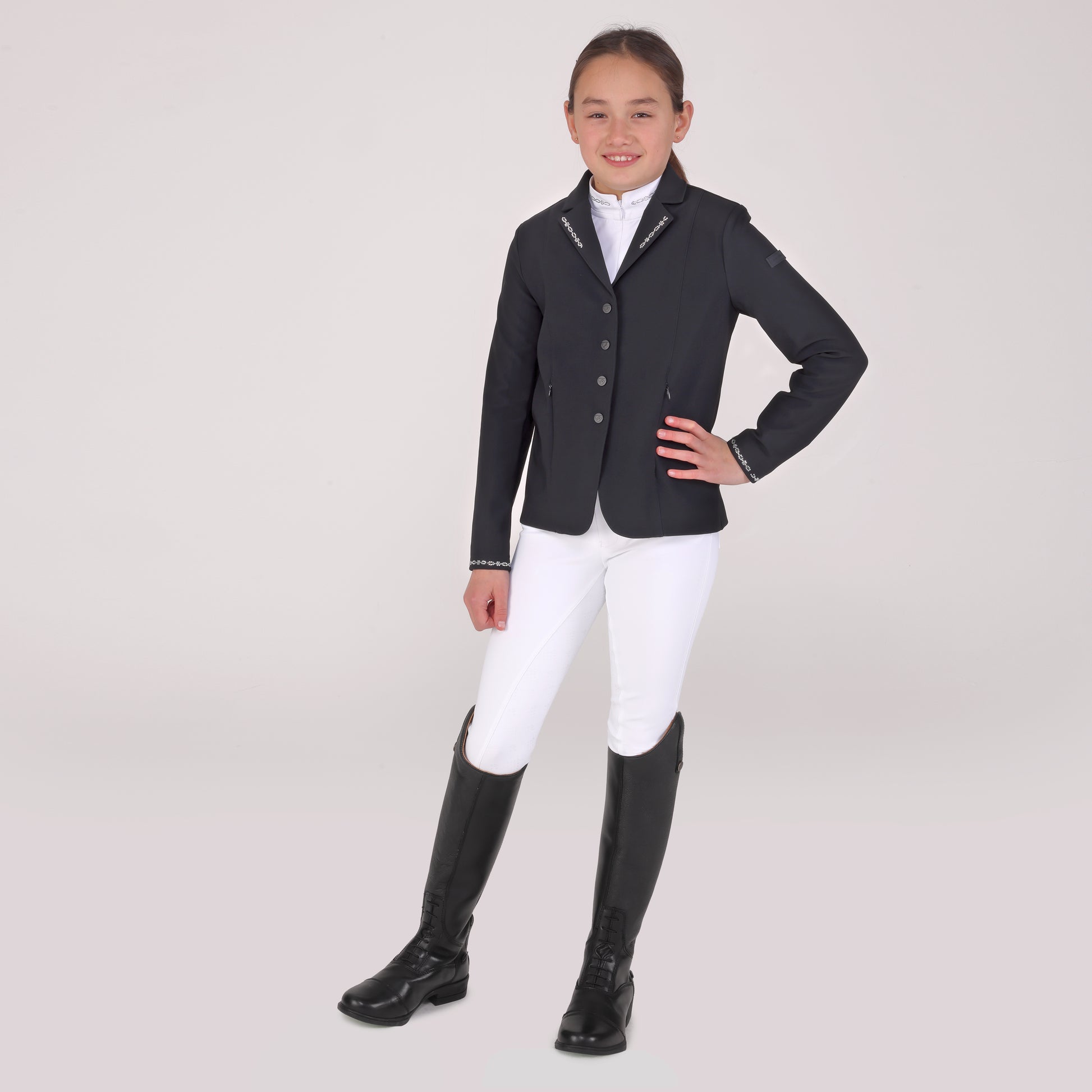 The Aubrion Optima young rider jacket is created for elite competition performance using modern design technology, innovative fabrics, and championship ready styling. Elegant tailoring creates a sleek fit, the hidden front zip fastening and two deep vents at the back keep a shape enhancing silhouette in or out of the saddle. Breathable temperature regulating fabrics offer excellent moisture management. In-motion stretch performance allows movement without restriction and maintains a polished, competition-ready look. The sleek LX design streamlines detail to draw attention to its standout feature: eye-catching iridescent diamante chains, interlinked and set along the lapel and cuffs for a sophisticated, radiant finish. An Aubrion logo on the left sleeve adds a subtle nod to elevated equestrian design. Further detail: discrete zip pockets, diamante decorated notch lapel and cuffs, zip fastening with popper button placket, moisture wicking mesh lining, quick drying fabrics, self-fabric hanging loop, Aubrion rubber logo badge. Designed to comply with GB affiliated competition rules.