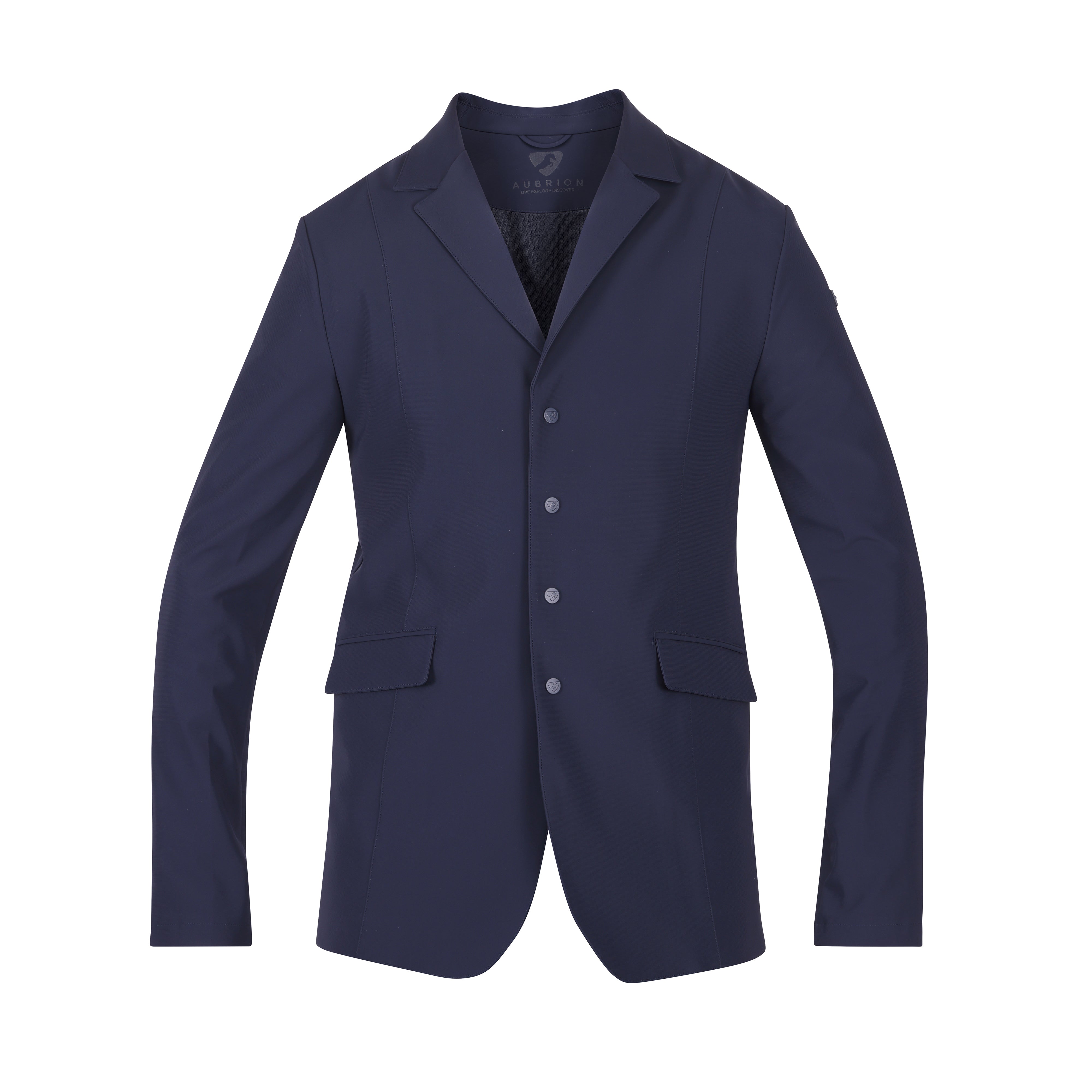 The Aubrion Optima mens jacket is created for elite competition performance using modern design technology, innovative fabrics, and championship ready styling. Smart tailoring creates a sleek fit, the button front fastening and two deep vents at the back keep a clean silhouette in or out of the saddle. Breathable temperature regulating fabrics offer excellent moisture management. In-motion stretch performance allows movement without restriction and maintains a polished, competition-ready look. Smart and timeless, MX incorporates traditional styling details, offering a classic and polished presentation that never goes out of style. An Aubrion logo on the left sleeve adds a subtle nod to elevated equestrian design. Further detail: flap opening pockets, plain notch lapel, button placket, moisture wicking mesh lining, quick drying fabrics, self-fabric hanging loop, Aubrion rubber logo badge. Designed to comply with GB affiliated competition rules.