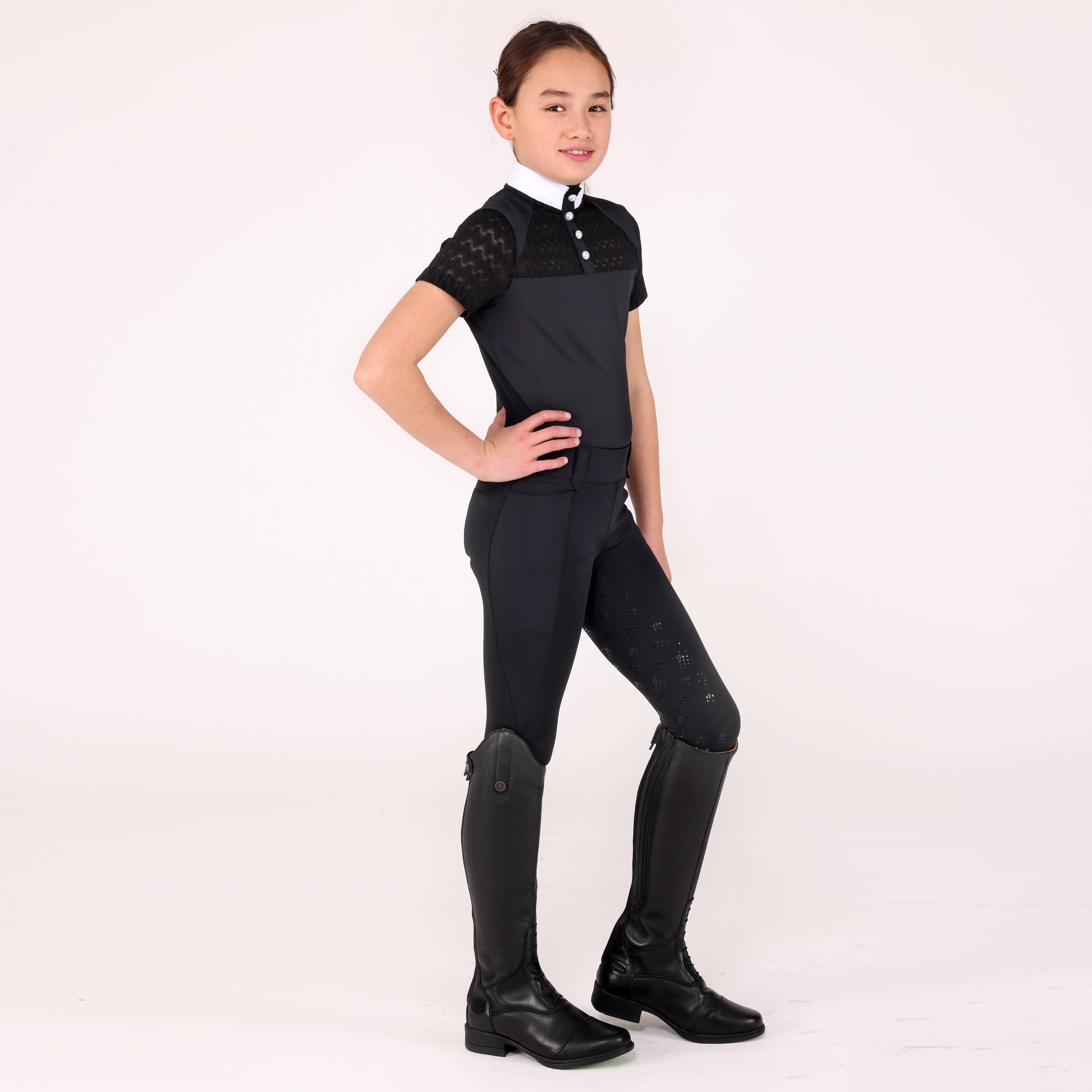 Aubrion Optima is created for elite competition performance using modern design technology, innovative fabrics, and championship ready styling. Optima young rider show shirts offer advanced mobility and technical support through all levels of competition and all disciplines. The cut allows a contour fit; the elegant high collar and short sleeves present a neat finish. Cool stretch fabric feels soft and comfortable; moisture management and quick dry technologies give fresh feel athletic efficiency. Elegant VX features pretty detailing with breezy stretch lace panels and pearlized button placket to give a distinctive aesthetic. A refined self-colour Aubrion logo at the centre back adds a subtle nod to elevated equestrian design. Further detail: lace sleeves, lace upper chest and back, UPF50 main body fabric, discrete quarter zip, high neck, monogramed zip puller, four-way stretch, moisture wicking, quick drying, comfort seams, Aubrion logo print. Designed to comply with GB affiliated competition rules.