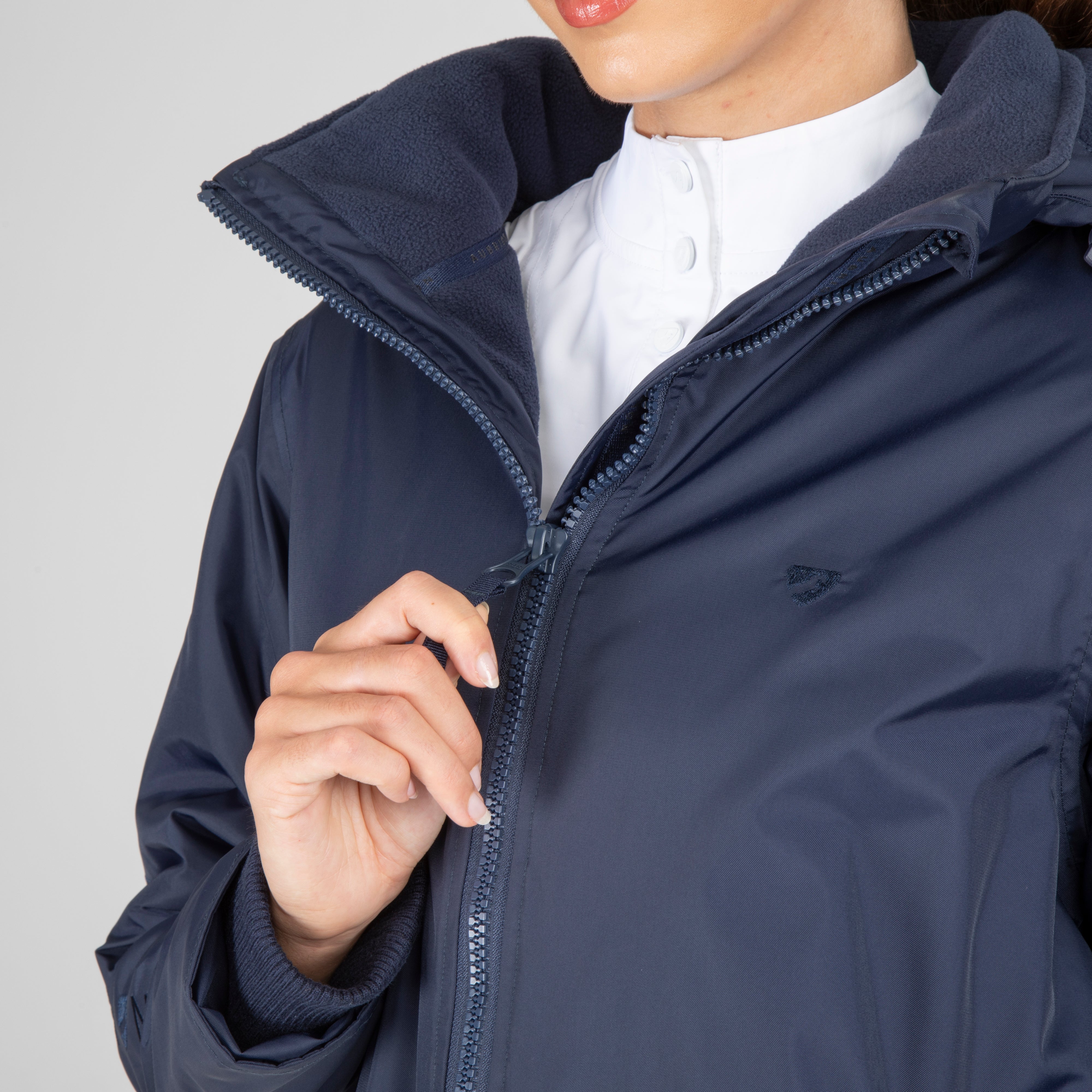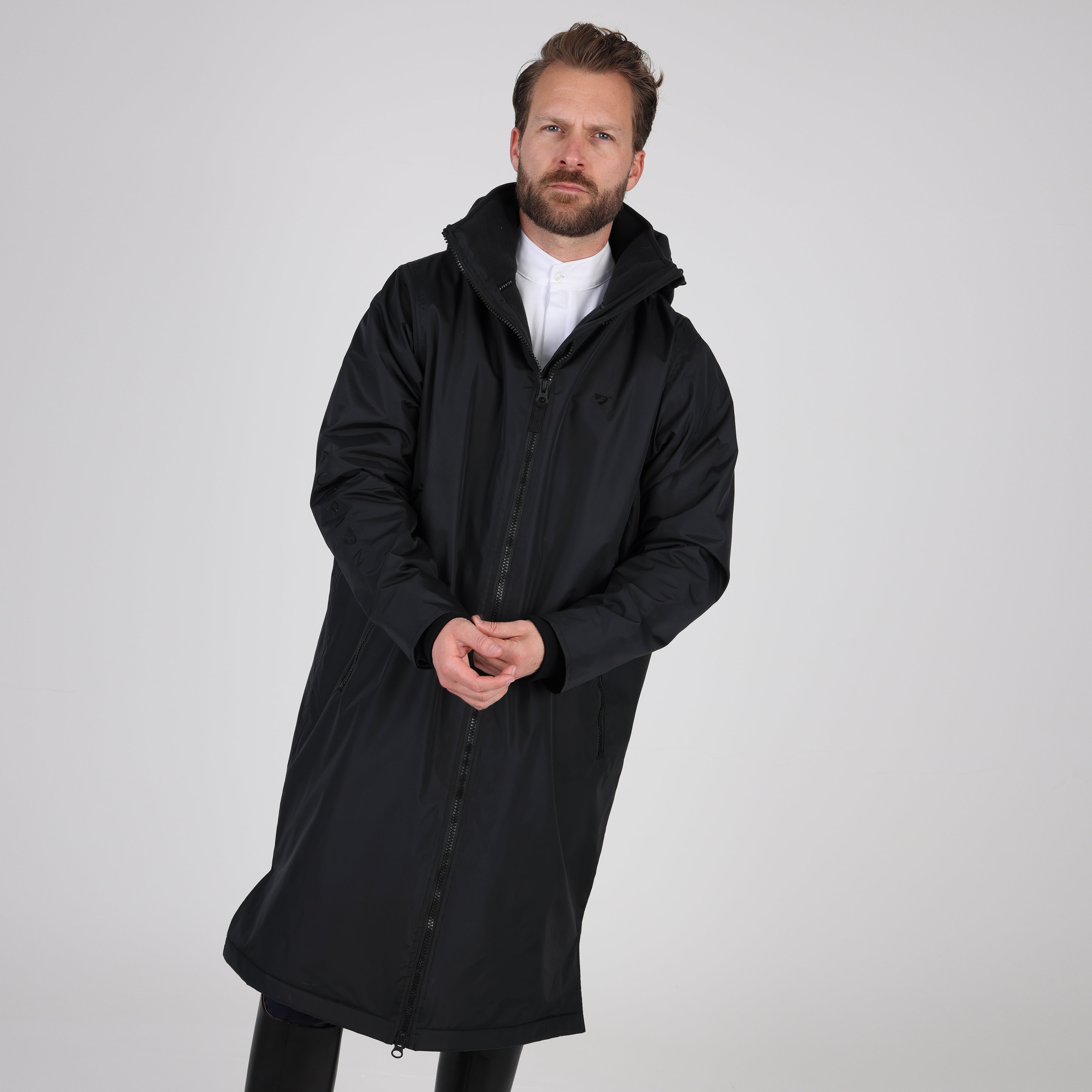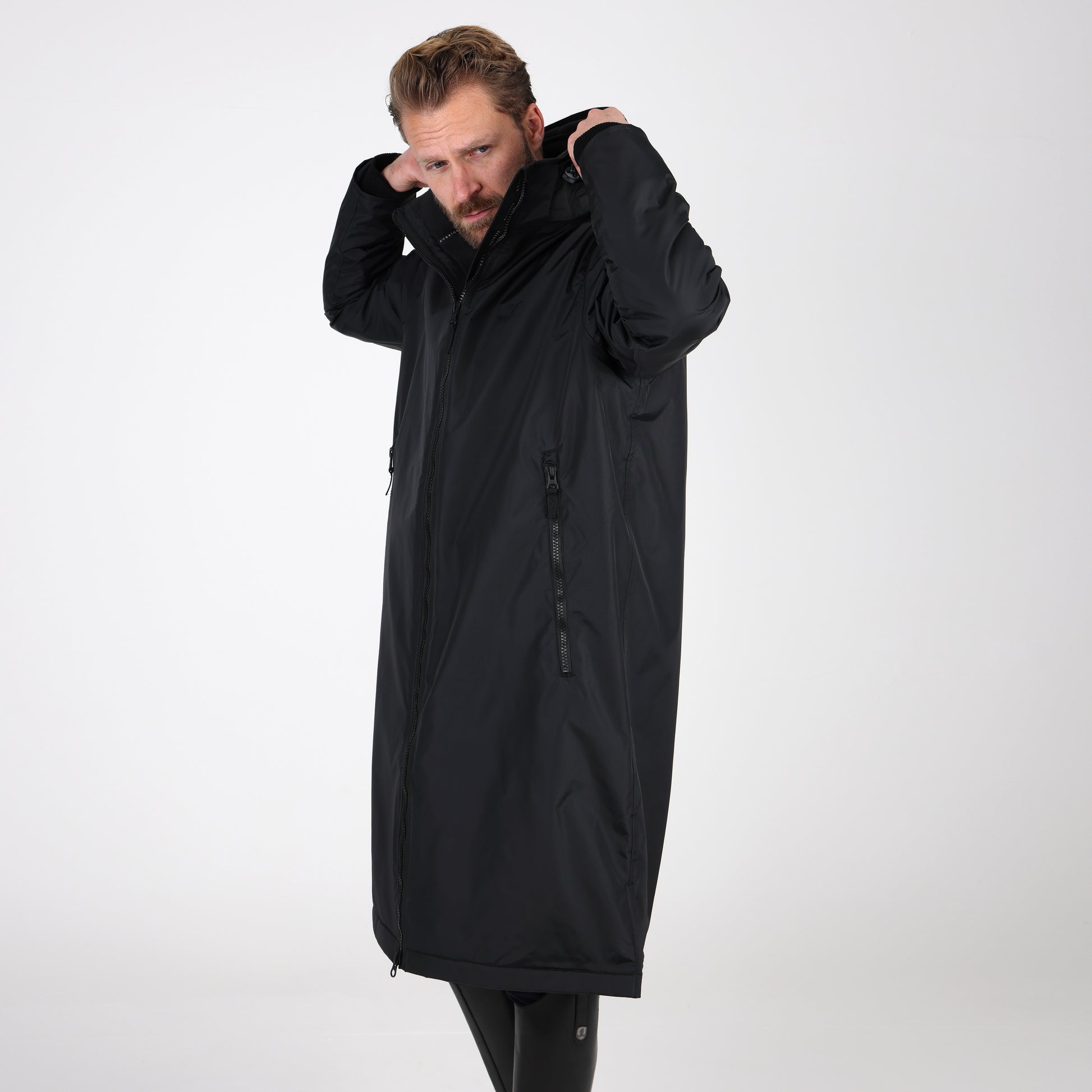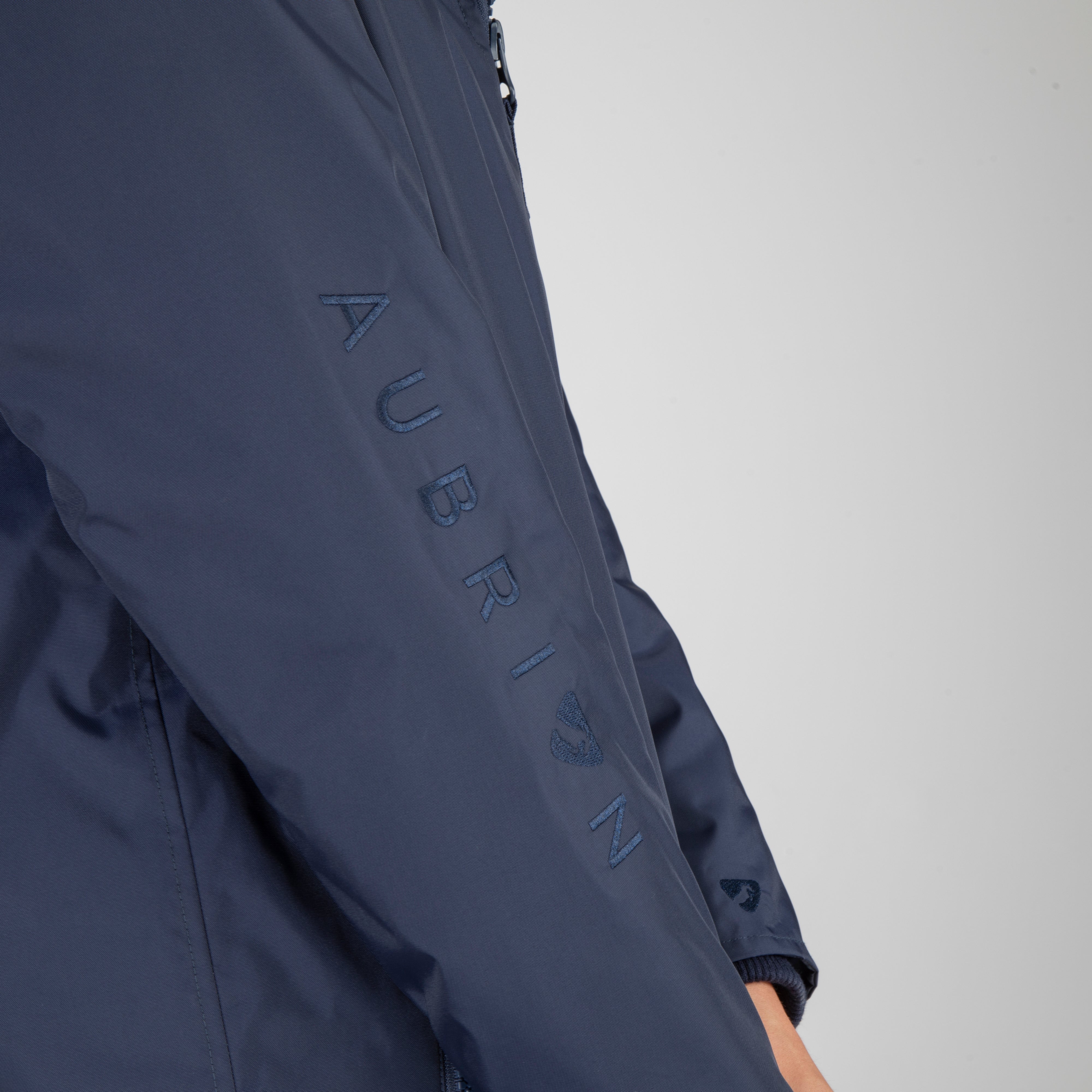 Built for an equestrian life, enjoy full length protection from wind, cold and rain in the Aubrion Original all weather robe. Durable from the outside with great waterproof credentials and a tough polyester weave to resist abrasion, wear and tear. On the inside, deep pile fleece lining is cosy, insulating and breathable. An oversized fit gives versatility for all year useability whether you’re layering up for lesson-watching or staying active in the saddle. When its windy or cold keep out the chill with stretch wrist cuffs, highline neck, fleece lined hood and good length. Rider enhanced benefits: hem opening zip, rear rider vents for seated comfort, in-saddle weather protection, a removable hood for rider preference. Practical features: robust zips, easy grip zipper pulls, deep fleece lined zip pockets, inner zip pocket, inner wrist cuffs, hood adjusters, highline neck, chin guard, taped seams, fabric hanging loop. Waterproof to 10,000mm, Breathable to 5000g/m2. Durable Waterproof Repellent (DWR) prevents saturation - water beads on the fabric and runs off. Made with Bionic-Finish® Eco: fluorine-free water repellent technology. Styled with self-colour embroidered Aubrion logos. Great for teams as embroidery can be added via a hidden zip in the lining.