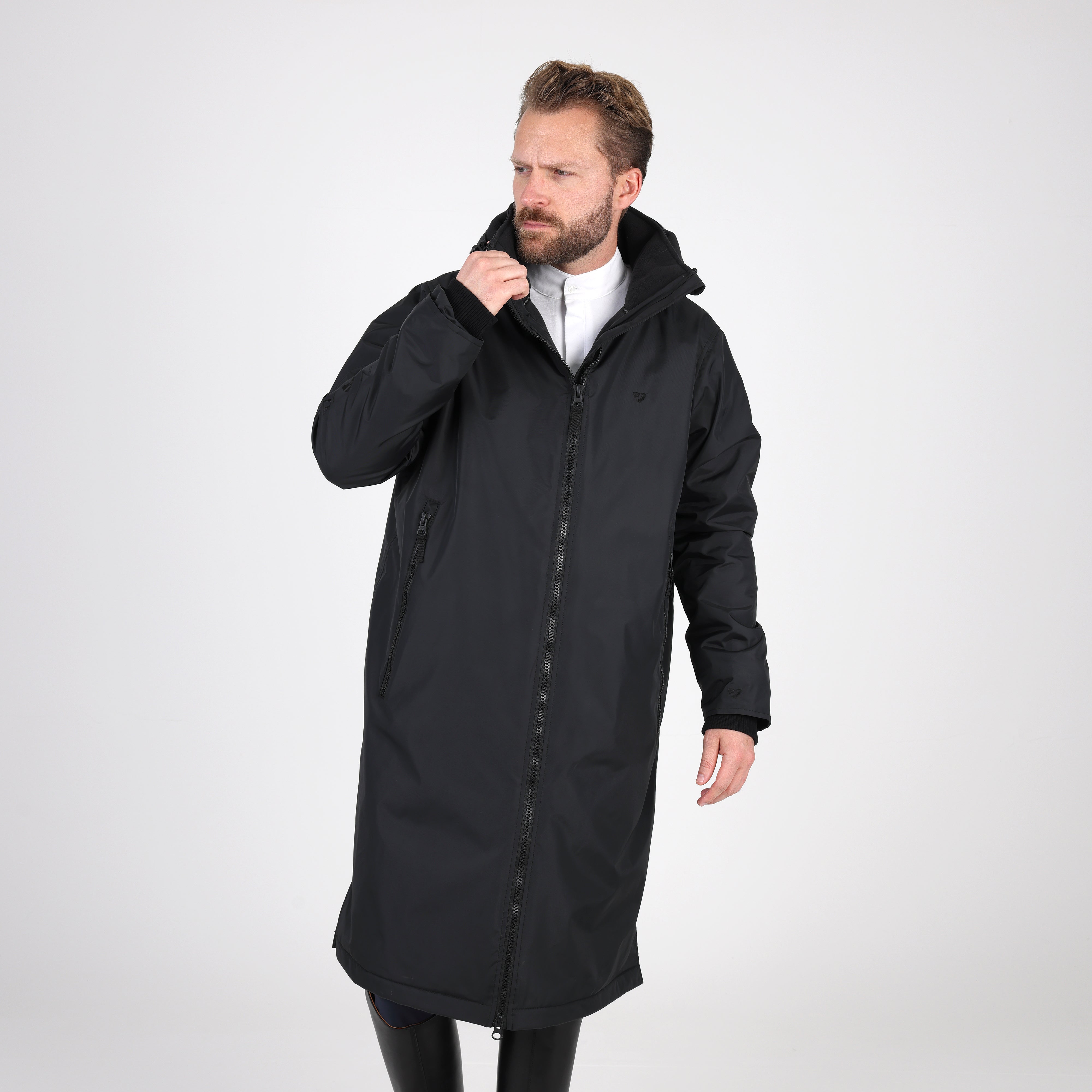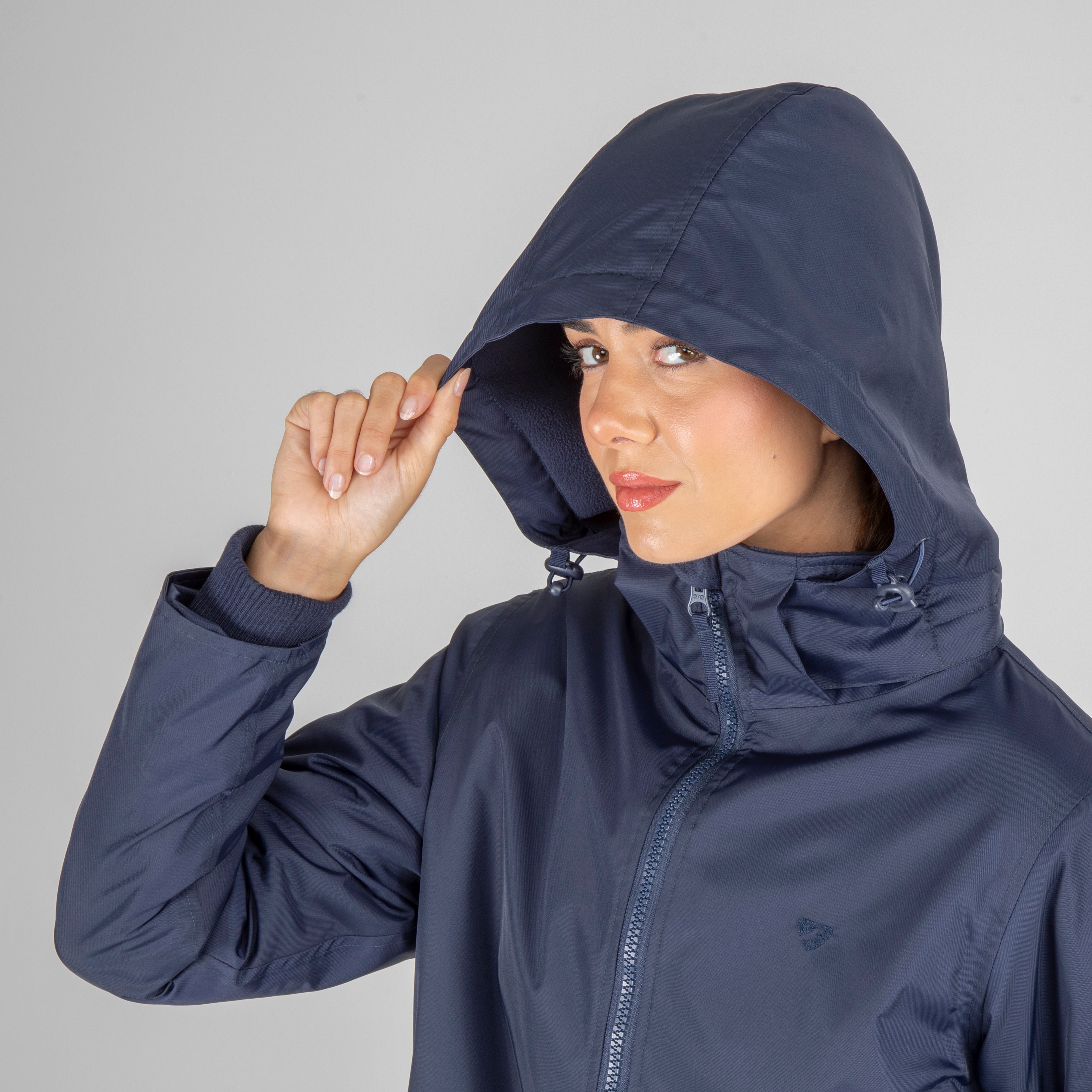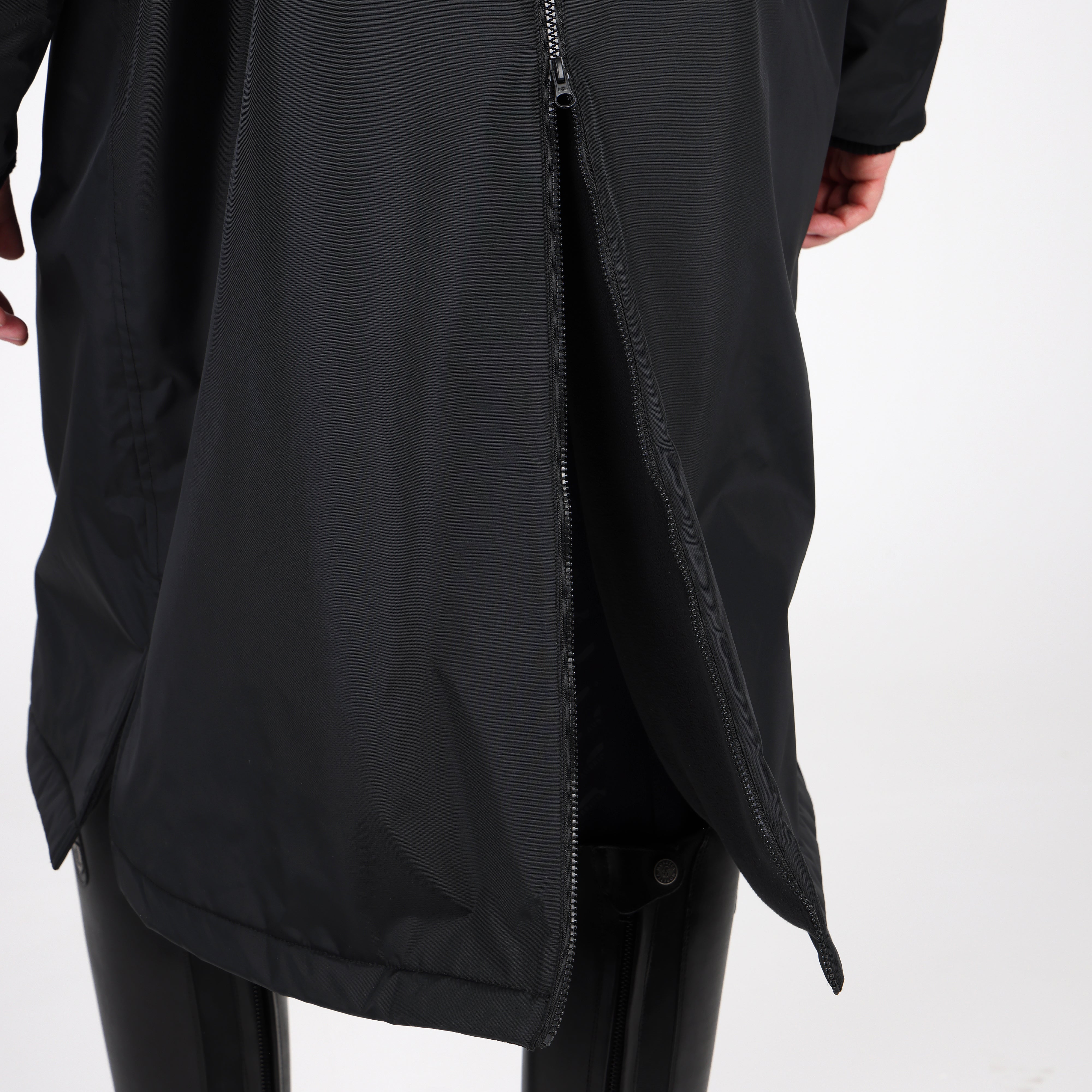 Built for an equestrian life, enjoy full length protection from wind, cold and rain in the Aubrion Original all weather robe. Durable from the outside with great waterproof credentials and a tough polyester weave to resist abrasion, wear and tear. On the inside, deep pile fleece lining is cosy, insulating and breathable. An oversized fit gives versatility for all year useability whether you’re layering up for lesson-watching or staying active in the saddle. When its windy or cold keep out the chill with stretch wrist cuffs, highline neck, fleece lined hood and good length. Rider enhanced benefits: hem opening zip, rear rider vents for seated comfort, in-saddle weather protection, a removable hood for rider preference. Practical features: robust zips, easy grip zipper pulls, deep fleece lined zip pockets, inner zip pocket, inner wrist cuffs, hood adjusters, highline neck, chin guard, taped seams, fabric hanging loop. Waterproof to 10,000mm, Breathable to 5000g/m2. Durable Waterproof Repellent (DWR) prevents saturation - water beads on the fabric and runs off. Made with Bionic-Finish® Eco: fluorine-free water repellent technology. Styled with self-colour embroidered Aubrion logos. Great for teams as embroidery can be added via a hidden zip in the lining.