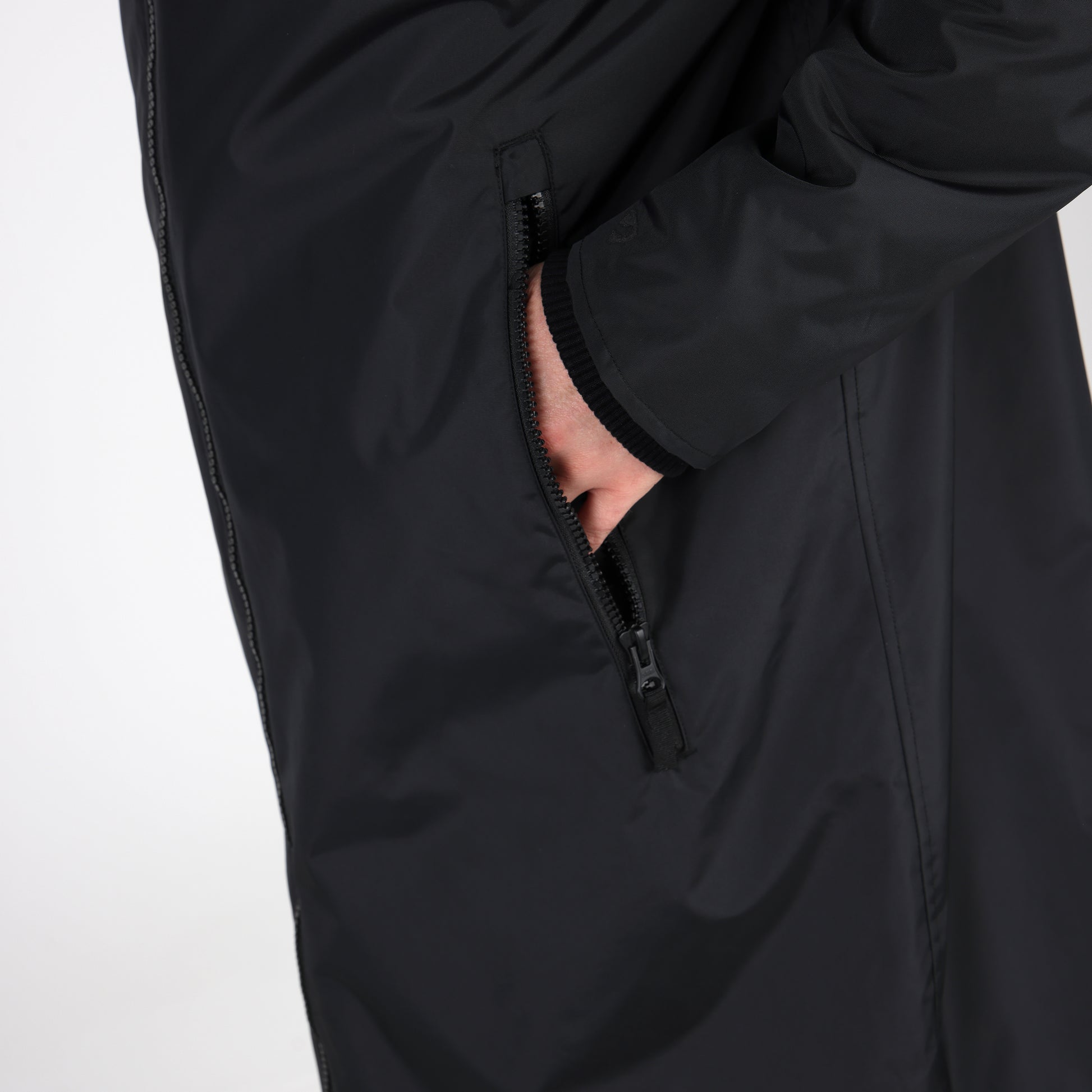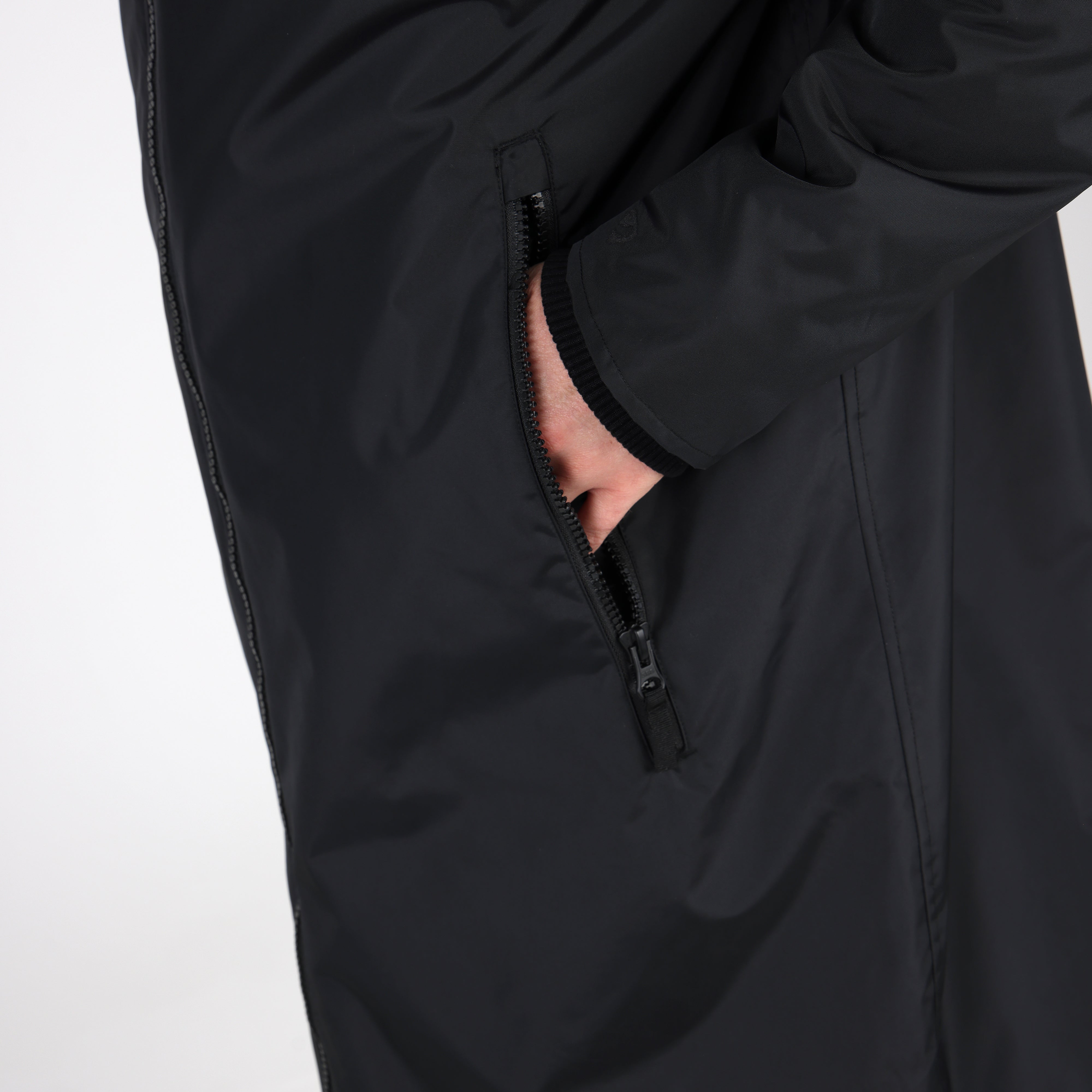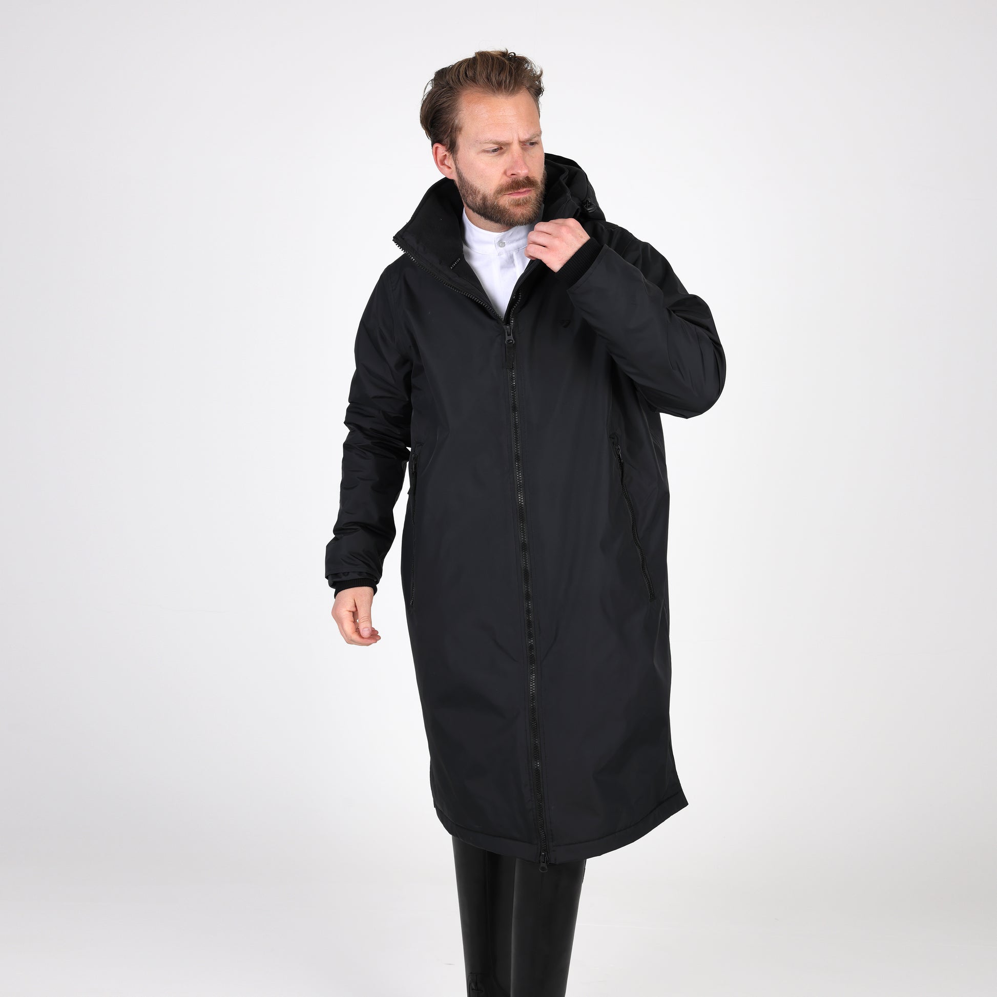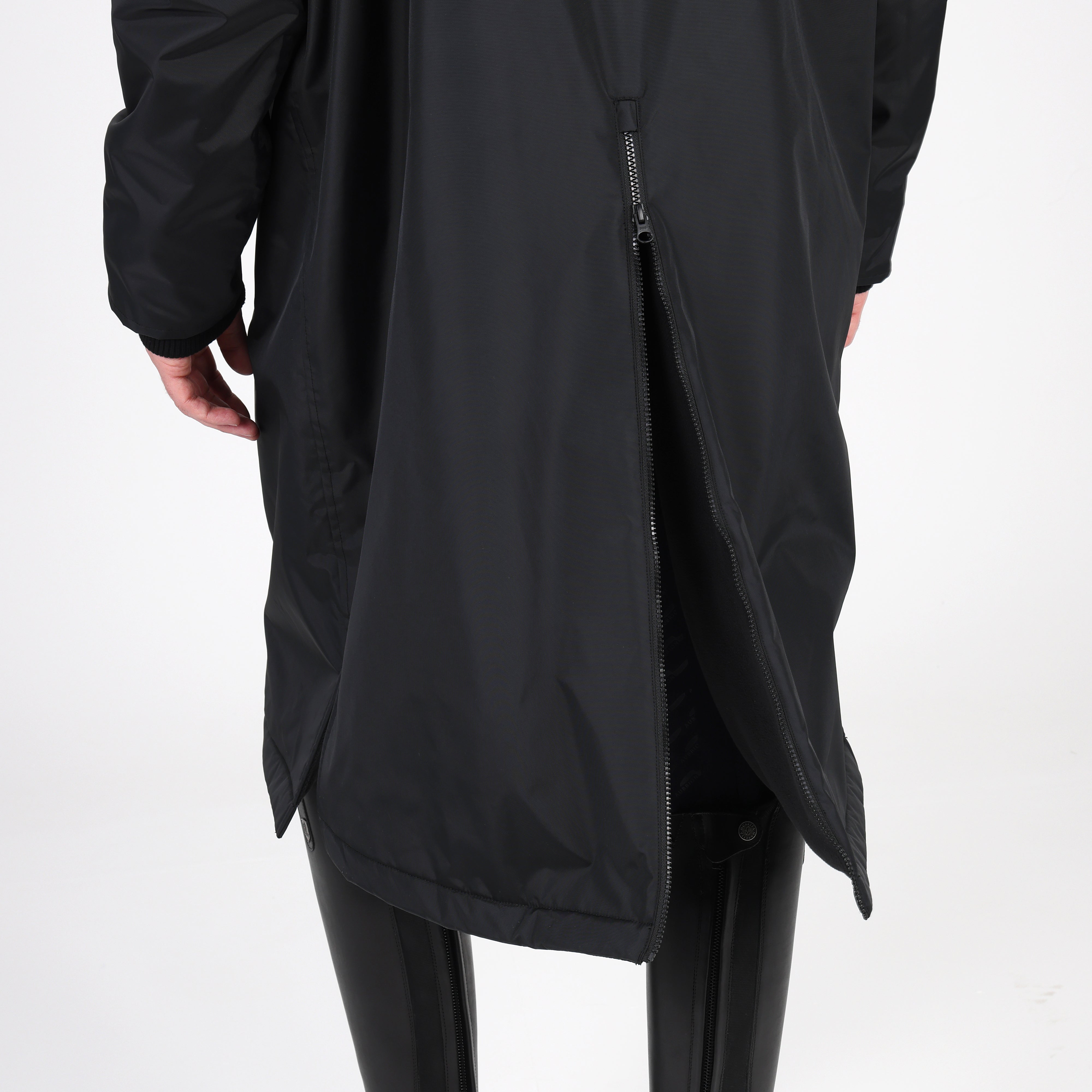 Built for an equestrian life, enjoy full length protection from wind, cold and rain in the Aubrion Original all weather robe. Durable from the outside with great waterproof credentials and a tough polyester weave to resist abrasion, wear and tear. On the inside, deep pile fleece lining is cosy, insulating and breathable. An oversized fit gives versatility for all year useability whether you’re layering up for lesson-watching or staying active in the saddle. When its windy or cold keep out the chill with stretch wrist cuffs, highline neck, fleece lined hood and good length. Rider enhanced benefits: hem opening zip, rear rider vents for seated comfort, in-saddle weather protection, a removable hood for rider preference. Practical features: robust zips, easy grip zipper pulls, deep fleece lined zip pockets, inner zip pocket, inner wrist cuffs, hood adjusters, highline neck, chin guard, taped seams, fabric hanging loop. Waterproof to 10,000mm, Breathable to 5000g/m2. Durable Waterproof Repellent (DWR) prevents saturation - water beads on the fabric and runs off. Made with Bionic-Finish® Eco: fluorine-free water repellent technology. Styled with self-colour embroidered Aubrion logos. Great for teams as embroidery can be added via a hidden zip in the lining.
