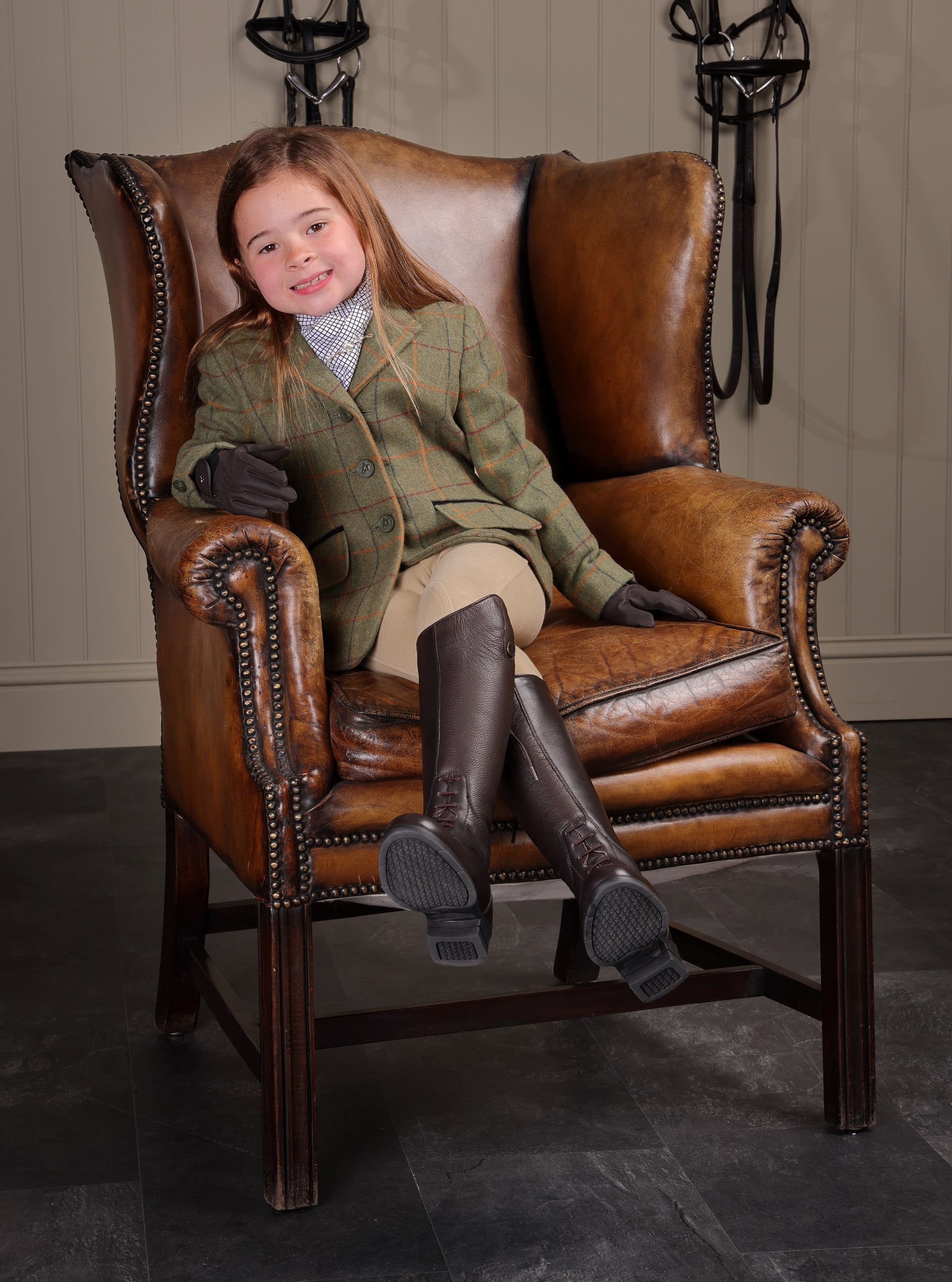A timeless classic, the Aubrion Saratoga jacket is cut with a flattering modern contour fit, and tailored for free movement in the saddle. Attractive wool rich tweed cloth is complemented by velvet trims at the revere notch collar and pocket flaps, and elegantly finished with a full satin lining. Suitable for a range of disciplines from showing, competition, pony club and countryside pursuits. Style detail: classic fit, velvet trims, 3 button front fastening, button detail at the cuff and back vents, two flap pockets, full satin lining. Double fastening buttons for boys or girls.