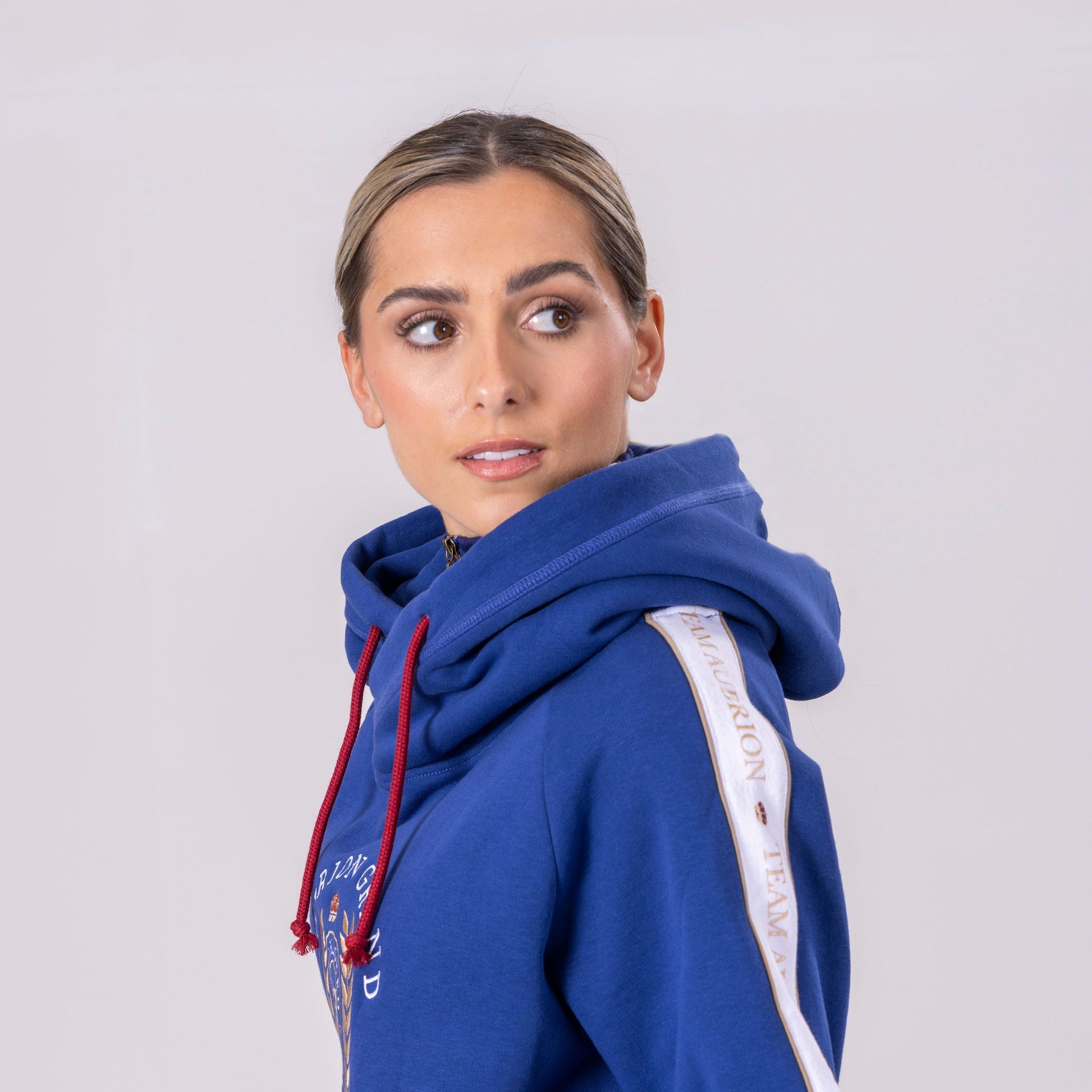Laid back elegance and relaxed glamour styling gives the Aubrion Team hoodie multiple style options, whether teamed with riding tights or worn with jeans. Brushed back fabric gives a cosy feel, a generous drawcord hood and kangaroo pocket keep the look casual. The detail: cotton rich blend jersey with brushed inner, cosy oversized cowl neck hood with drawcord, handwarmer pocket, lower hem emblem badge, Aubrion Team embroidery and prints.