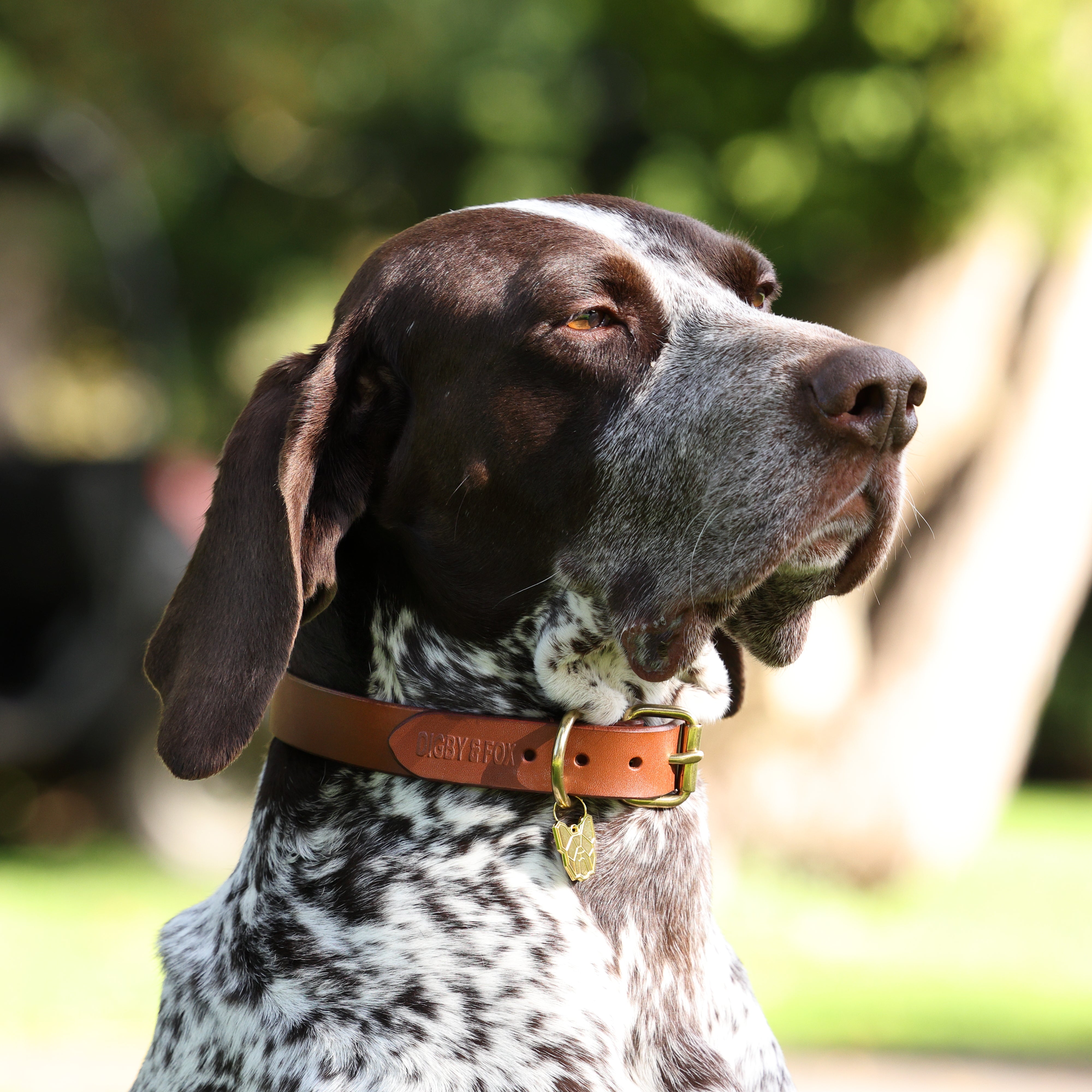 Classic, smart and fantastic quality, the Digby & Fox flat leather dog collar is beautifully finished and trimmed with brass colour fittings and the Digby & Fox tag. Matching lead available.
