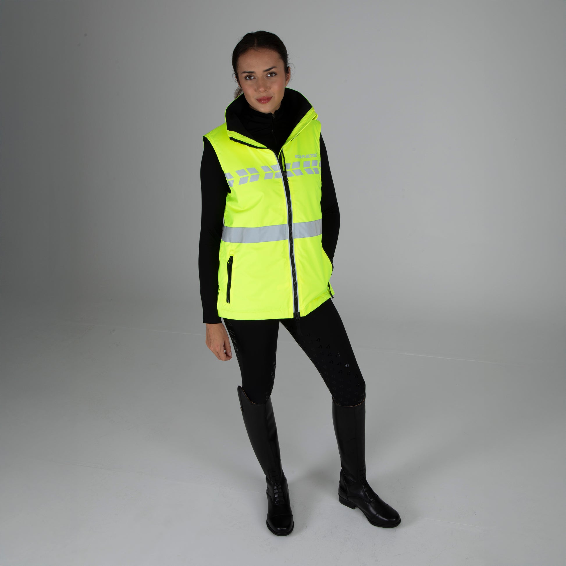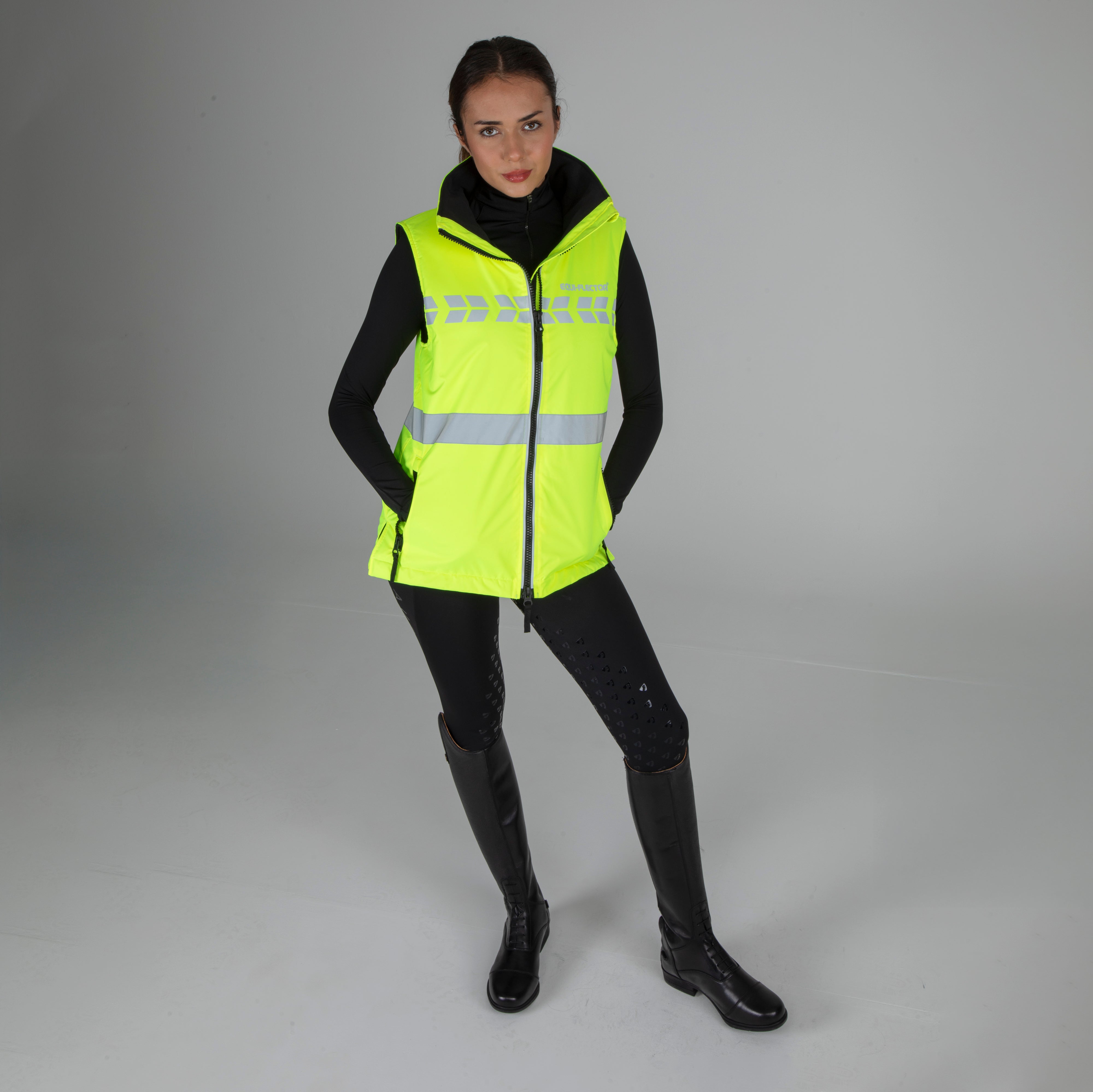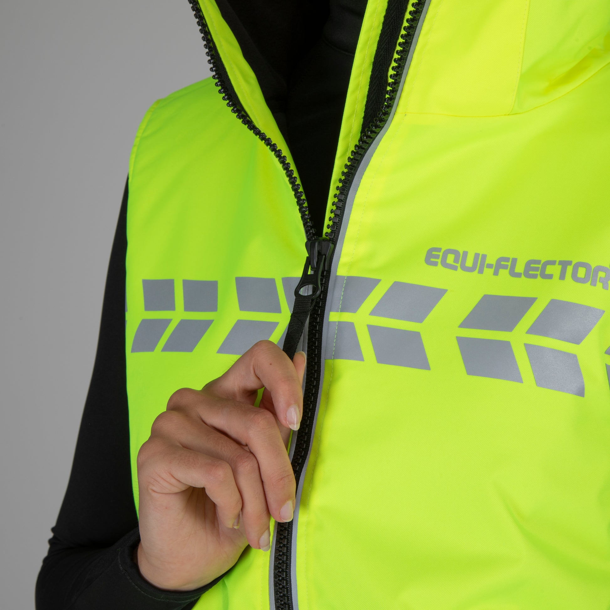 Keeping you visible in all light conditions, the EQUI-FLECTOR® gilet is ideal for layering through the seasons, in or out of the saddle. Together with the bright colour, bold graphics are visible at distance, and 360° reflective prints offer visibility in darker conditions. The waterproof and breathable outer is hardwearing to resist wear and tear. Deep pile fleece lining to the body and pockets provide cosy warmth. Valuables stay safe in one inner and two outer zip pockets. Rider enhanced benefits: hem opening zip, rear rider vents for seated comfort, in-saddle weather protection, a removable hood for rider preference. Available in adult and child sizes. Practical features: longer length, fully fleece lined, zip off hood with adjusters, two-way front zip, chin guard, zipped rear rider vent, two outer zip pockets, inner zip pocket, easy grip zipper pulls, highline neck, fabric hanging loop, taped seams, 360° reflective prints, EQUI-FLECTOR® prints. Waterproof to 10,000mm, Breathable to 5000g/m2. Durable Waterproof Repellent (DWR) prevents saturation - water beads on the fabric and runs off. Made with Bionic-Finish® Eco: fluorine-free water repellent technology. Fabric tested for high visibility to EN ISO 20471: 2013+A1:2016. Part of the EQUI-FLECTOR® range of bright, reflective garments for horse and rider.