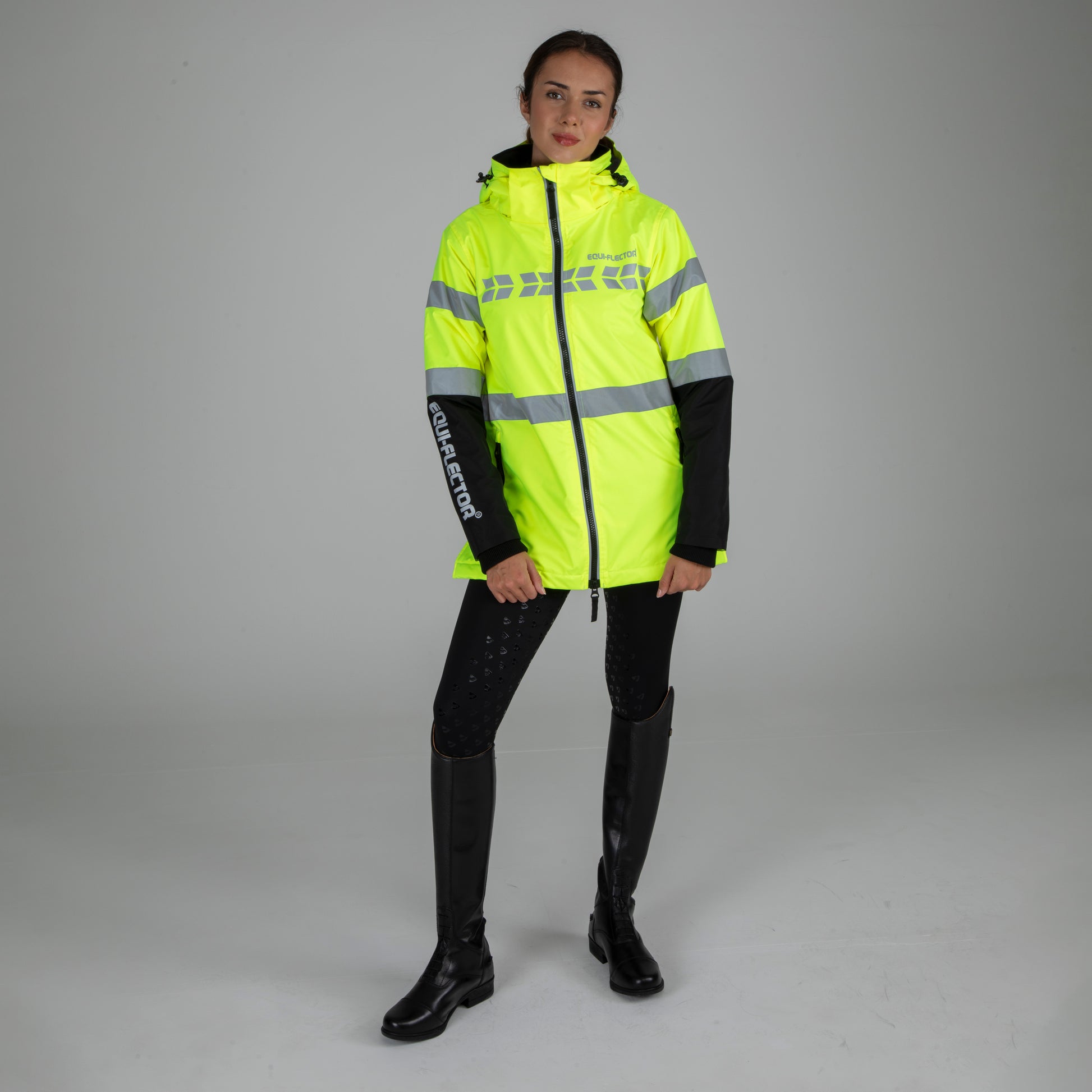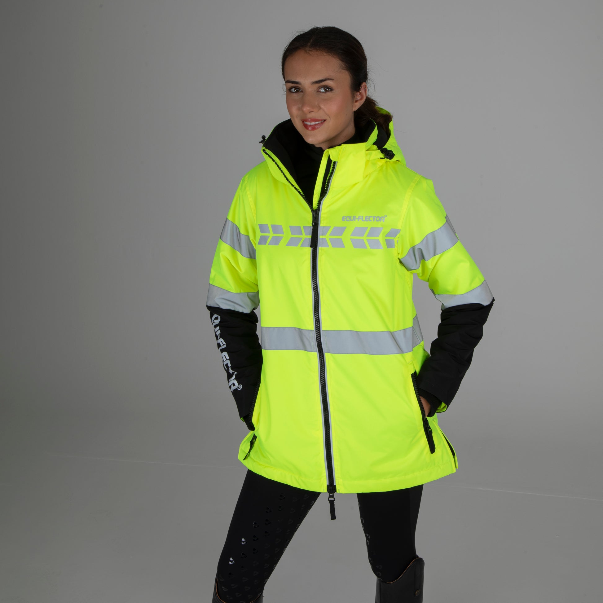 Keeping you visible in all light conditions, the EQUI-FLECTOR® jacket is the ideal cover up for the cold and wet, in or out of the saddle. Together with the bright colour, bold graphics are visible at distance, and 360° reflective prints offer visibility in darker conditions. The waterproof and breathable outer is hardwearing to resist wear and tear. Deep pile fleece lining to the jacket, hood and pockets provide cosy warmth. Valuables stay safe in one inner and two outer zip pockets. The lower half of the arm is left dark in colour to avoid soil marks. Rider enhanced benefits: hem opening zip, rear rider vents for seated comfort, in-saddle weather protection, a removable hood for rider preference. Available in adult and child sizes. Practical features: longer length, fully fleece lined, zip off hood with adjusters, two-way front zip, chin guard, inner wrist cuffs, zipped rear rider vent, two outer zip pockets, inner zip pocket, easy grip zipper pulls, highline neck, fabric hanging loop, taped seams, 360° reflective prints, EQUI-FLECTOR® prints. Waterproof to 10,000mm, Breathable to 5000g/m2. Durable Waterproof Repellent (DWR) prevents saturation - water beads on the fabric and runs off. Made with Bionic-Finish® Eco: fluorine-free water repellent technology. Fabric tested for high visibility to EN ISO 20471: 2013+A1:2016. Part of the EQUI-FLECTOR® range of bright, reflective garments for horse and rider.