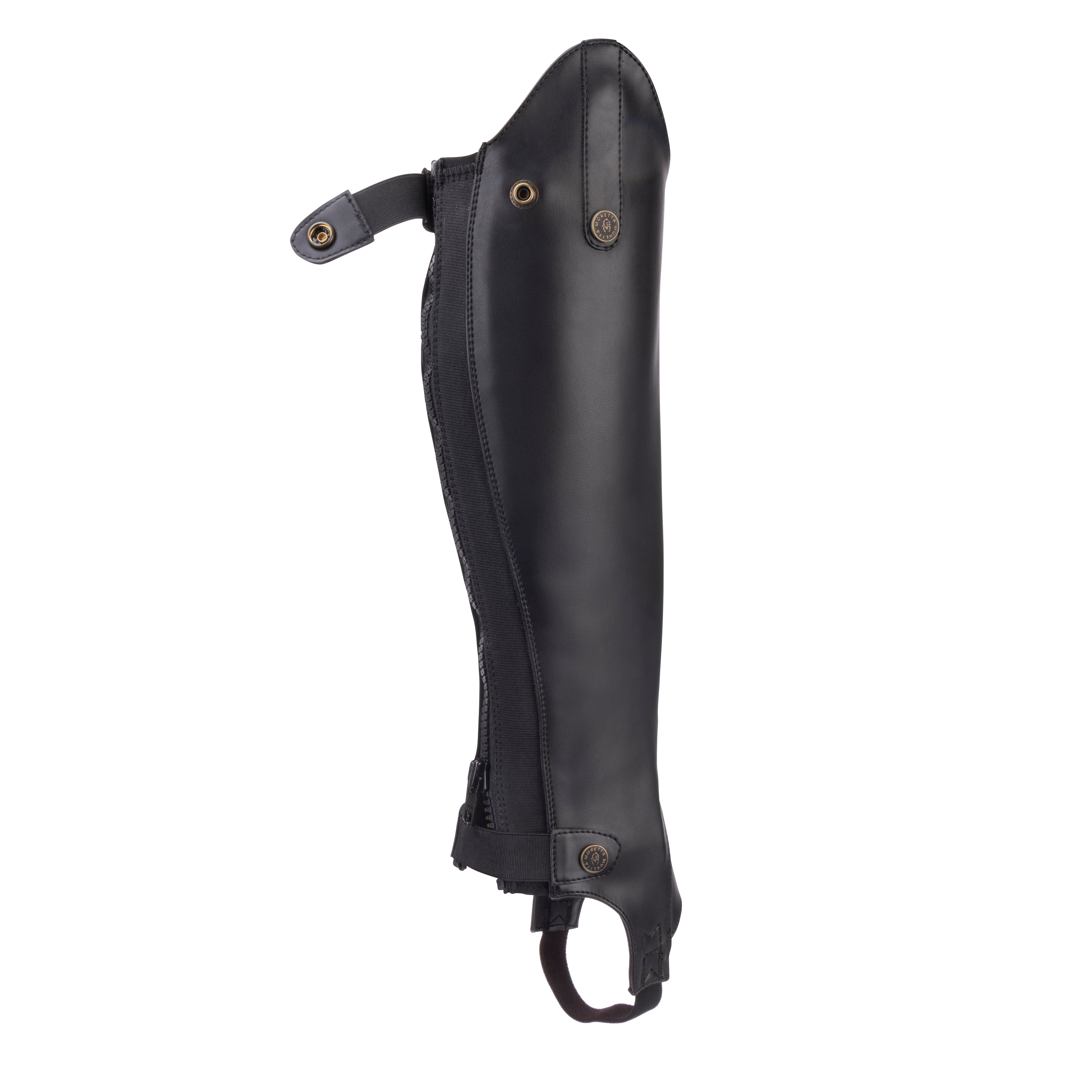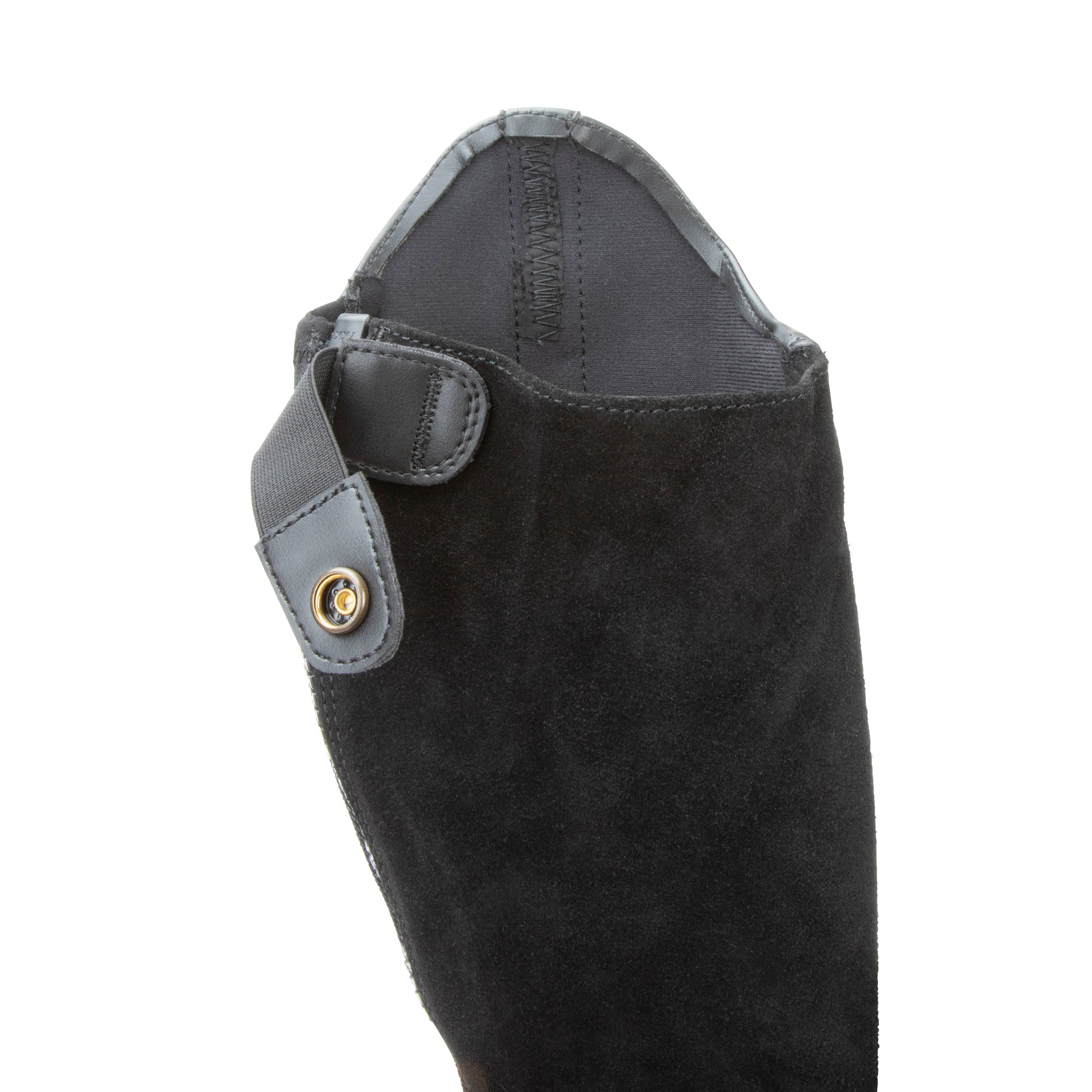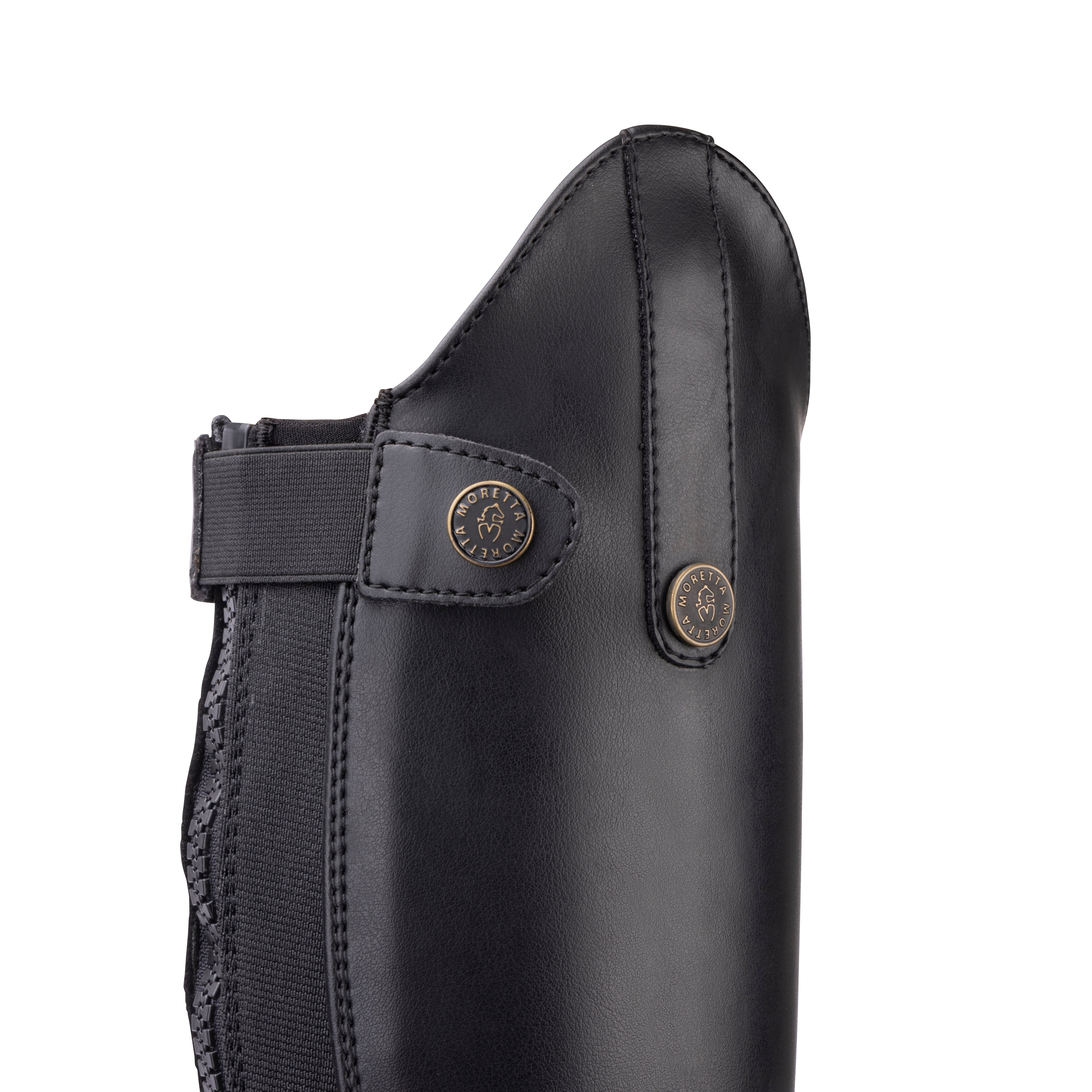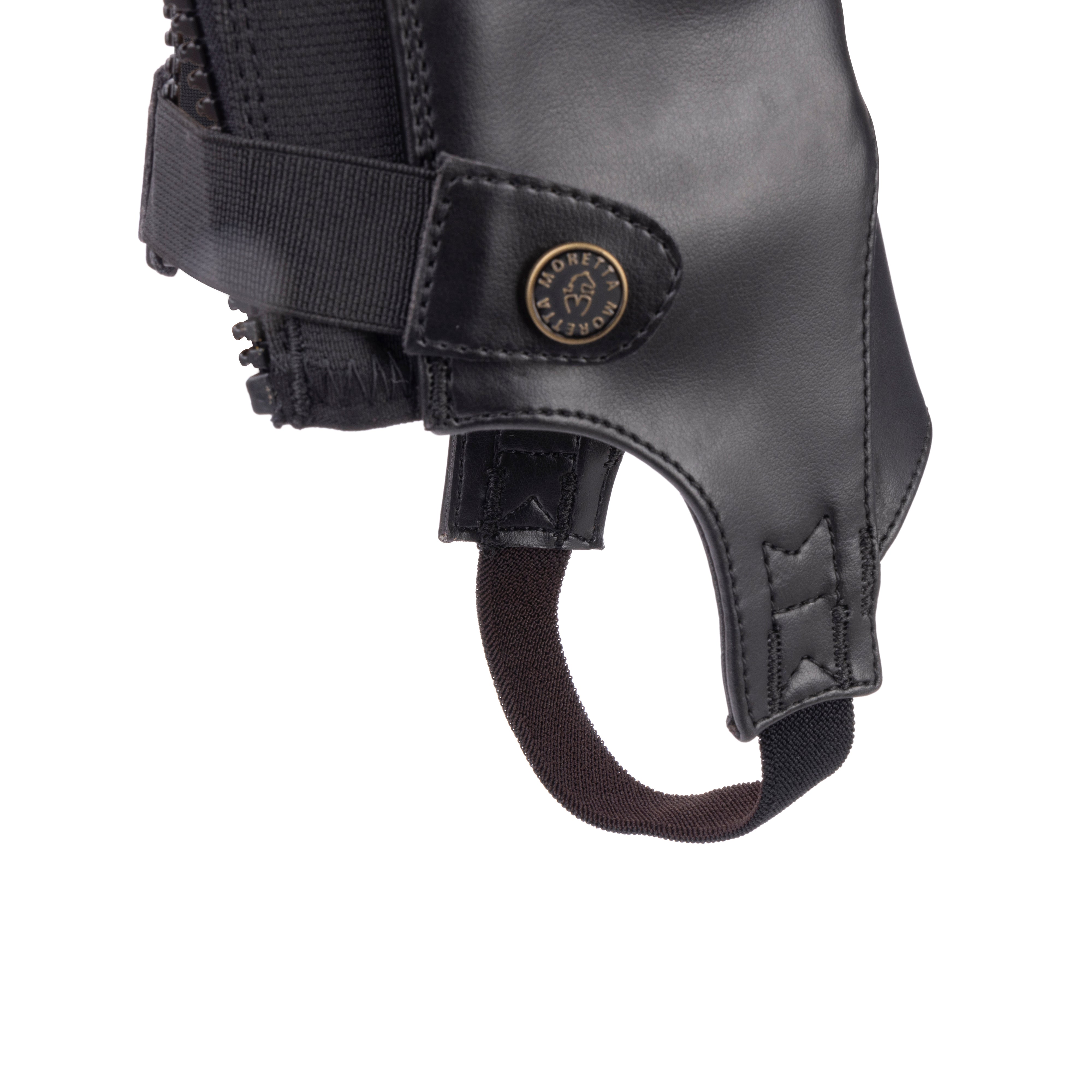 The show-smart Moretta synthetic gaiters are made in faux leather with genuine suede inserts at the inner calves. Key features: UltraFit leg panel. Dressage cut tops. Inner calf patches. Full length zips. Elastic foot stirrups. Stretch zip tidy straps.