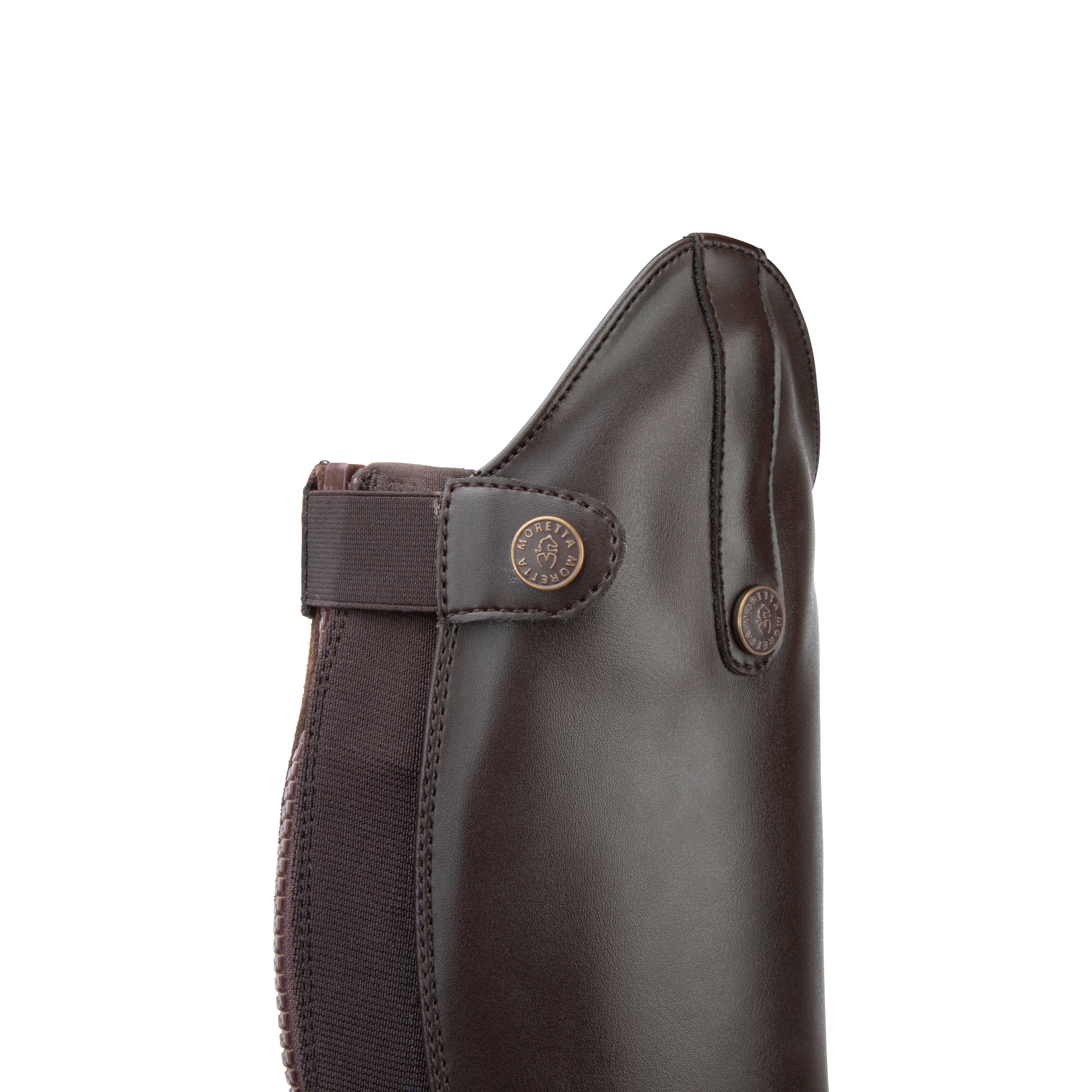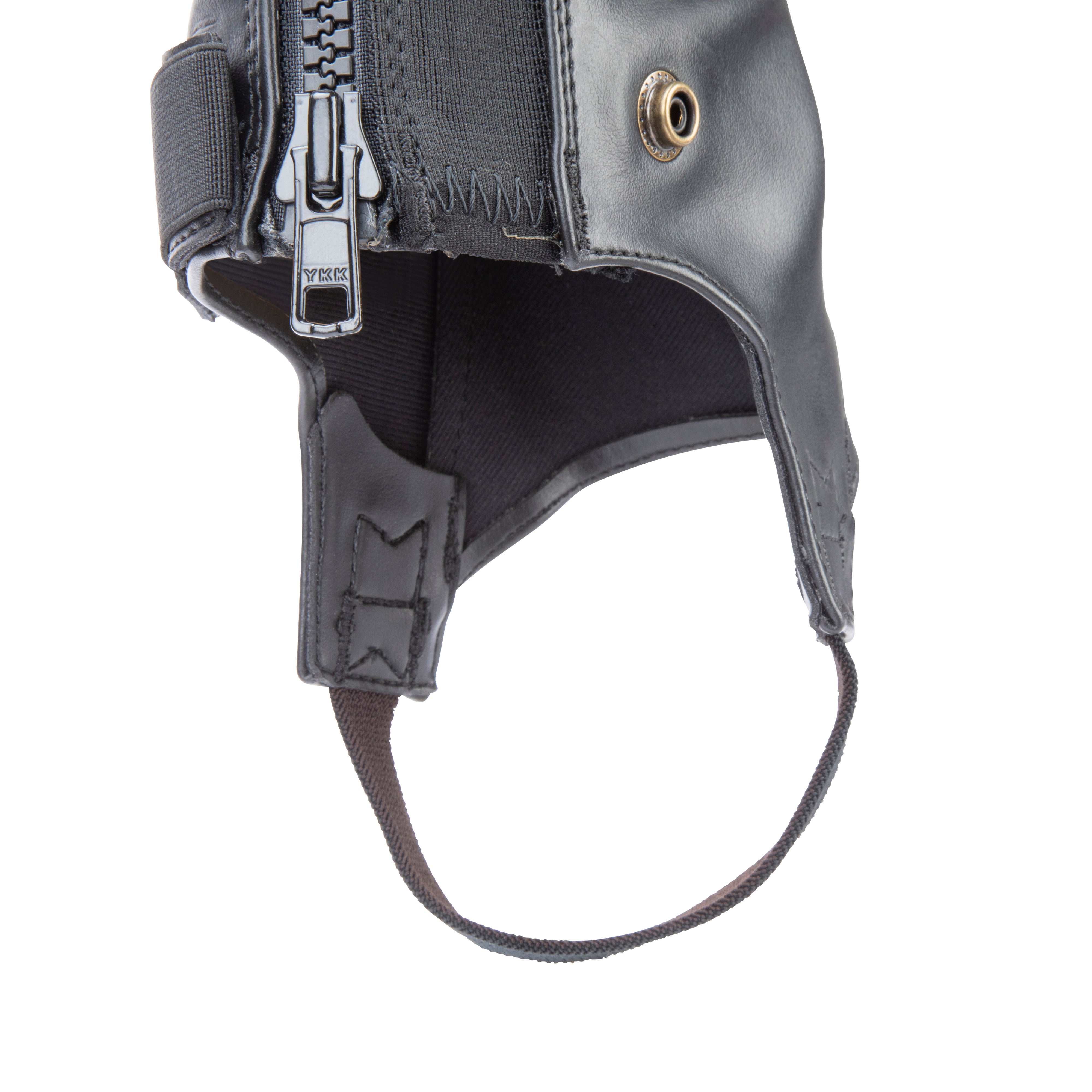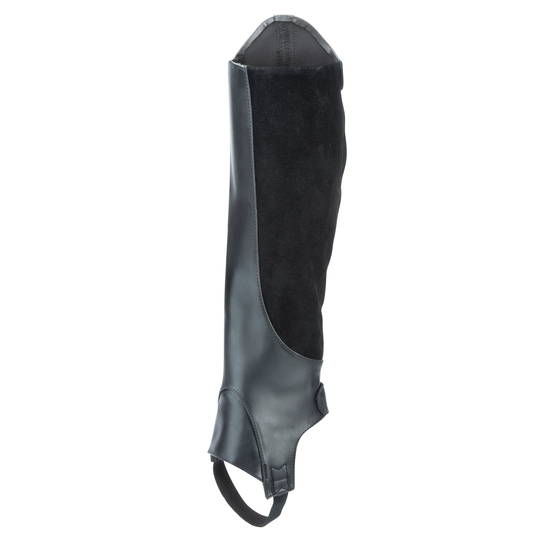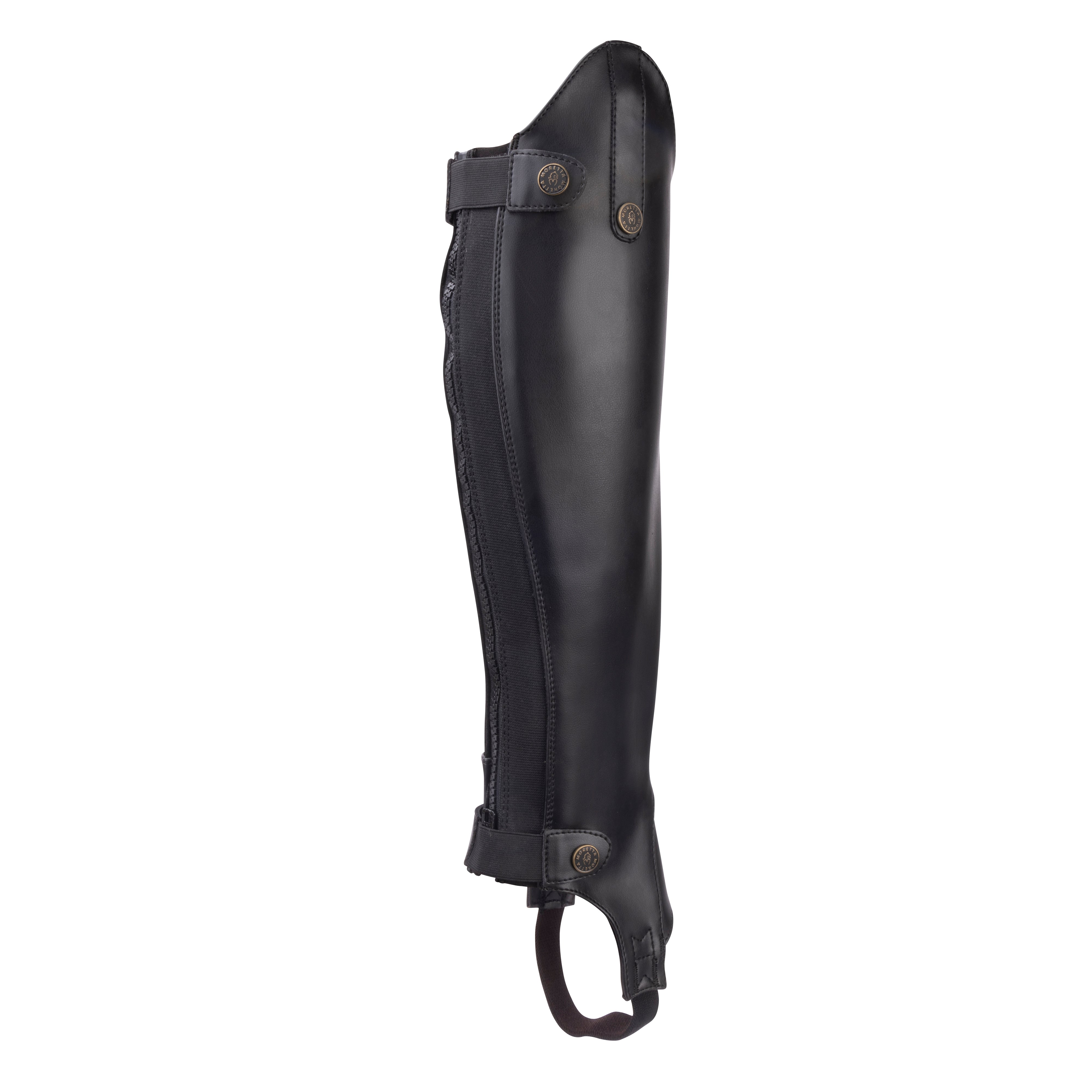 The show-smart Moretta synthetic gaiters are made in faux leather with genuine suede inserts at the inner calves. Key features: UltraFit leg panel. Dressage cut tops. Inner calf patches. Full length zips. Elastic foot stirrups. Stretch zip tidy straps.